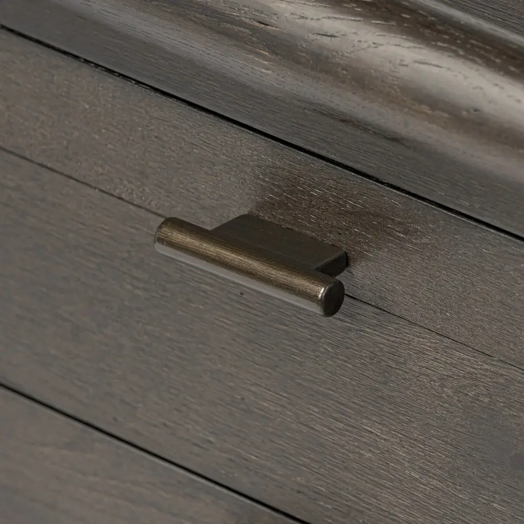Traditional, reimagined. Made from smoked black oak, a three-drawer nightstand inspired by spindle design brings bonus storage to the bedside.