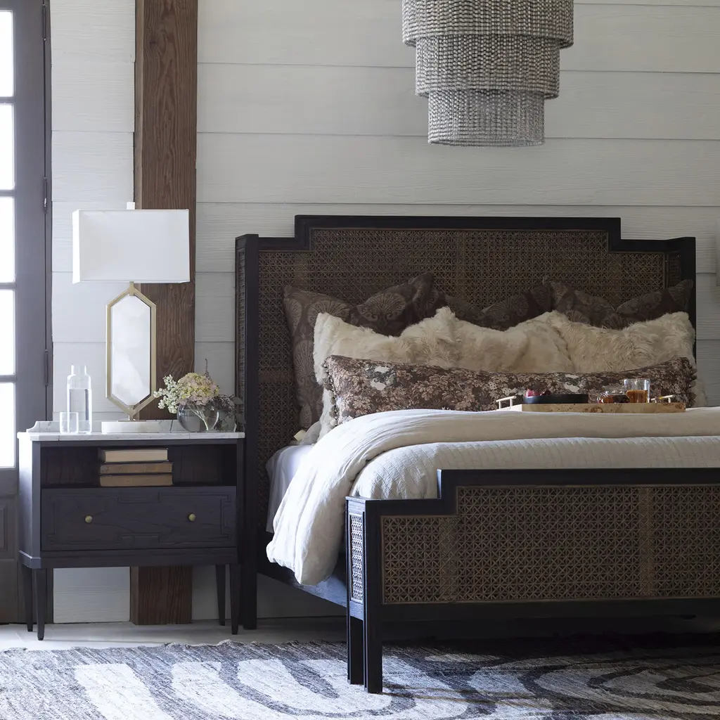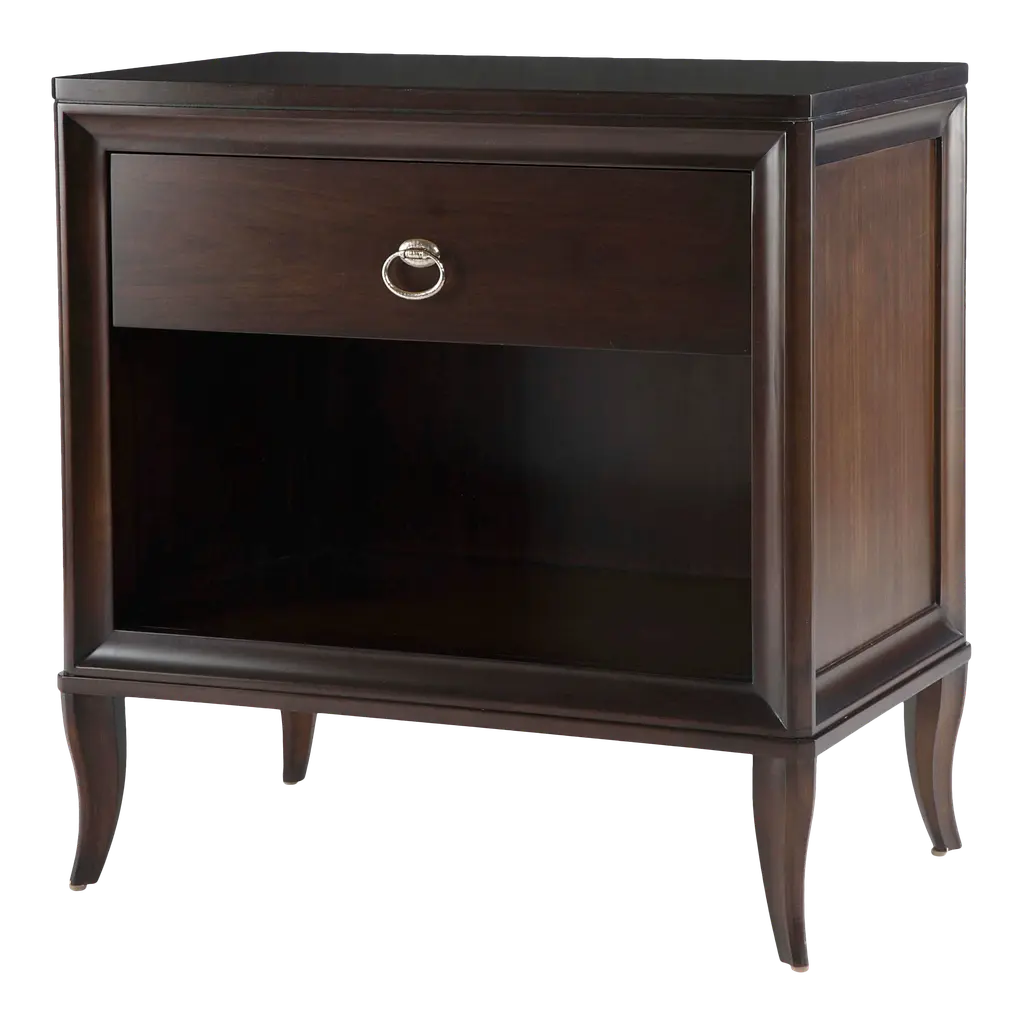 This smaller scale nightstand features Gustavian-inspired molding with elegant angles and thin legs. Historically, the raised backing served as a decoration and a block to prevent objects from sliding to the back. Available in two finishes, a warm Cerused natural brown finish and a more modern Cerused Brown version with a marble top. The marble features natural characteristics, differences in each piece of stone are to be expected. Features undermount soft-close drawer glides.