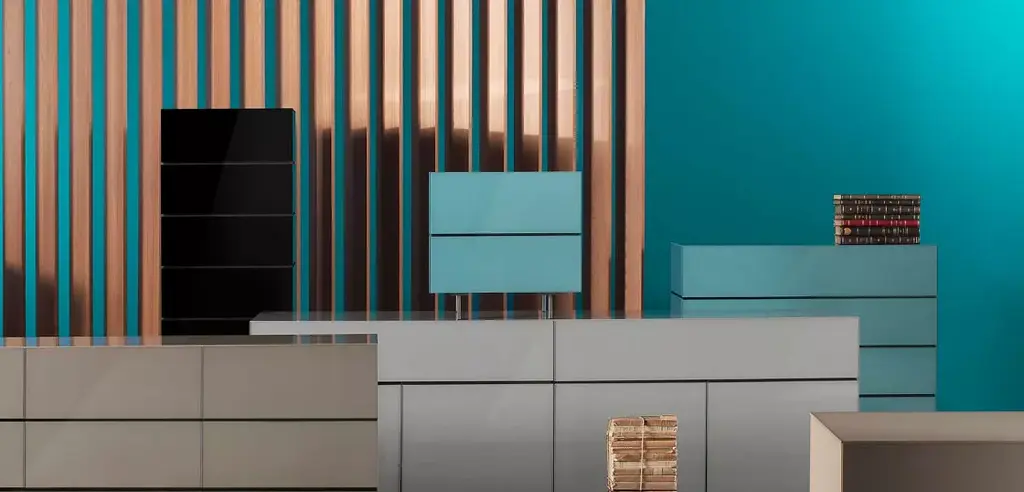 Globo is a complete collection of storage furniture pieces that are both graphic and functional. The entire collection features the same horizontal rhythm on the facades that is highlighted by deep partitions between the openings. The facades can be in coloured lacquered glass, coloured mirror, wood veneer, or a combination of these finishes.
