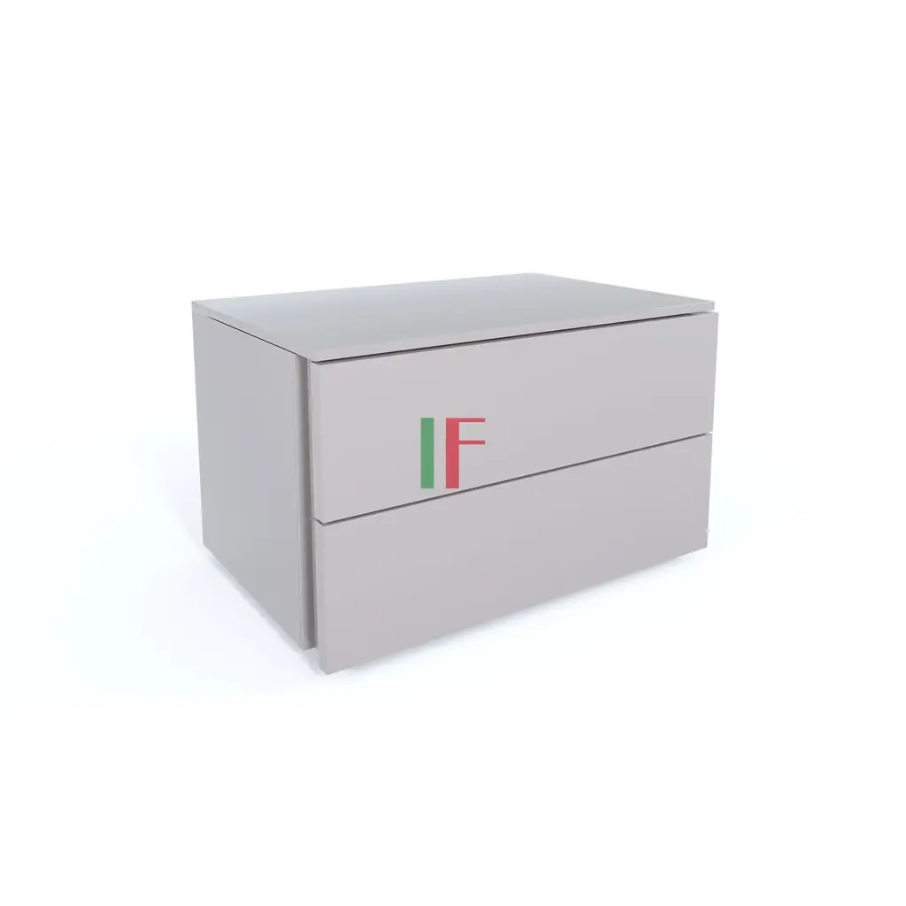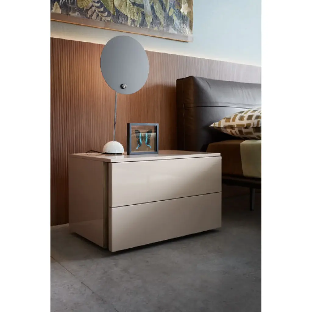 The Glossy Grooved Nightstand by Lema is a floor container system comprised of drawers, night tables and seven drawer dressers, all with great capacity, that become part of the bedroom through their discreet charm. Rigorous geometric purity of essential and compact volumes, monoliths of material and color marked by the shape of the grooved profile of the handle, at times lateral and at others central. The attention given to proportion, the slight differences in alignment between the parts and the material palette enhanced by the top in wood, matt or glossy lacquered, or natural stone, characterize a group of understated and elegant products, easy to combine with diverse styles of beds.