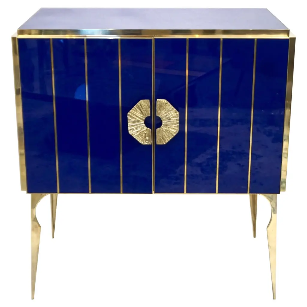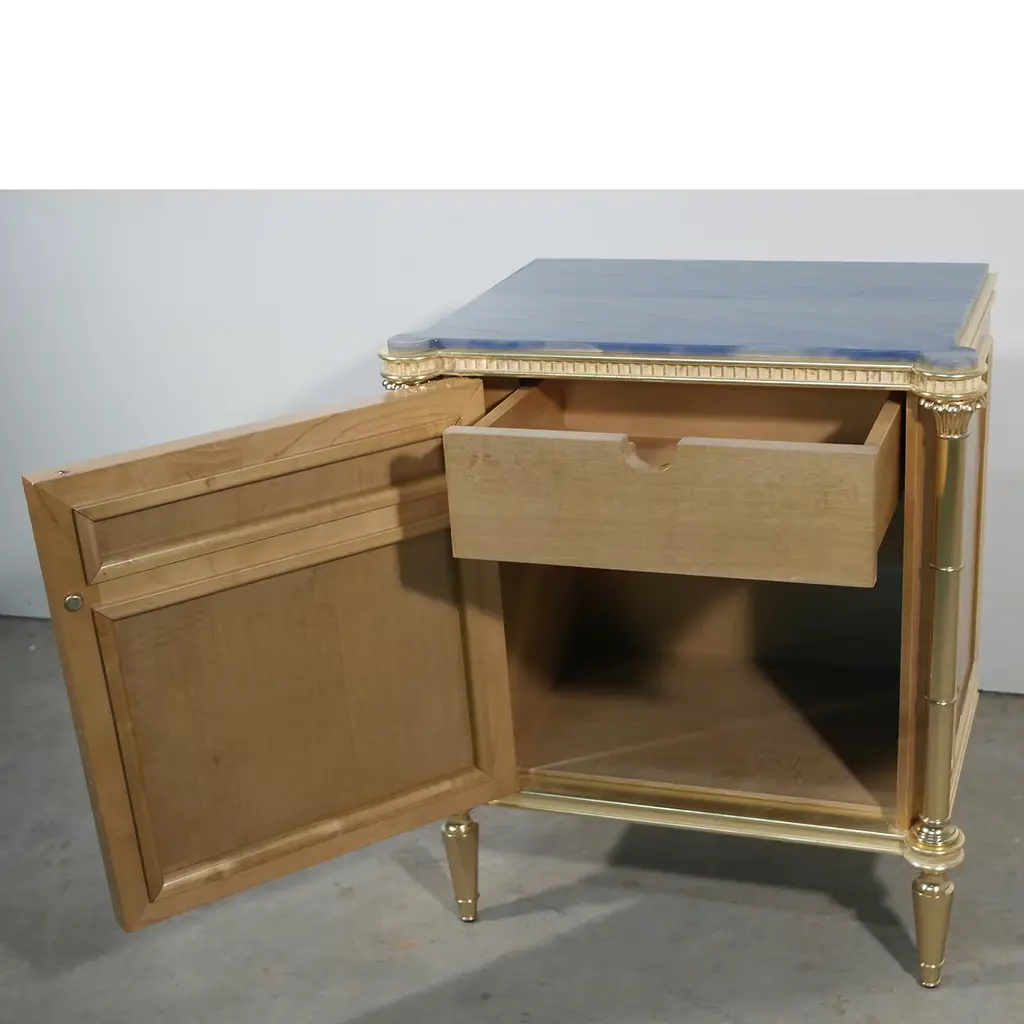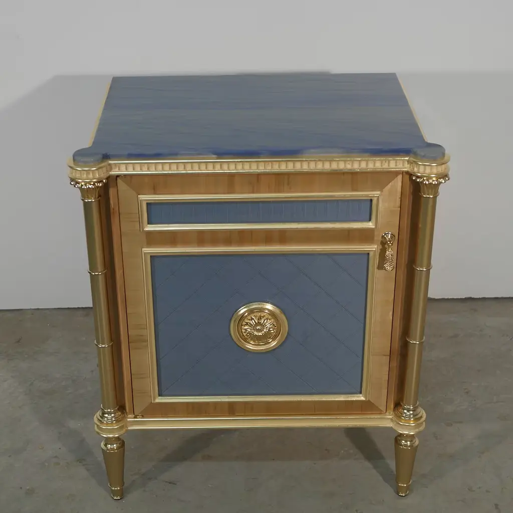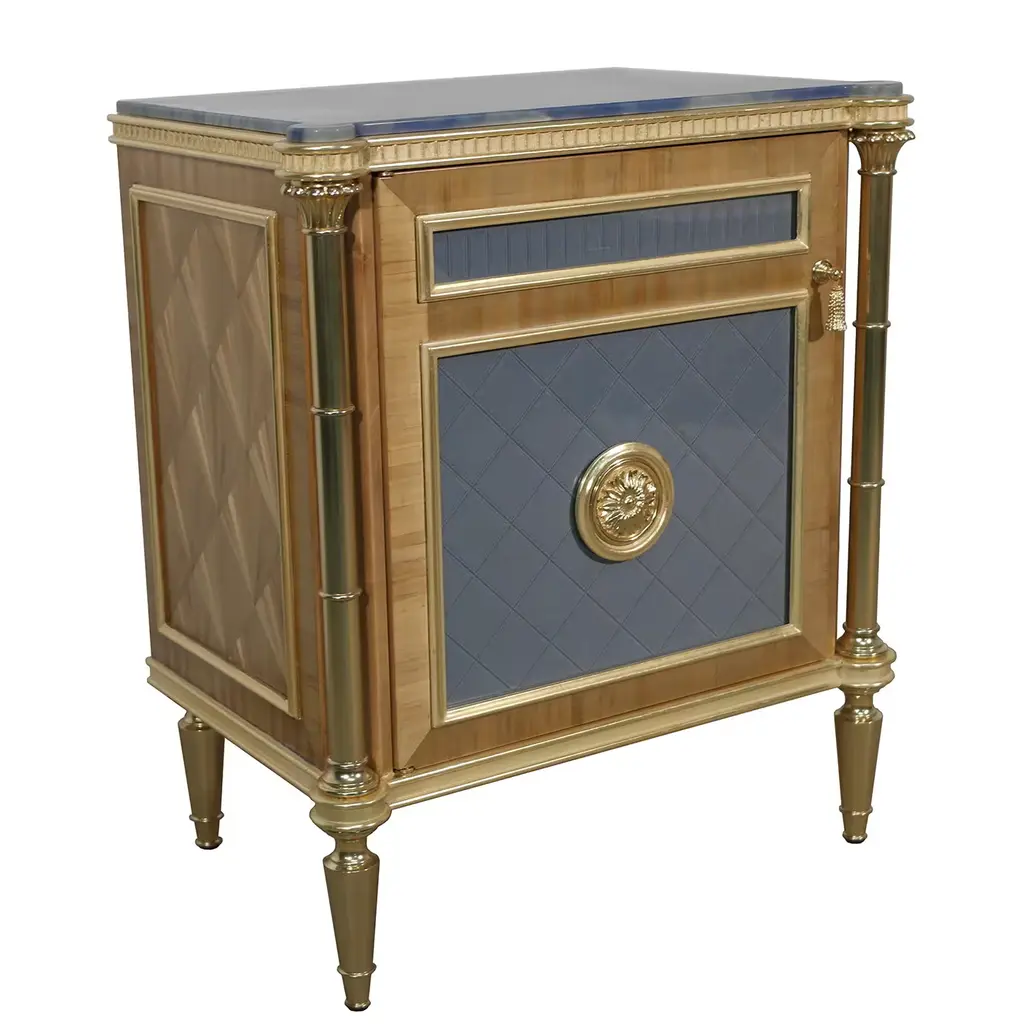 This one-door wooden bedside table boasts a glossy finish and natural straw veneer accents. Complete with one inside drawer, the design is enhanced with brass details, flaunting a 22K gold-plated finish. The 22k Gold leaf accents feature a light white patina treatment. The front is upholstered in natural silk, topped with glass sheets with a decorative rhombus pattern. Finished with an Azul Macaubas marble top.