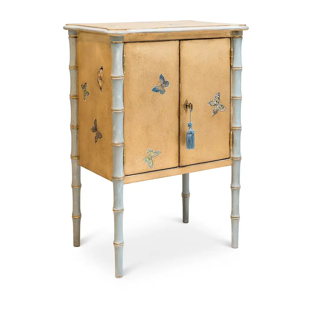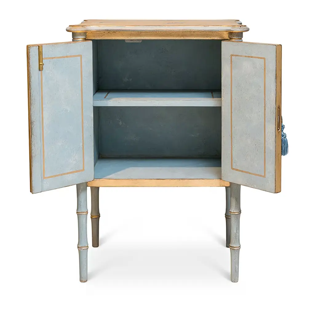 Introducing the Lombardia Bamboo nightstand, a whimsical masterpiece inspired by the kaleidoscope of colors found in a group of butterflies. Crafted with gold leaf accents and blue-grey bamboo, this nightstand adds a touch of enchantment to your bedroom. It features an inside shelf and can be customized with drawers. Choose from a range of sizes and designs to create a perfect piece. Please, ask the Concierge service for further information.