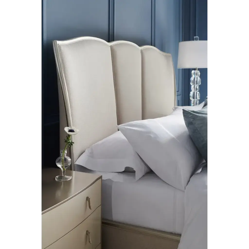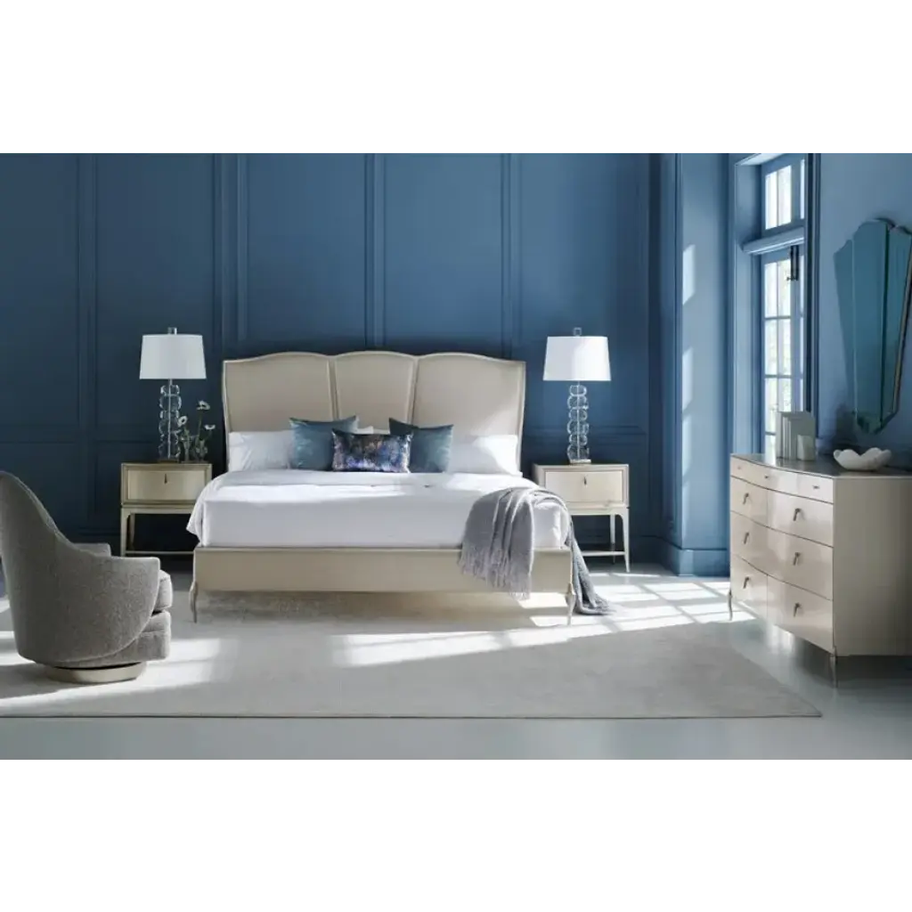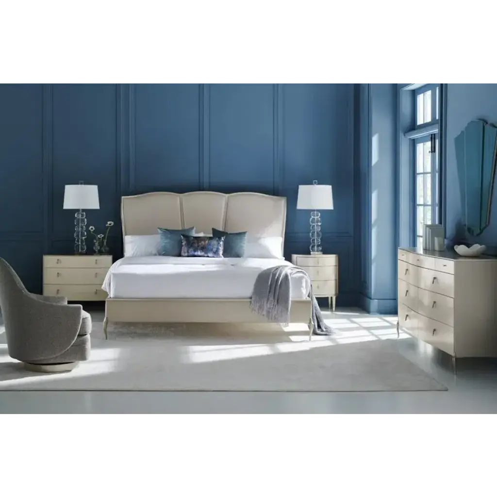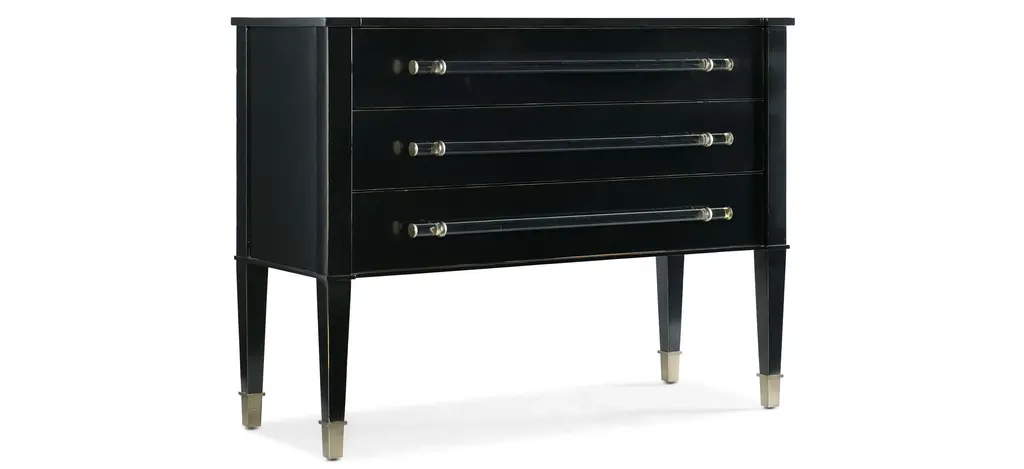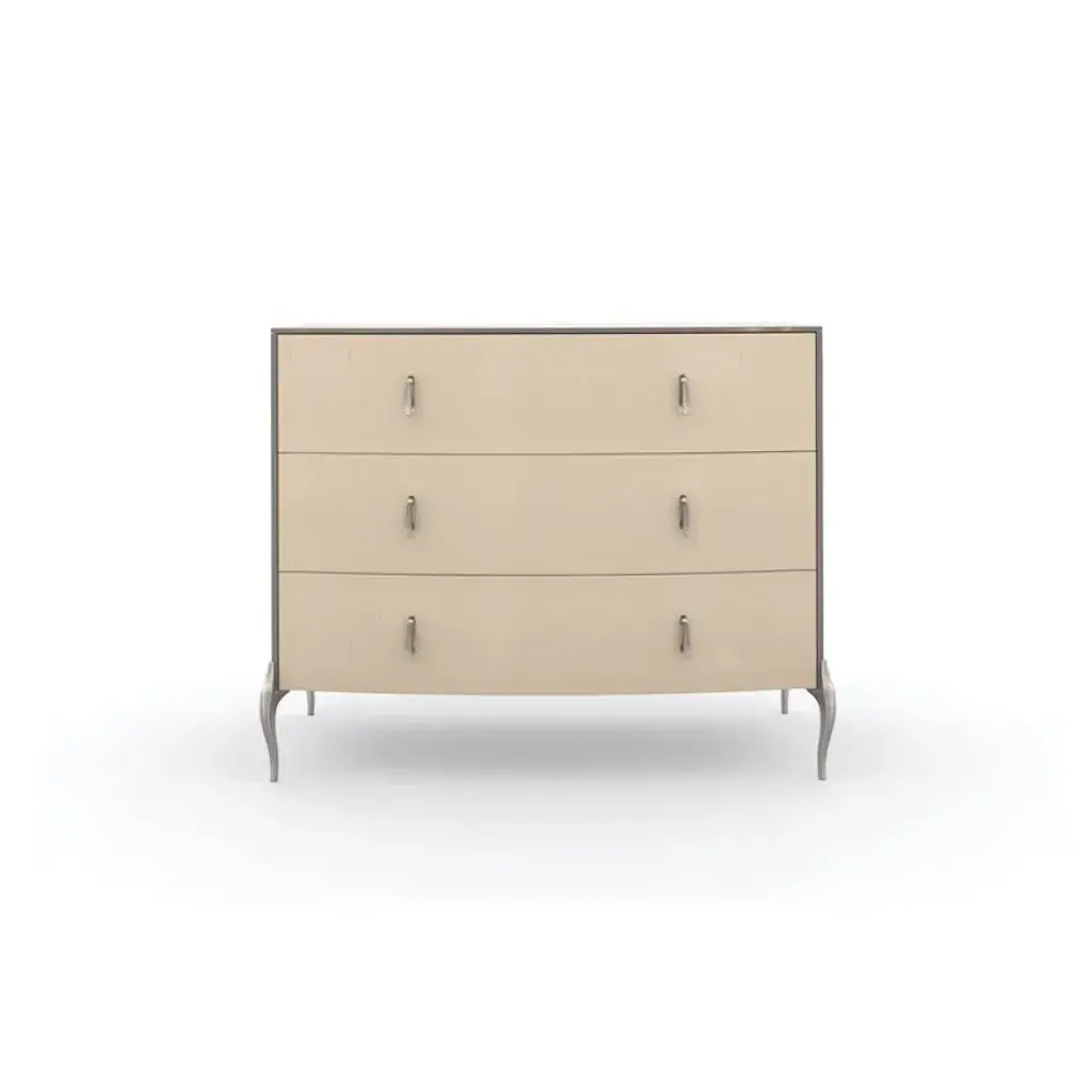 Flowing lines and soft, silvery paint make an elegant first impression with this three-drawer nightstand. Introducing a fresh perspective on light wood finishes, drawer fronts in Vanilla Cream bring to light the decorative character of figured sycamore. Elongated drawer pulls, inspired by an Art Deco jewelry pendant with a faux stone center, add a touch of grace. Ornate metal legs balance the subtly curved top and case, creating cool shimmer in Soft Silver Paint.