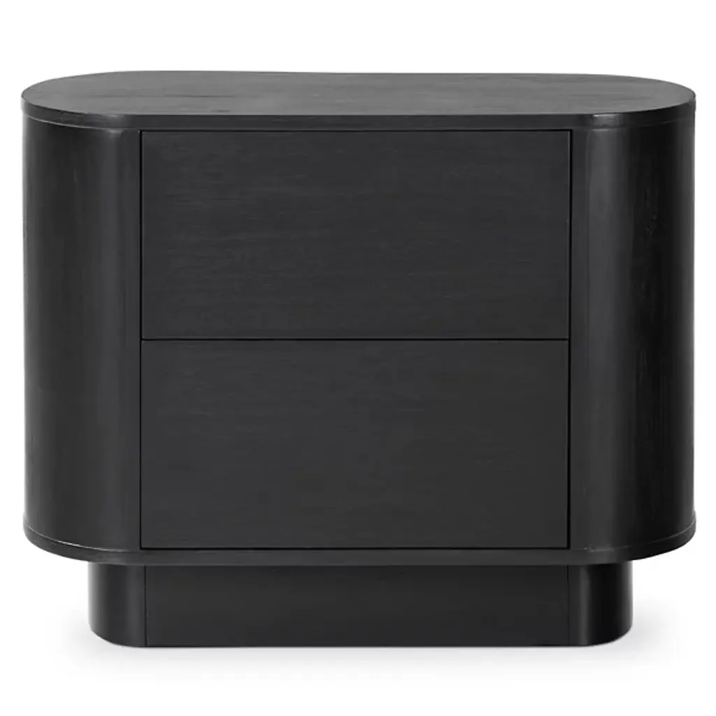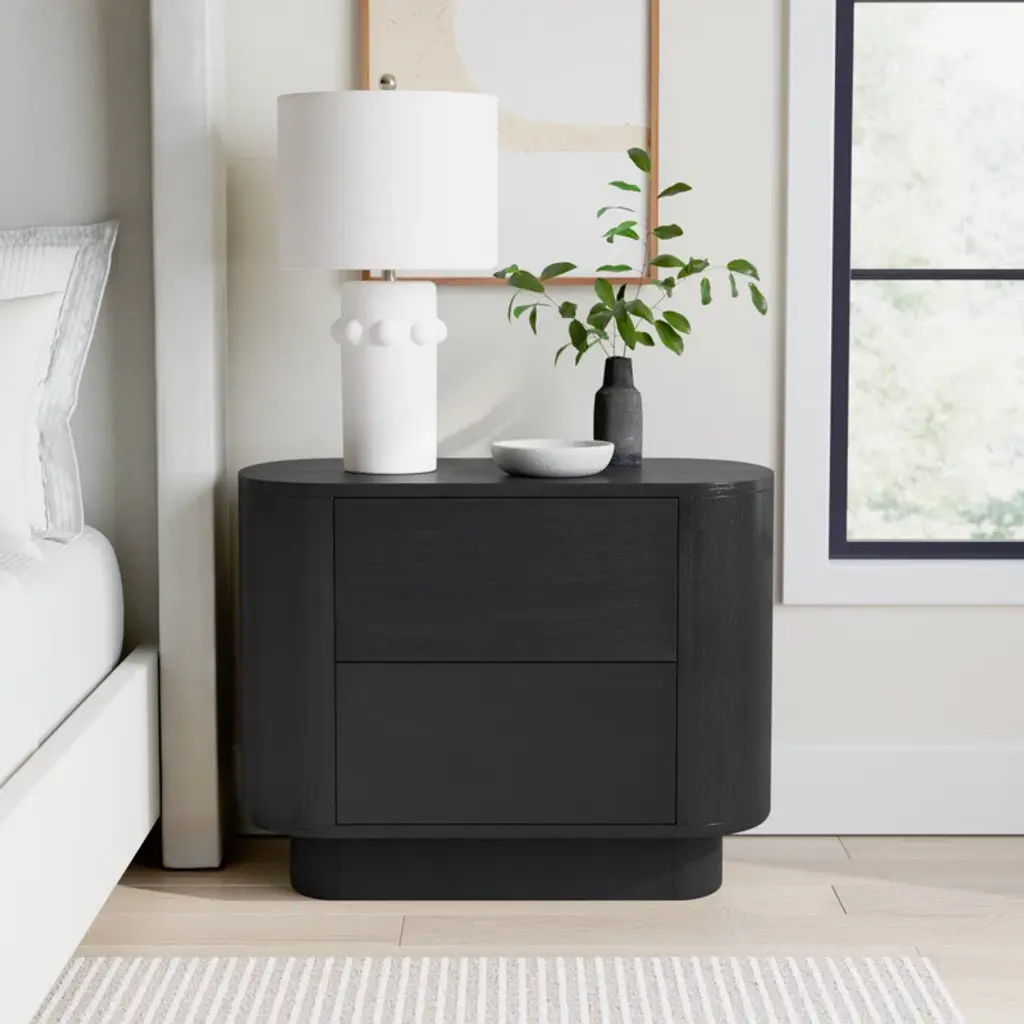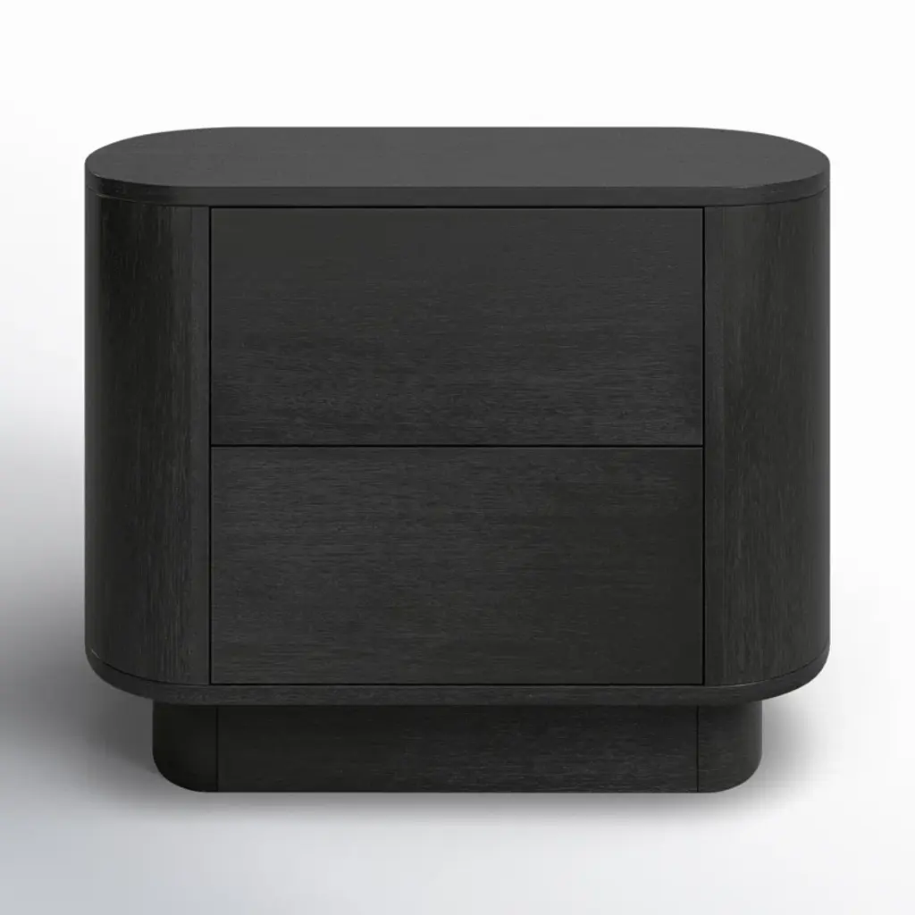 Complete your bedroom update with this nightstand, a versatile piece that helps to build your signature style. It's crafted from acacia wood with a seasoned black finish that offers a timeless, neutral accent. The curved pedestal base and rounded edges create a graceful silhouette, while two spacious drawers provide ample storage for your nightly essentials. Consider a pair for either side of your bed for a cohesive look.
