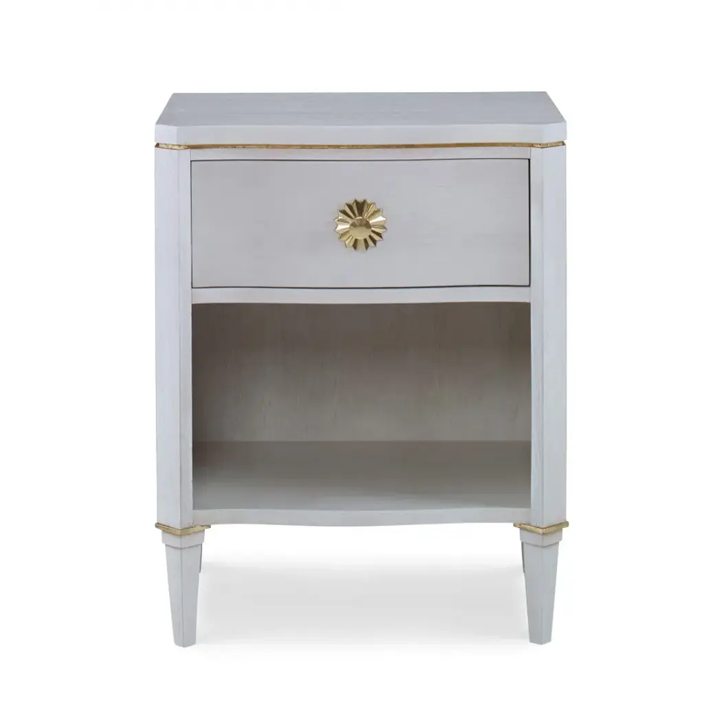 Crafted from Mahogany solids and veneers, this one drawer nightstand includes a brass sunburst pull. Finished in dove white with antique gold leaf accents.