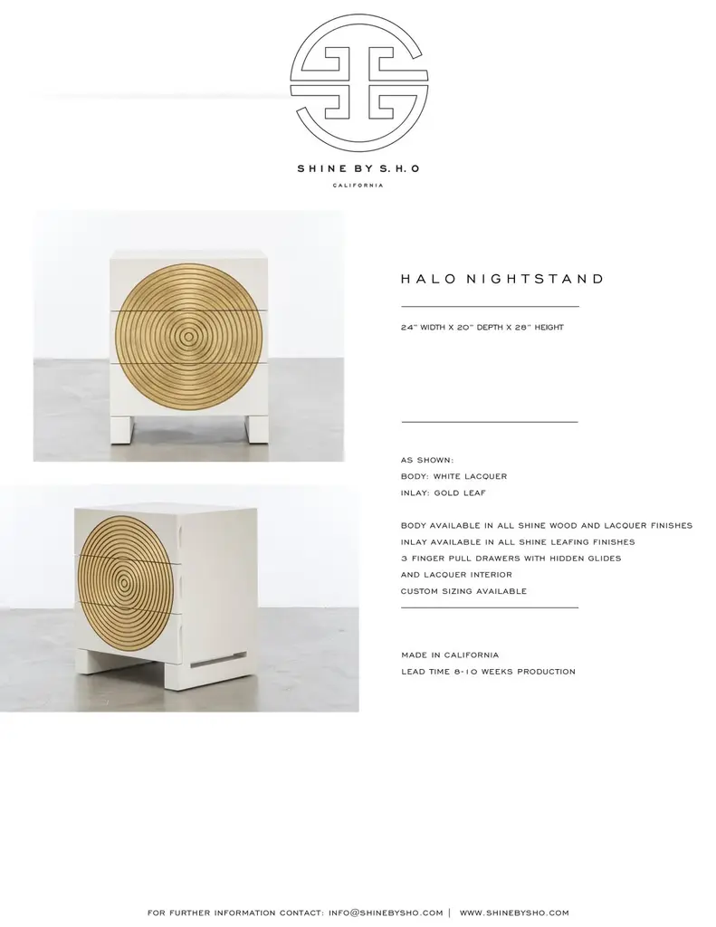 HALO NIGHTSTAND - Modern Nightstand with Circle Design with Gold Leaf DetailThe Halo nightstand is a stunning and modern piece of furniture that exudes sophistication and luxury. It features a lacquer body with a unique gold leaf inlay halo detail that adds a touch of glamour and elegance to the overall design. The halo detail creates a beautiful focal point that will catch the eye and make a statement in any bedroom.The nightstand comes with three soft-close drawers that provide ample storage space for your nighttime essentials. The drawers are designed with hidden glides to ensure smooth and quiet operation, and the soft-close feature helps to prevent slamming and damage to the furniture.Fully custom and made to order in California, the Halo nightstand can be tailored to your specific needs and style preferences. You can choose from a range of finishes and sizes to create the perfect look for your bedroom.As shown in lacquer, the Halo nightstand is priced at $9,320, making it a premium investment in your bedroom decor. However, the high-quality craftsmanship and attention to detail make it a worthy investment that will last for years to come.Overall, the Halo nightstand is a luxurious and functional addition to any bedroom. Its modern design and unique halo detail make it a standout piece that will add a touch of glamour and sophistication to your space.
