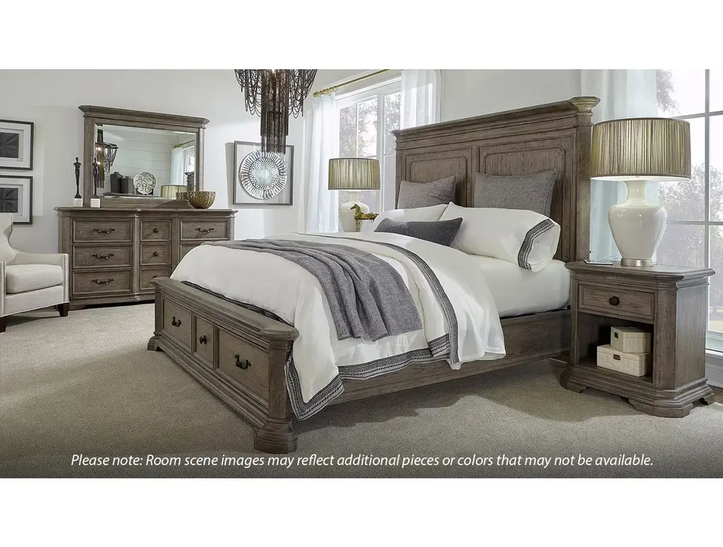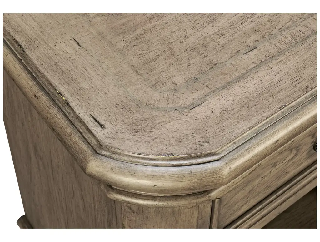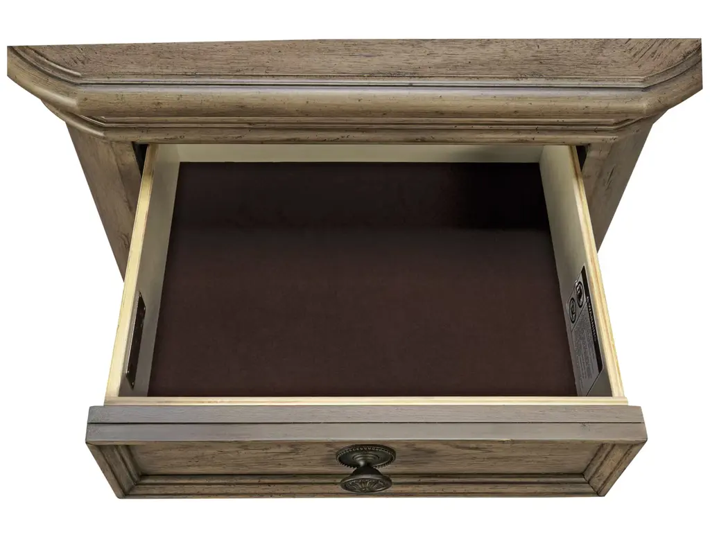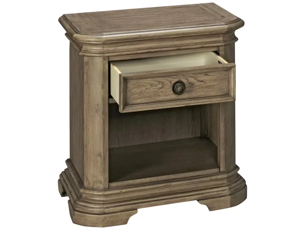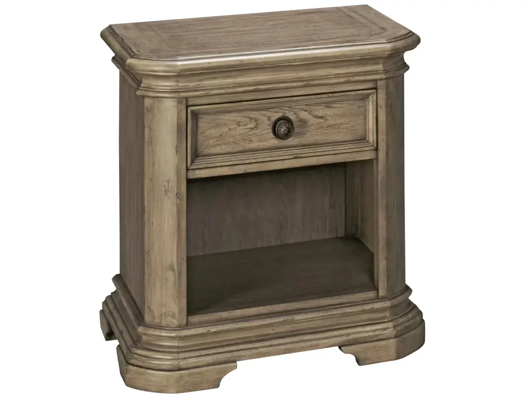 Bring style and storage to your bedroom with this Aspen Hamilton 1 Drawer Nightstand. It features one felt-lined English dovetail drawer with an ornate metal knob, and one open shelf below for additional storage or display. It stands on bracket feet, and has a smooth top with molded edges that's great for a lamp or displaying items. The briarsmoke finish of this traditional-style bedroom furniture enhances its overall look.