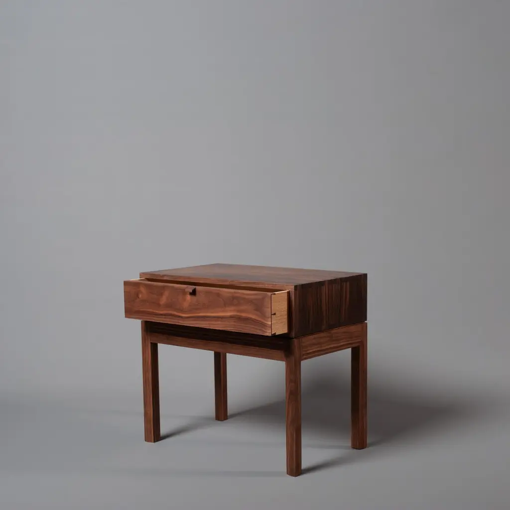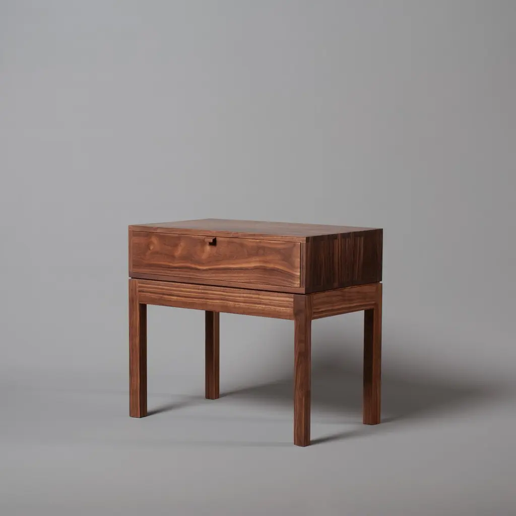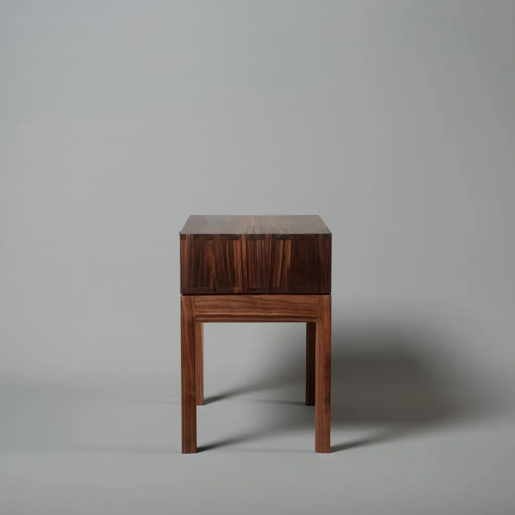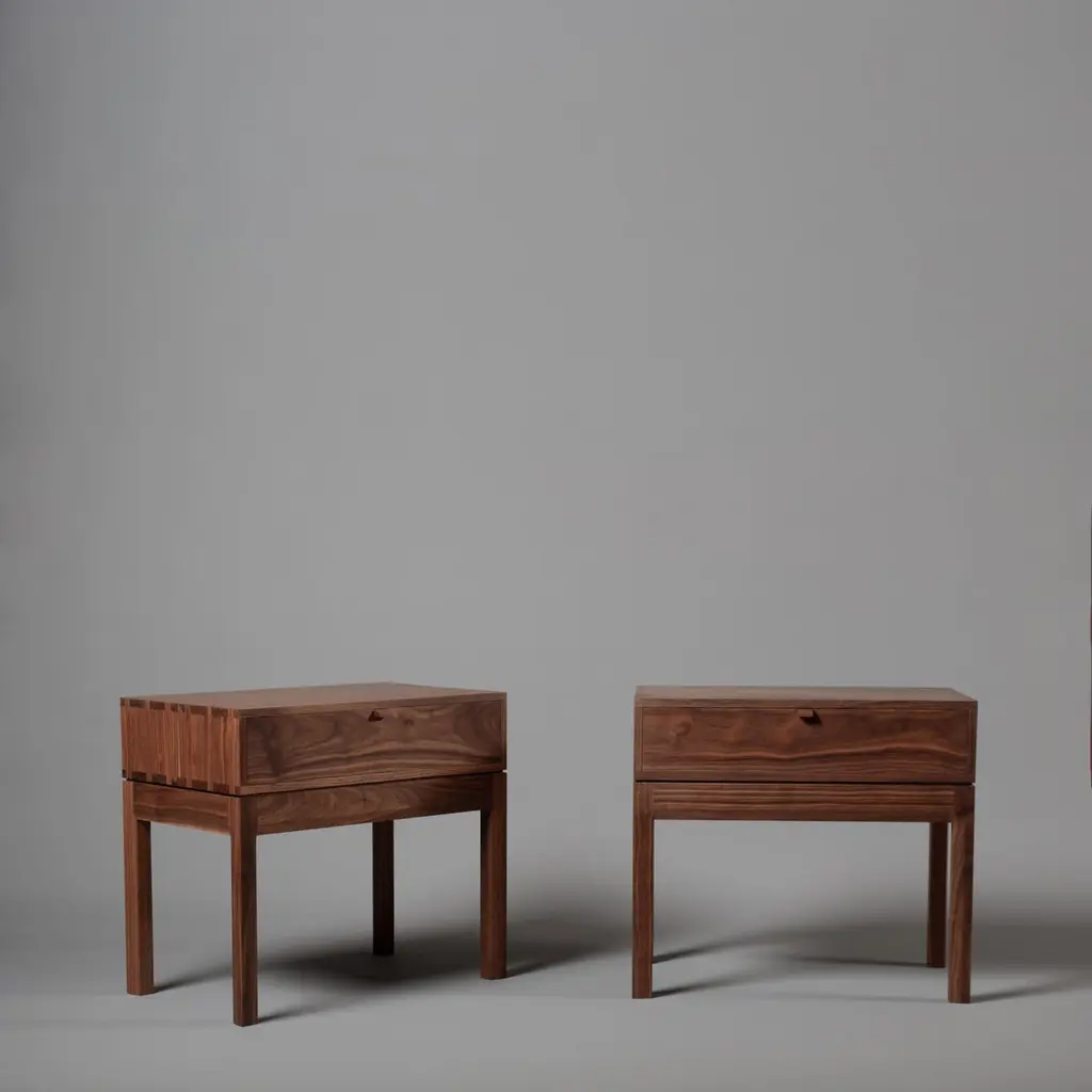 Handcrafted American black walnut nightstands or end tables in a modernist design. These are constructed from the finest American black walnut with the inner dovetailed jointed traditional drawer carcass in prime English Oak. The main upper box is detailed with exposed hand-cut dovetail jointing and contains one drawer. A light curve design is cut into and around the legs and follows along the facia. Price per piece.Designed in London and handmade by our highly experienced craftspeople in England. Hand finished in durable oils. This is a contemporary modernist design with Scandinavian influences utilising traditional English furniture craftsmanship and fine timbers.These can be made to your custom dimensions or bespoke design if required.Also available in total Prime English oak - examples of which are in the final images on the listing.Price per single item.We design bold and distinctive pieces of furniture – our main objective is combining the design alongside the natural beauty and properties of the raw materials.These timbers and materials are very carefully chosen for each specific design - maintaining our focus on the benefits, visual impact and strengths of what we use. Our regular use of English Quartersawn Oak is one case in point. It has been the beloved timber of fine furniture makers across the world for centuries. It is costly to produce but gives huge benefits and rewards such as its striking medullary rays and superb stability qualities. By utilising these wonderful and naturally occurring features with our contemporary designs we aim to continue creating some very distinct, tactile and idiosyncratic pieces.These are all completely handmade, in very small numbers, by our skilled craftspeople in England.