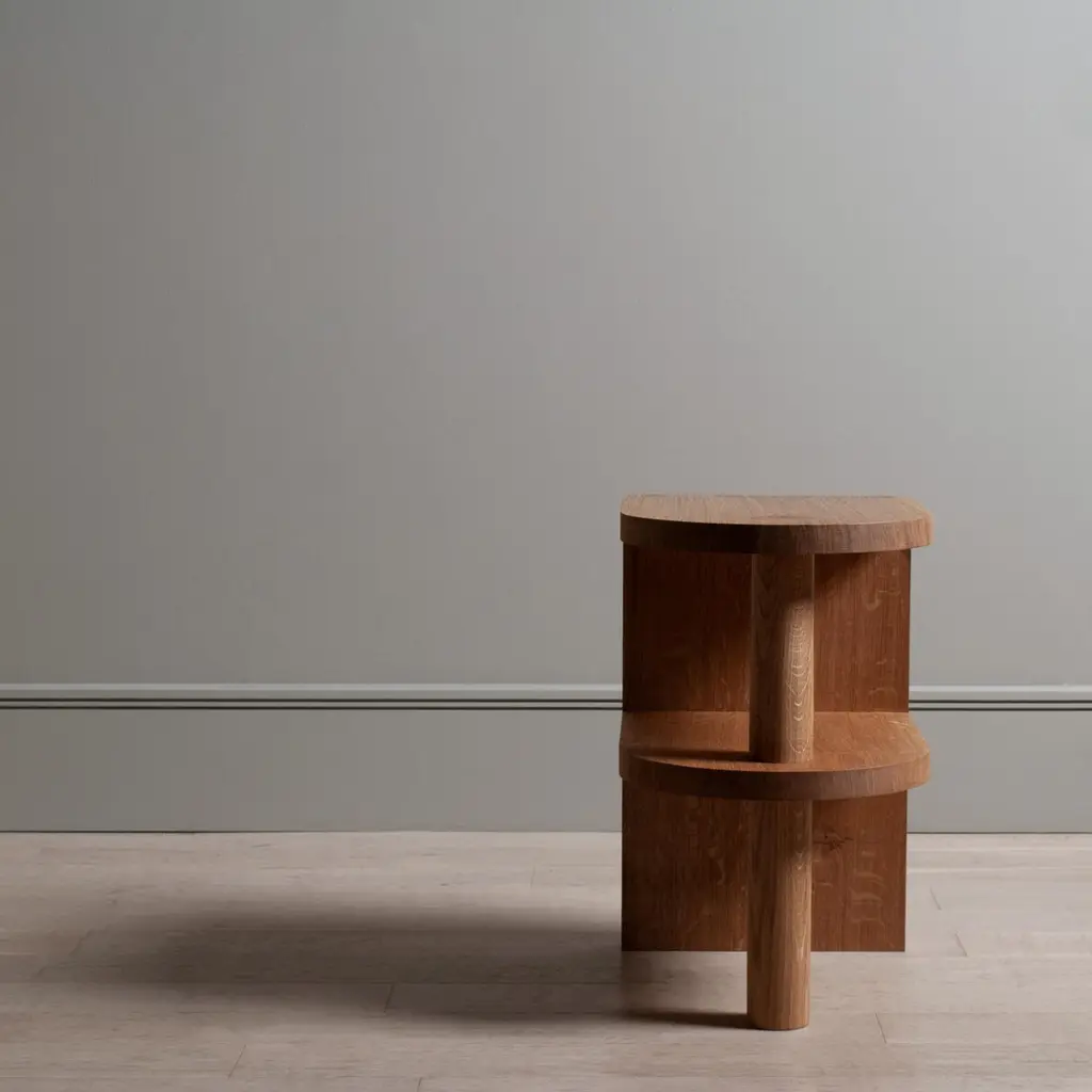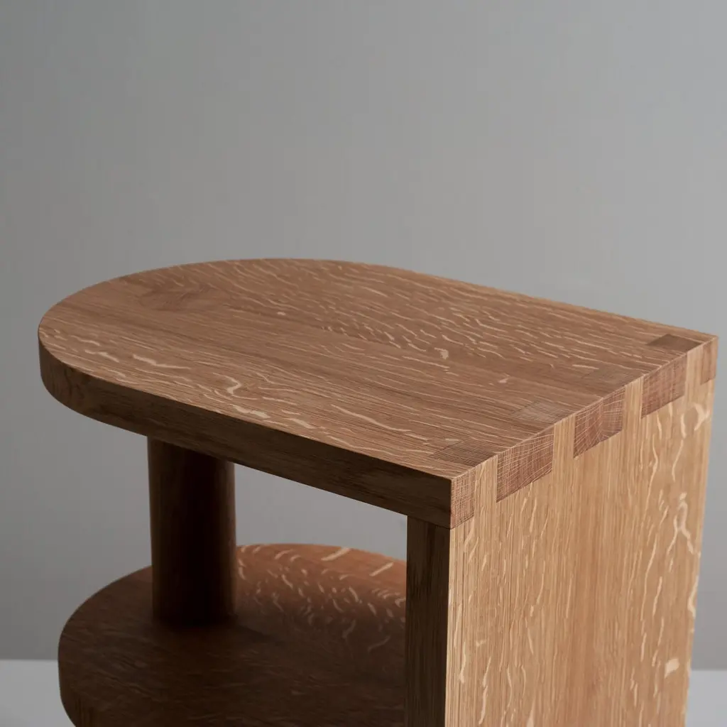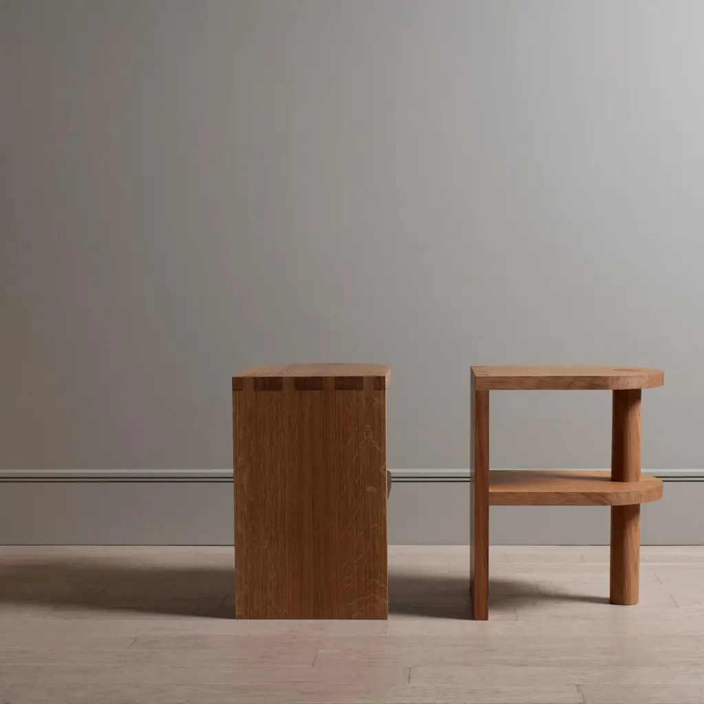 An adapted version of our architectural oak pillar nightstands or end tables. Designed and totally handcrafted in England using traditional woodwork techniques with the most beautiful and finest English quarter-sawn oak. Hand-cut large dovetail jointing with turned oak upright pillar piercing through the sections cut flush to the surface. A design drawing influences from very early 20th century European Modernist architecture and later Post-Modern aesthetics. These are unique multi functioning pieces and are primarily intended for use as nightstands. The top surface has a hidden supporting collar within the surface and can take significant weight. These are substantial, bold and striking pieces of completely handmade furniture, built to last. Finished in durable natural oils.Alternative American Black Walnut versions are available in our other listings andcustom dimensions are available on request.These pieces are completely bench-made by hand in England and bear the telltale and tactile signs of the craftspersons work. We design bold and distinctive pieces of furniture – our main objective is combining the design alongside the natural beauty and properties of the raw materials.These timbers and materials are very carefully chosen for each specific design - maintaining our focus on the benefits, visual impact and strengths of what we use. Our regular use of English Quartersawn Oak is one case in point. It has been the beloved timber of fine furniture makers across the world for centuries. It is costly to produce but gives huge benefits and rewards such as its striking medullary rays and superb stability qualities. By utilising these wonderful and naturally occurring features with our contemporary designs we aim to continue creating some very distinct, tactile and idiosyncratic pieces.These are all completely handmade, in very small numbers, by our skilled craftspeople in England.