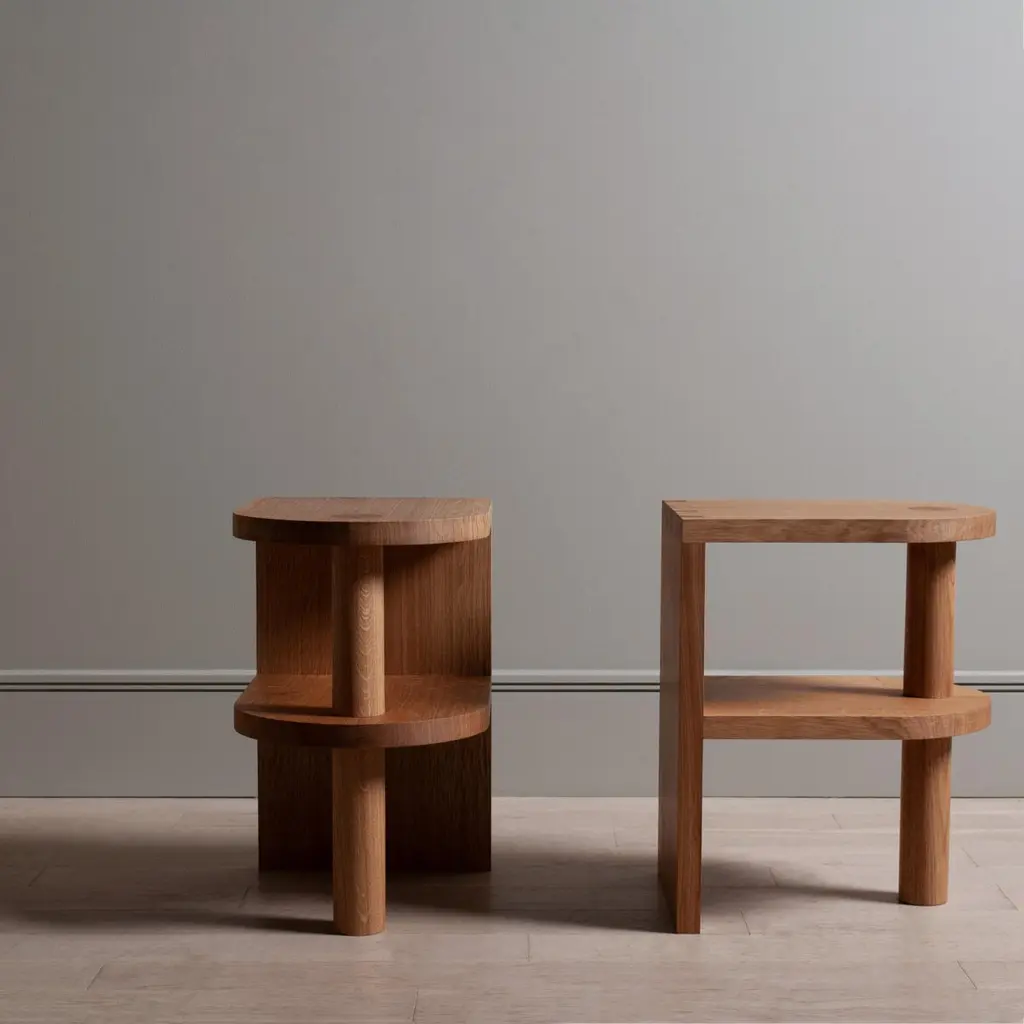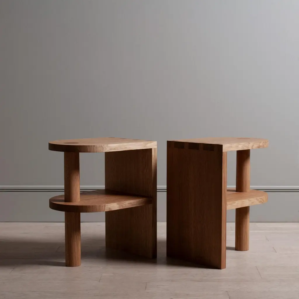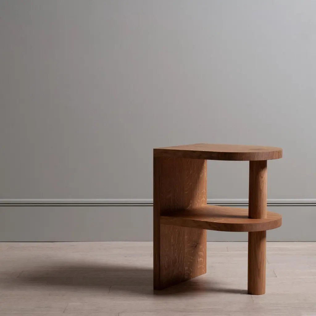 An adapted version of our architectural oak pillar nightstands or end tables. Designed and totally handcrafted in England using traditional woodwork techniques with the most beautiful and finest English quarter-sawn oak. Hand-cut large dovetail jointing with turned oak upright pillar piercing through the sections cut flush to the surface. A design drawing influences from very early 20th century European Modernist architecture and later Post-Modern aesthetics. These are unique multi functioning pieces and are primarily intended for use as nightstands. The top surface has a hidden supporting collar within the surface and can take significant weight. These are substantial, bold and striking pieces of completely handmade furniture, built to last. Finished in durable natural oils.Alternative American Black Walnut versions are available in our other listings andcustom dimensions are available on request.These pieces are completely bench-made by hand in England and bear the telltale and tactile signs of the craftspersons work. We design bold and distinctive pieces of furniture – our main objective is combining the design alongside the natural beauty and properties of the raw materials.These timbers and materials are very carefully chosen for each specific design - maintaining our focus on the benefits, visual impact and strengths of what we use. Our regular use of English Quartersawn Oak is one case in point. It has been the beloved timber of fine furniture makers across the world for centuries. It is costly to produce but gives huge benefits and rewards such as its striking medullary rays and superb stability qualities. By utilising these wonderful and naturally occurring features with our contemporary designs we aim to continue creating some very distinct, tactile and idiosyncratic pieces.These are all completely handmade, in very small numbers, by our skilled craftspeople in England.