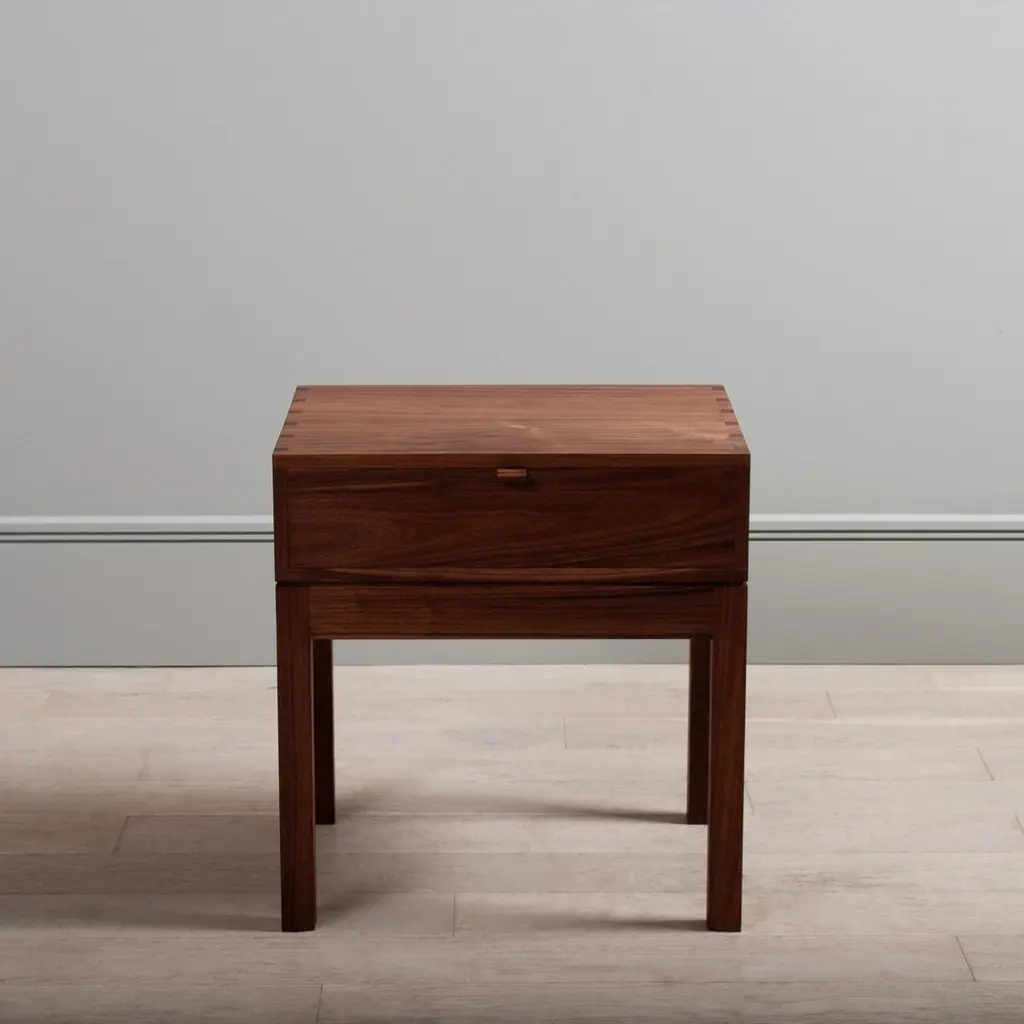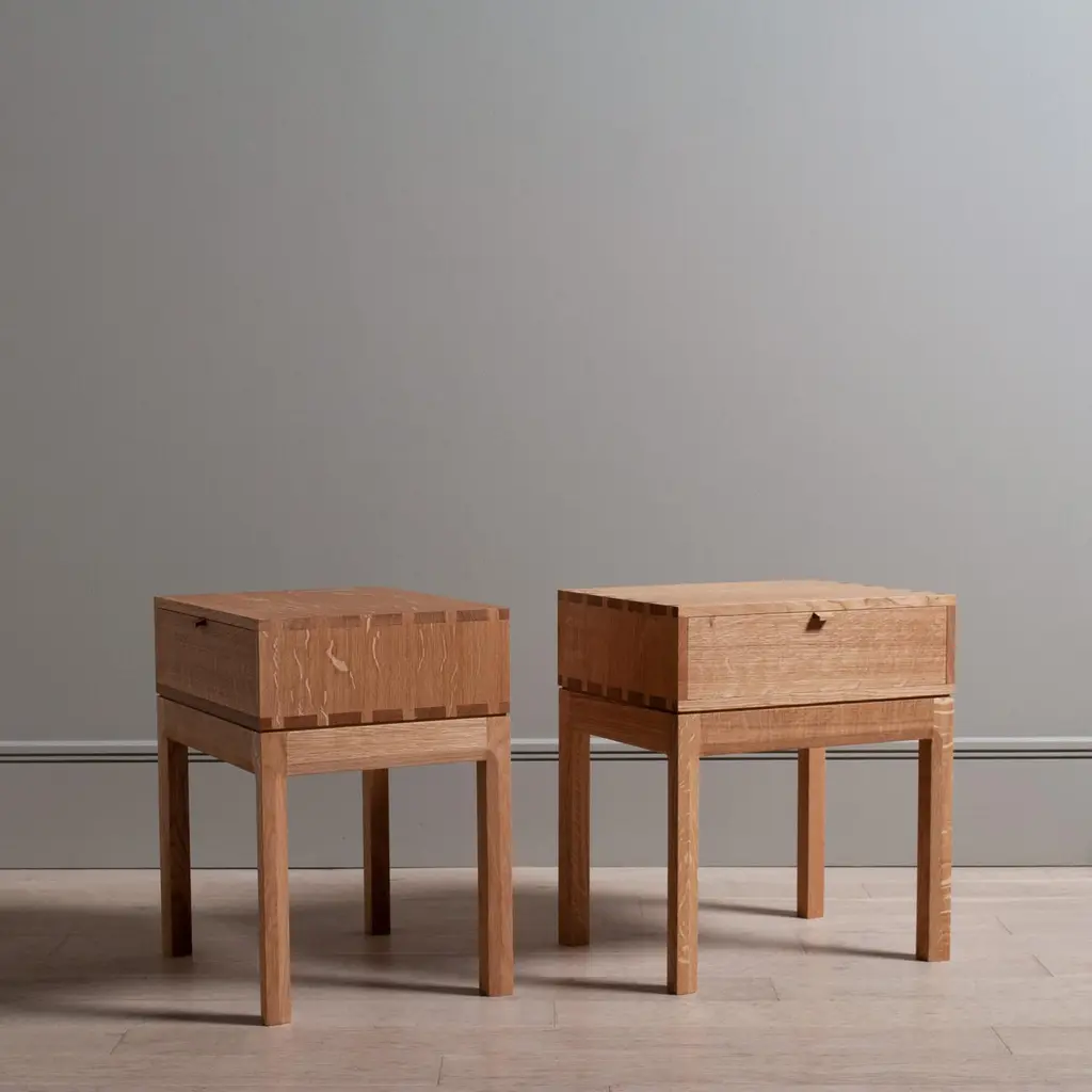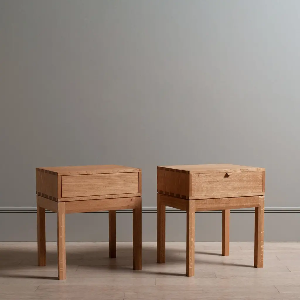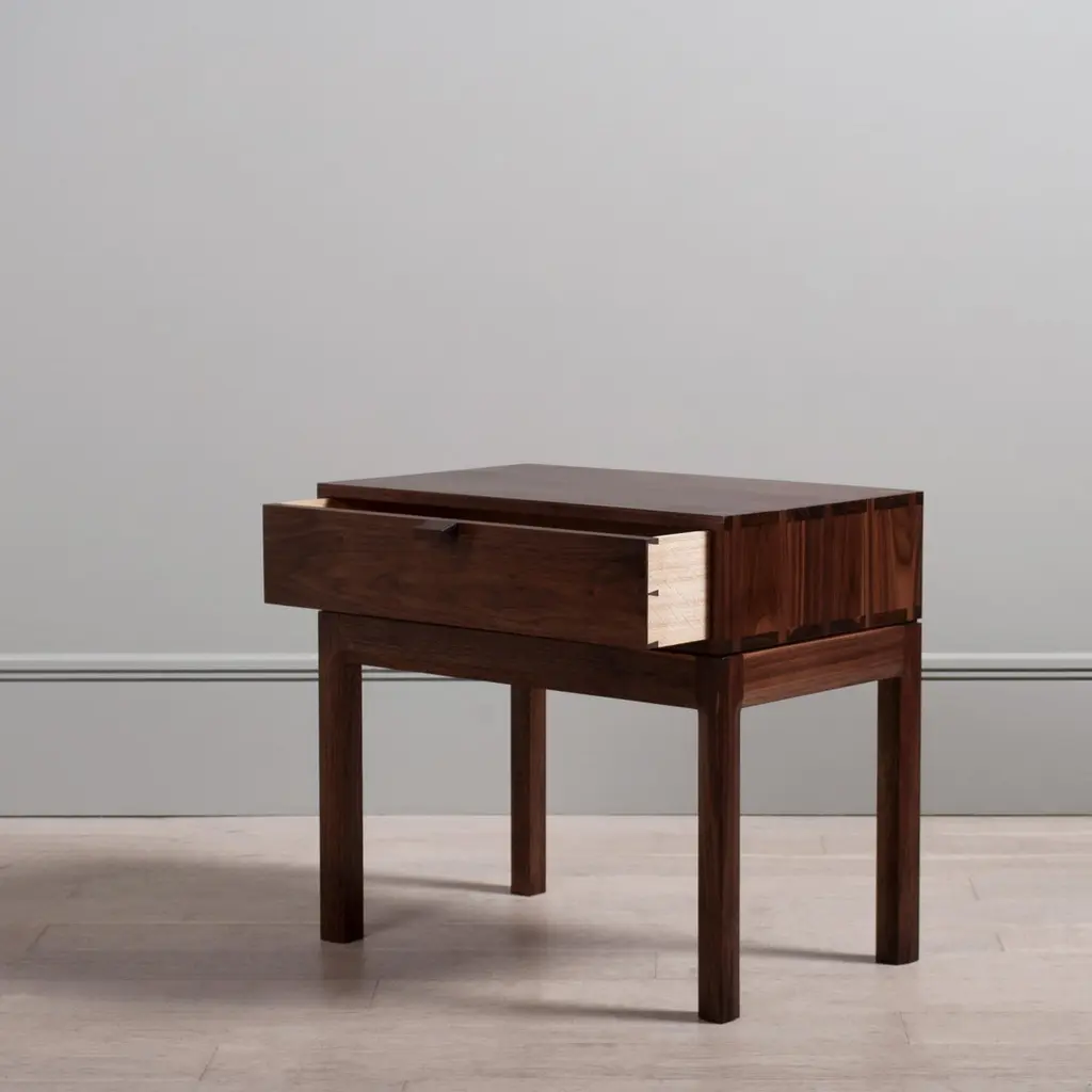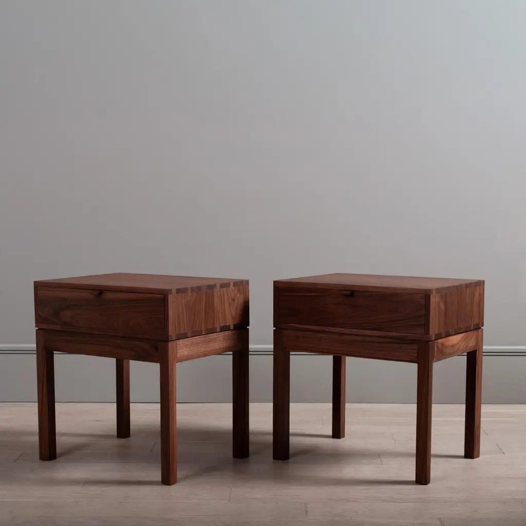 American black walnut handcrafted nightstands or end tables. These are constructed from the finest American black walnut with the inner dovetailed traditionally jointed drawer carcass in prime English Oak. The main upper box is detailed with exposed hand-cut dovetail jointing and contains one drawer. A light curve design is cut into and around the legs and follows along the facia. Price per 1 piece.Handmade by our highly skilled craftspeople in England. Hand finished in durable oils. This is a contemporary modernist design with Scandinavian influences utilising traditional English furniture craftsmanship and fine timbers.These can be made to your custom dimensions or bespoke design if required.Also available to order in Prime English Quartersawn oak - examples of which can be seen in final images.We design bold and distinctive pieces of furniture – our main objective is combining the design alongside the natural beauty and properties of the raw materials.These timbers and materials are very carefully chosen for each specific design - maintaining our focus on the benefits, visual impact and strengths of what we use. Our regular use of English Quartersawn Oak is one case in point. It has been the beloved timber of fine furniture makers across the world for centuries. It is costly to produce but gives huge benefits and rewards such as its striking medullary rays and superb stability qualities. By utilising these wonderful and naturally occurring features with our contemporary designs we aim to continue creating some very distinct, tactile and idiosyncratic pieces.These are all completely handmade, in very small numbers, by our skilled craftspeople in England.