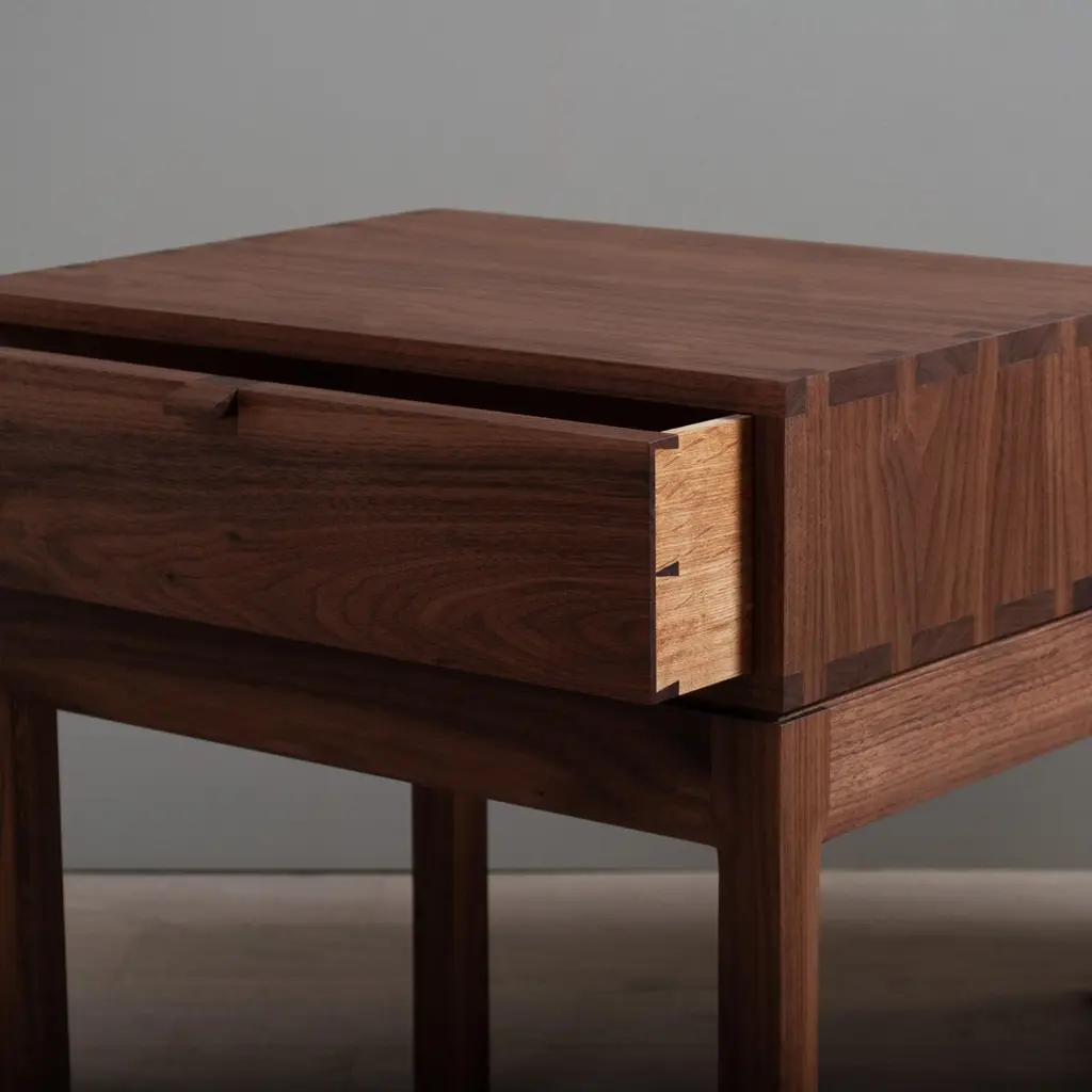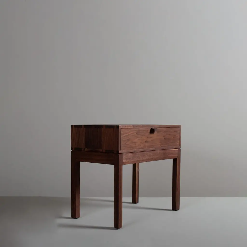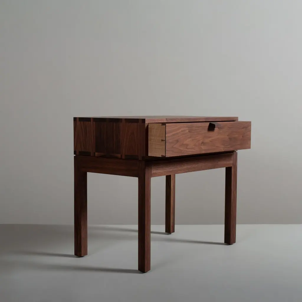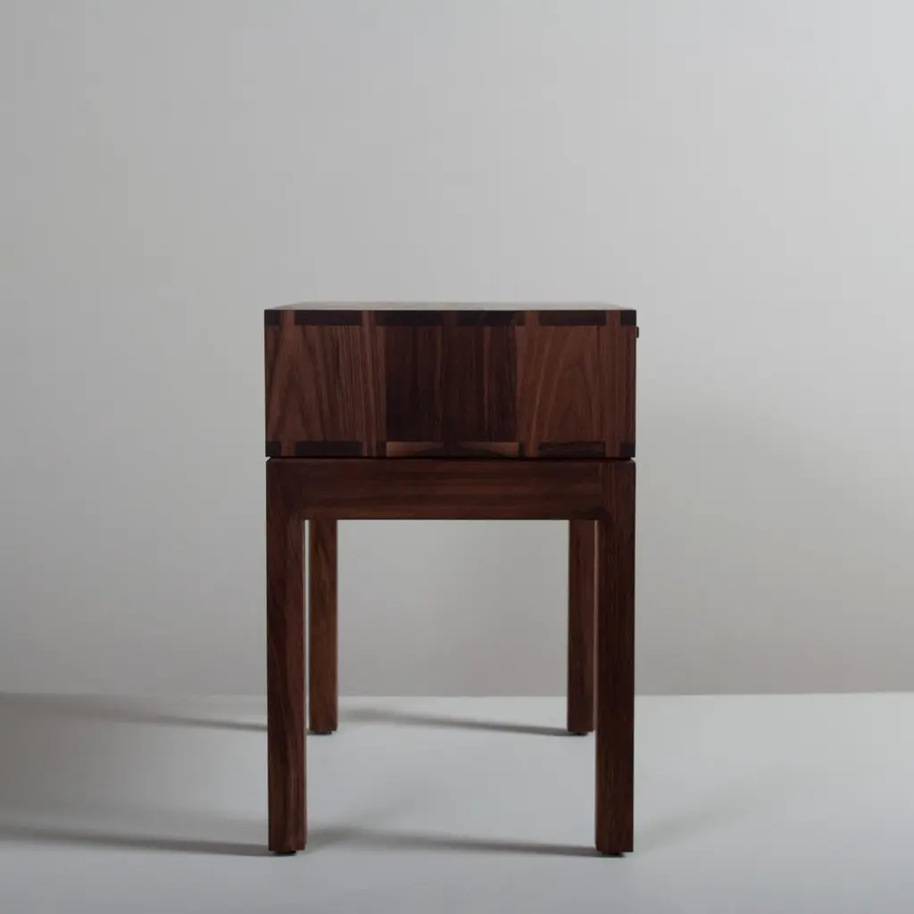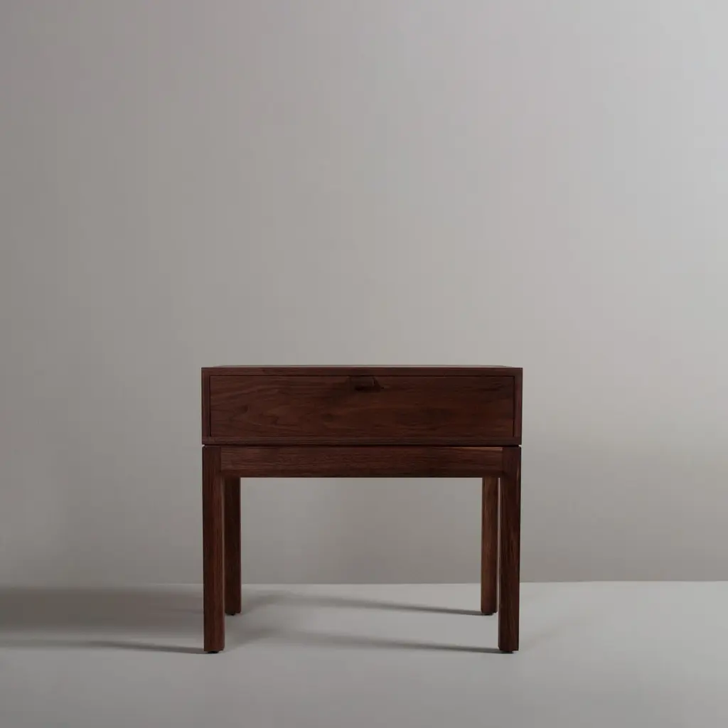 American black walnut handcrafted nightstands or end tables. These are constructed from the finest American black walnut with the inner dovetailed traditionally jointed drawer carcass in prime English Oak. The main upper box is detailed with exposed hand-cut dovetail jointing and contains one drawer. A light curve design is cut into and around the legs and follows along the facia. Price per 1 piece.Handmade by our highly skilled craftspeople in England. Hand finished in durable oils. This is a contemporary modernist design with Scandinavian influences utilising traditional English furniture craftsmanship and fine timbers.These can be made to your custom dimensions or bespoke design if required.Also available to order in Prime English Quartersawn oak - examples of which can be seen in final images.We design bold and distinctive pieces of furniture – our main objective is combining the design alongside the natural beauty and properties of the raw materials.These timbers and materials are very carefully chosen for each specific design - maintaining our focus on the benefits, visual impact and strengths of what we use. Our regular use of English Quartersawn Oak is one case in point. It has been the beloved timber of fine furniture makers across the world for centuries. It is costly to produce but gives huge benefits and rewards such as its striking medullary rays and superb stability qualities. By utilising these wonderful and naturally occurring features with our contemporary designs we aim to continue creating some very distinct, tactile and idiosyncratic pieces.These are all completely handmade, in very small numbers, by our skilled craftspeople in England.