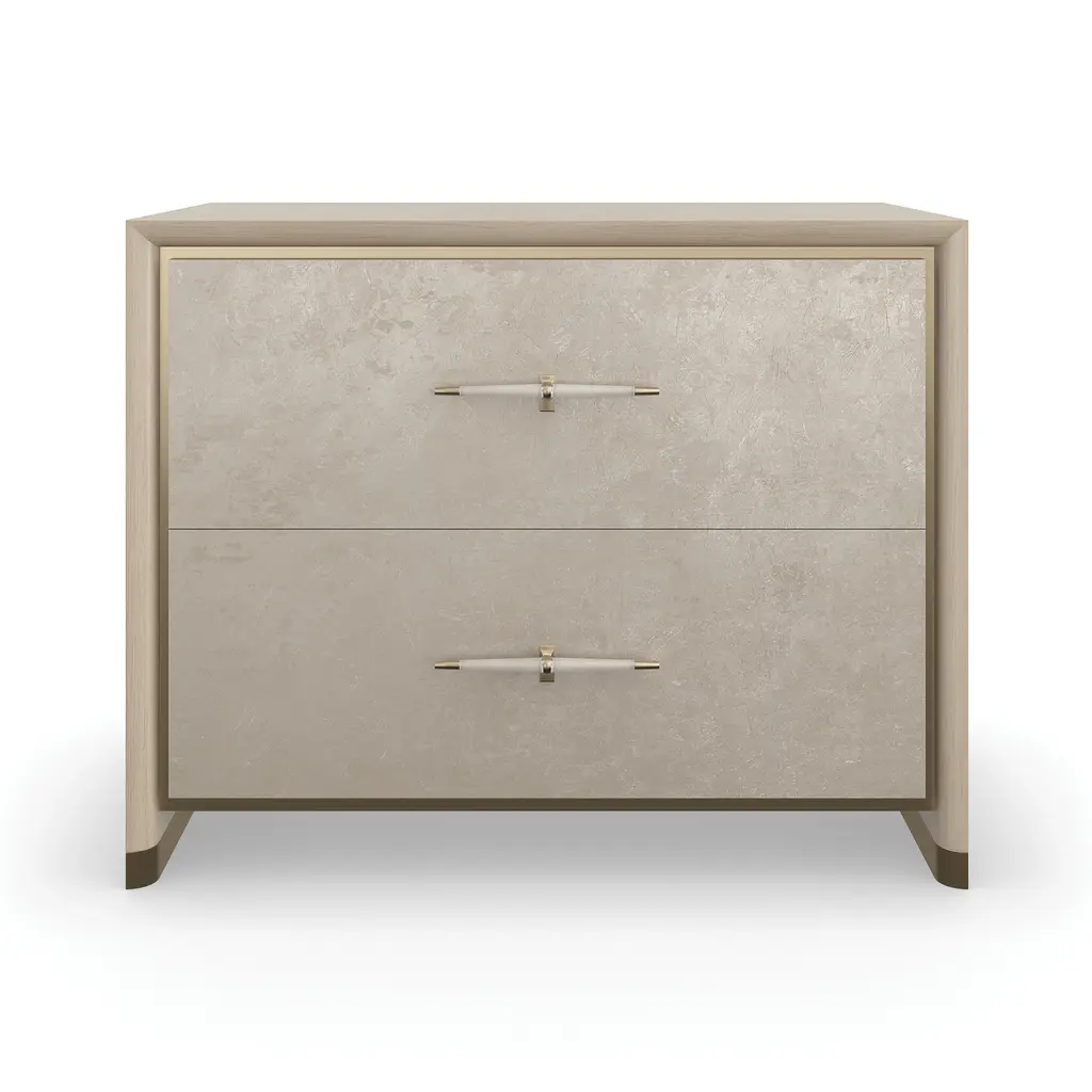 Elevate your sleep space storage with the Hang Up Nightstand from Caracole. Combining the natural appeal of wood with hints of luxurious metal, this captivating bedside companion boasts soft-close drawers in a unique broken leaf metallic finish. The brushed gold accents and hand-stitched, faux leather drawer pulls add warmth and style. Highlights