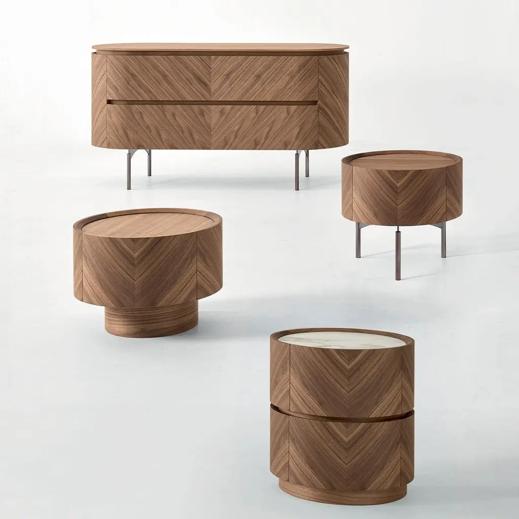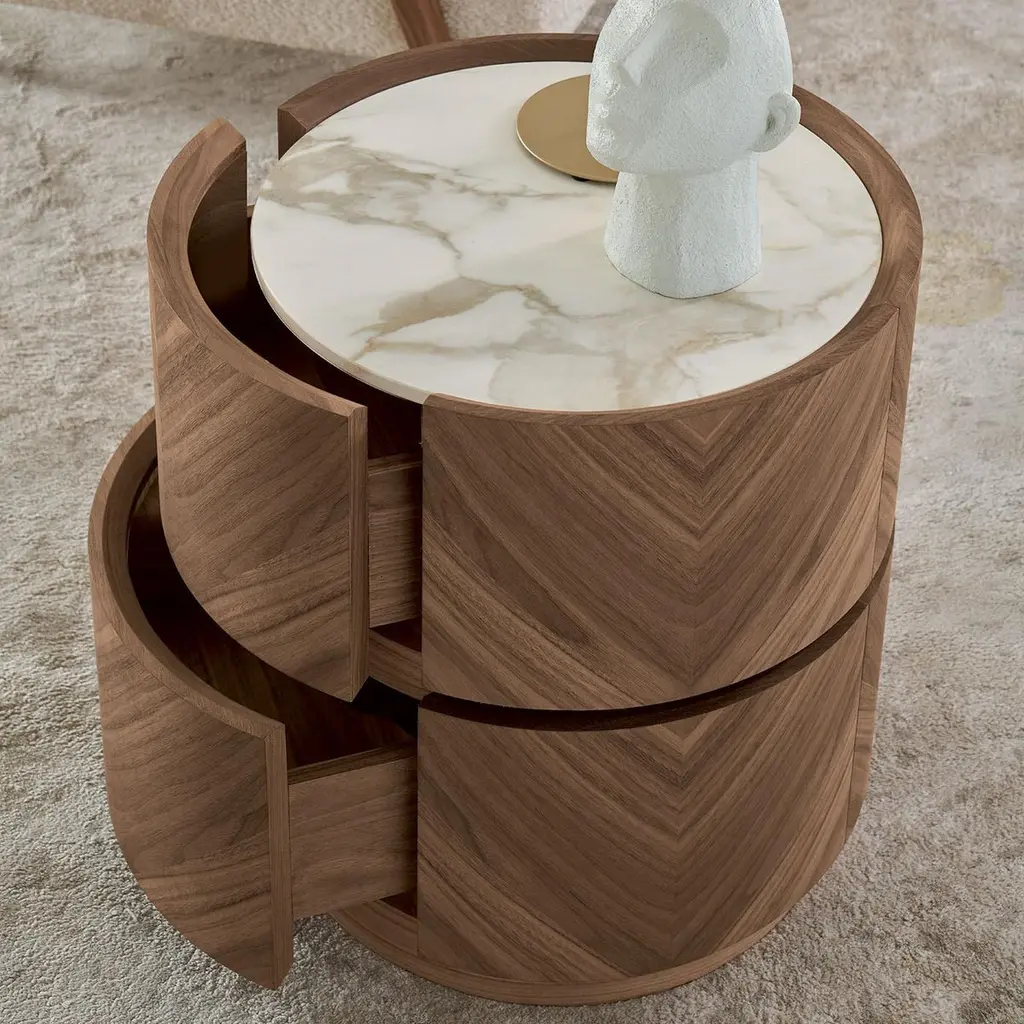 Merging earthy tones with stone elegance, this nightstand pairs a herringbone walnut veneer with a top crafted from luxurious Calacatta ceramic. The contrast between the rich wood grain and the creamy ceramic patterns creates a striking visual statement. The two handle-free drawers open effortlessly, ensuring both functionality and aesthetic purity. Ideal for contemporary bedrooms, it is a versatile piece that exudes sophistication while respecting natural materials.
