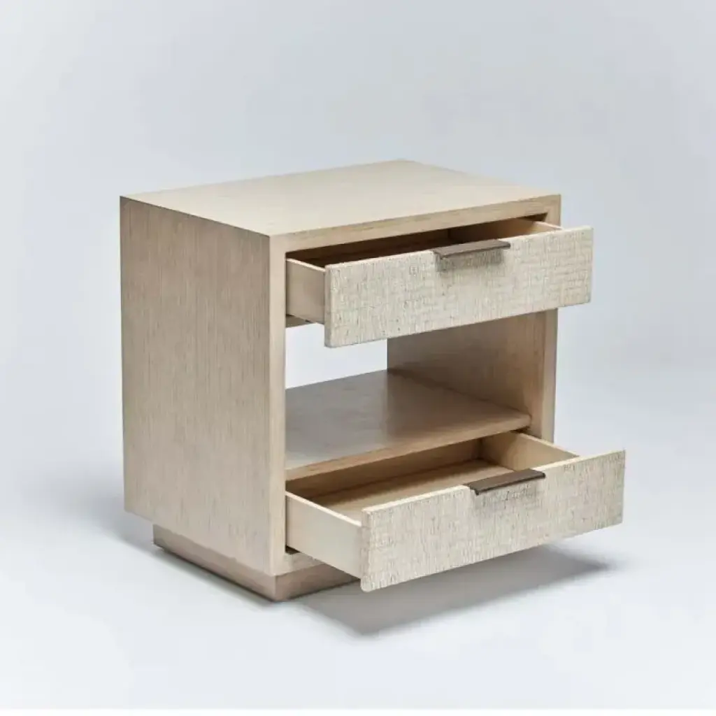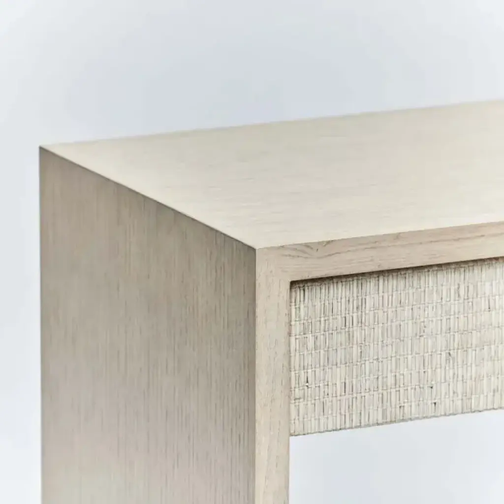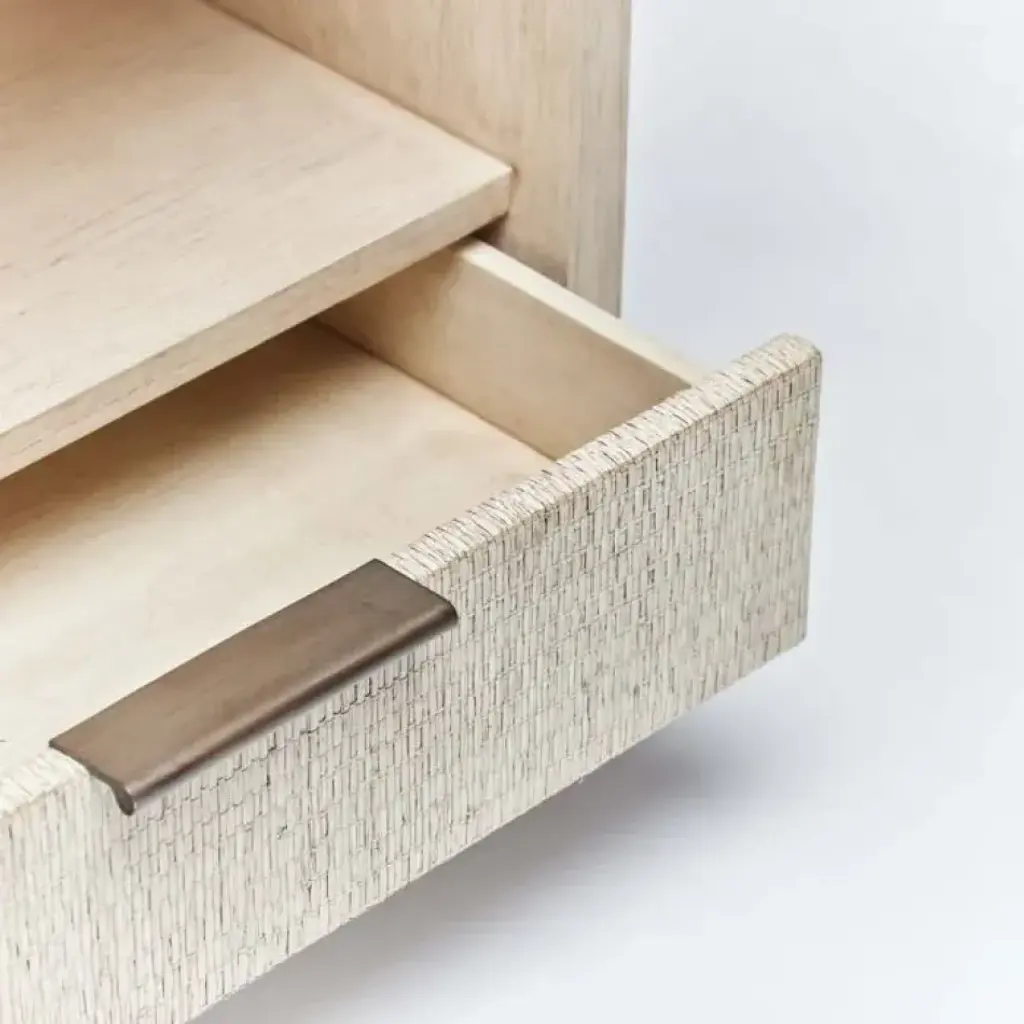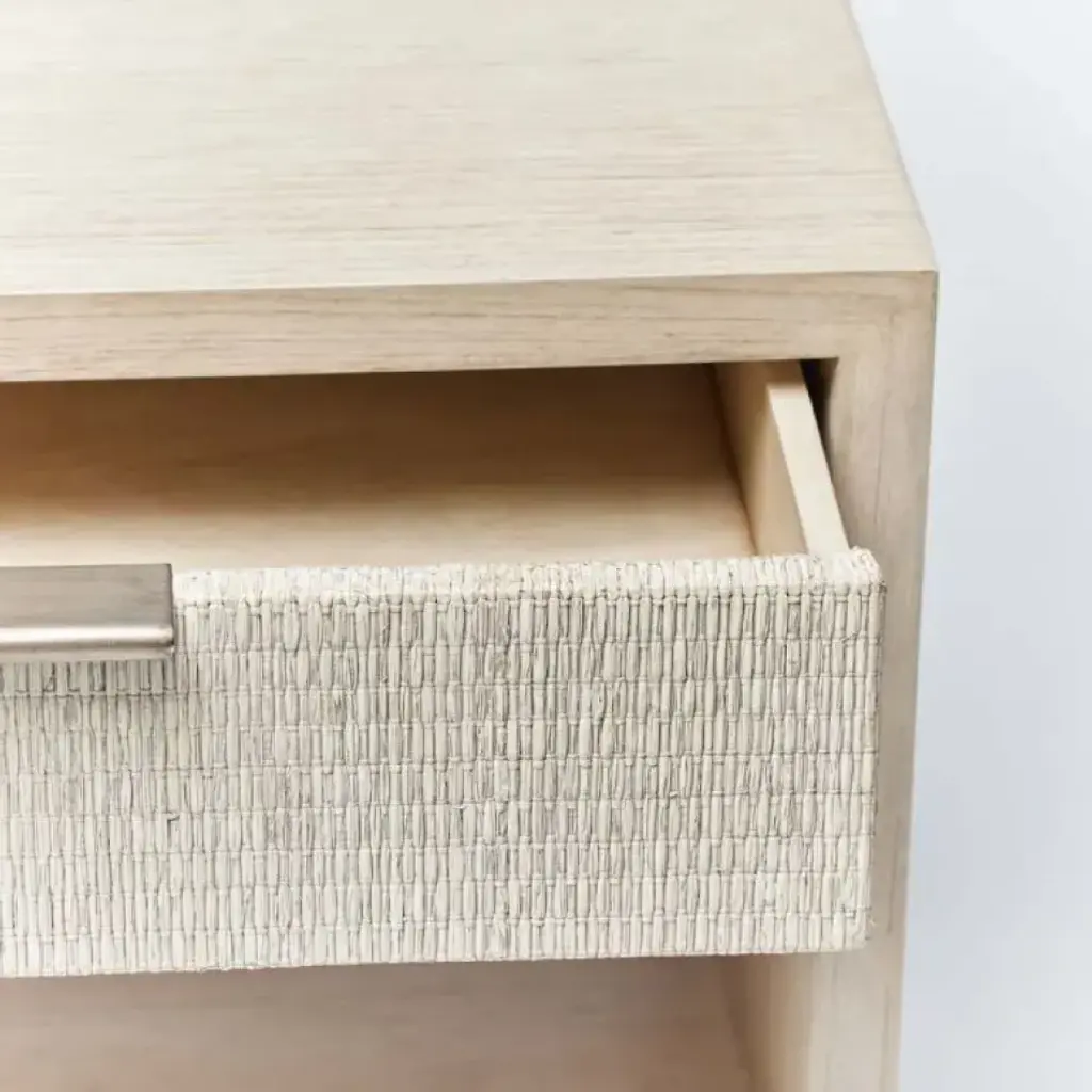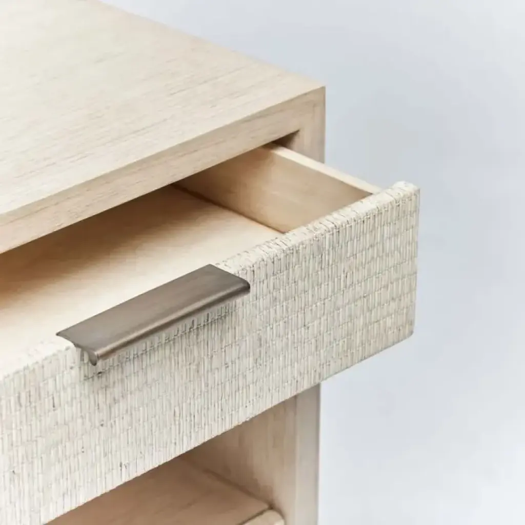 Featuring washed taupe wood with raffia insets and metal drawer pulls in satin aged bronze, the Harperly Bedside Chest brings an organic calm to a bedroom must-have. This item is made of solid wood. Item will not be exactly as pictured, subtle deviations in hue after finishing can be expected as a result of natural variations in coloration of the base material.