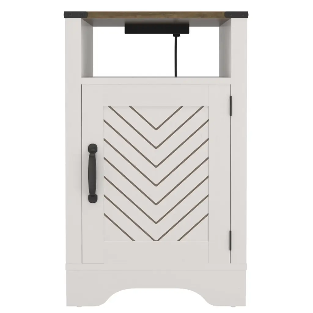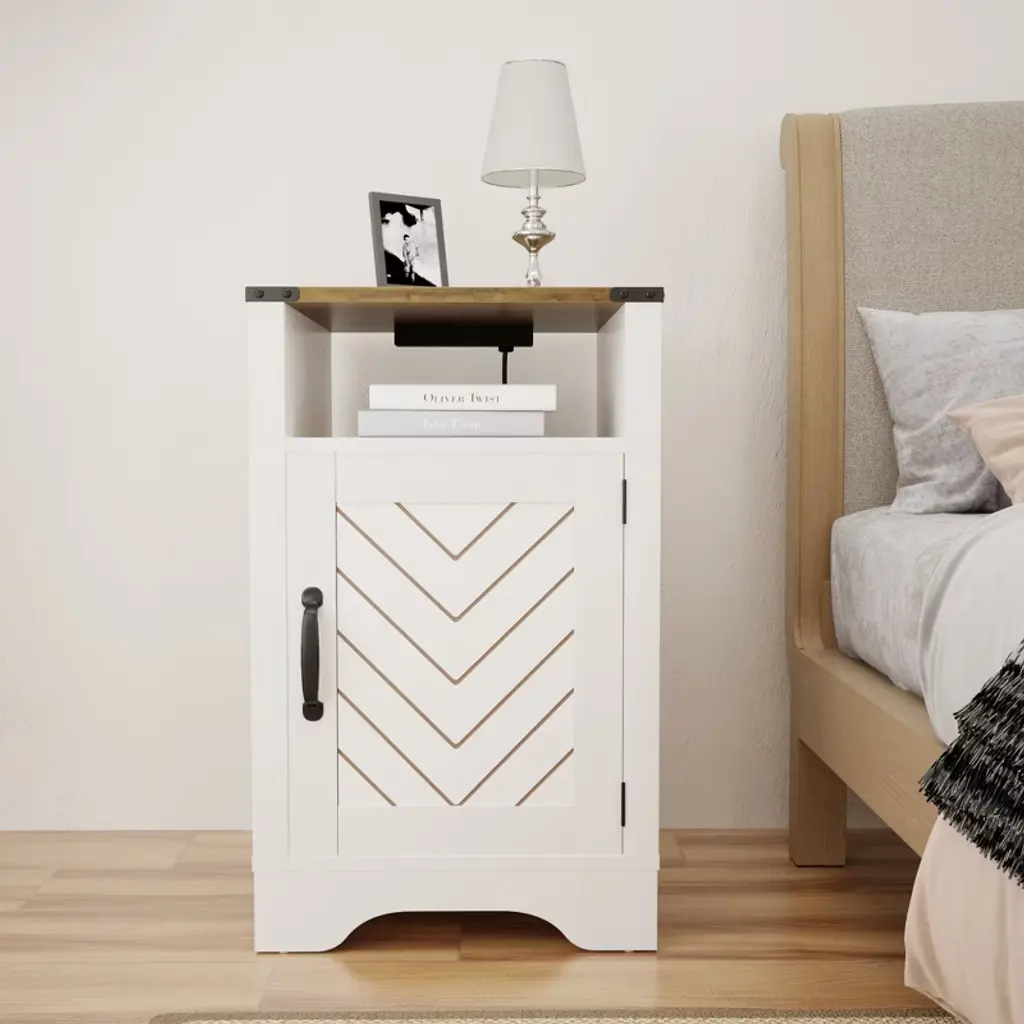 Charging Station Certified by UL : Our nightstand is equipped with a UL-certified power strip with a control switch, so you can charge your devices safely and conveniently. Power up your electronics with two USB ports and two plug sockets.Easy Access and Secure Closure: With metal hinges and a magnetic latch, the side table's doors open and close effortlessly while remaining securely closed.Ample Storage Space: With a large cabinet for storing accessories, a convenient top surface for holding a hot cup of tea, and an open shelf for displaying knickknacks, this end table offers generous hidden and open storage.Designed from durable MDF and engineered wood, this bedside table is built to last. With its versatile design, it can be used as a bedside table, sofa side table, or entryway organizer.Simple Assembly: Hardware, tools, and a labeled instruction manual are included to simplify assembly.