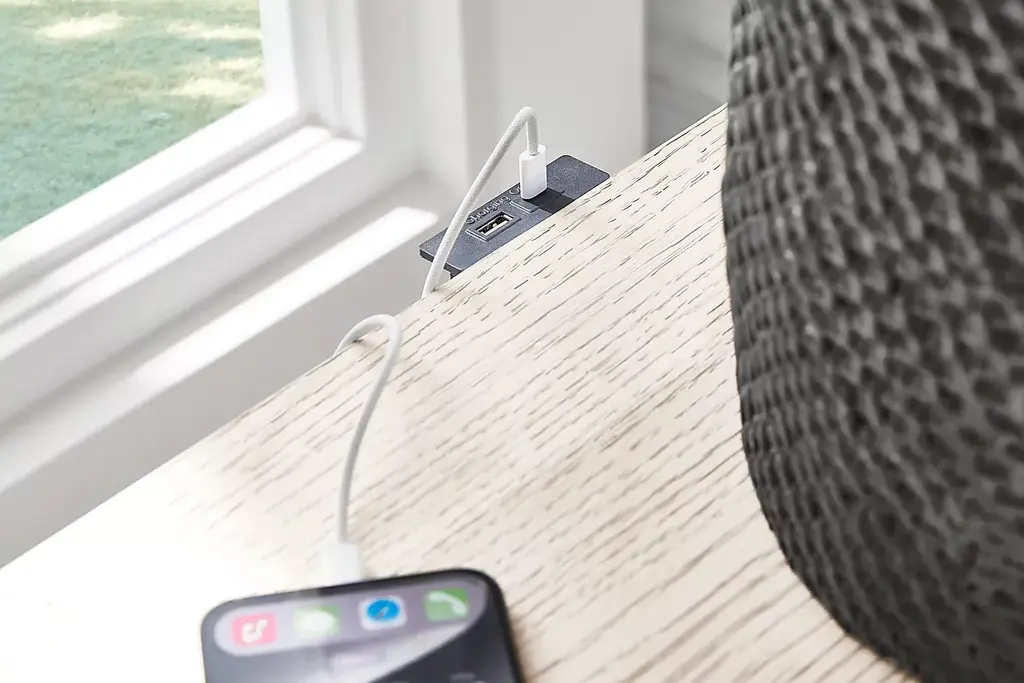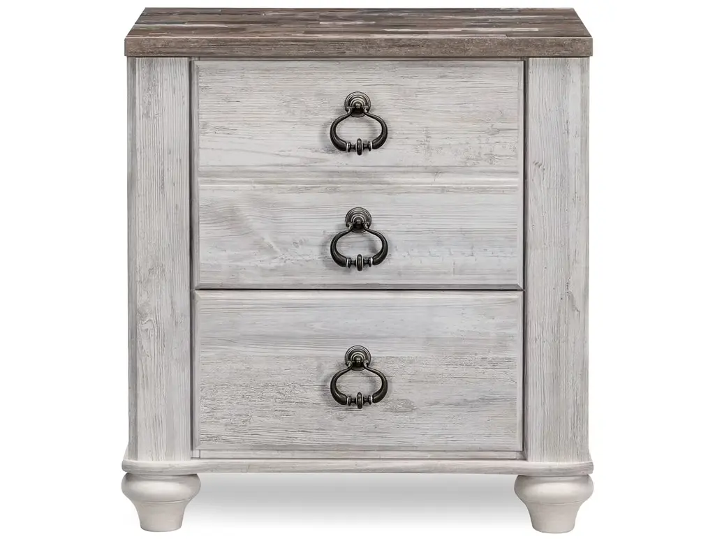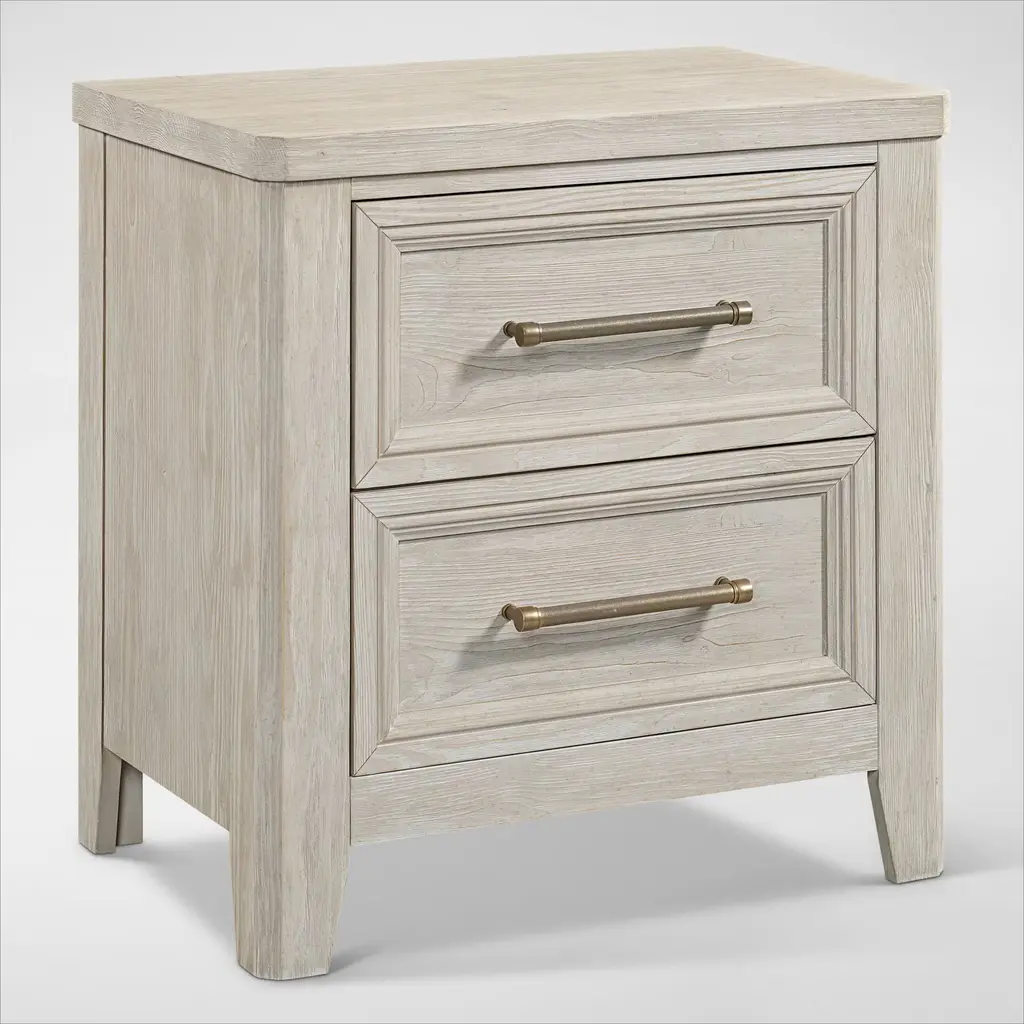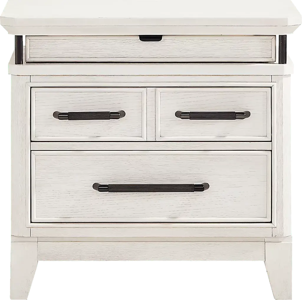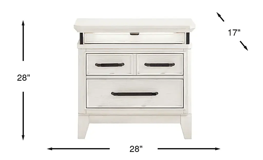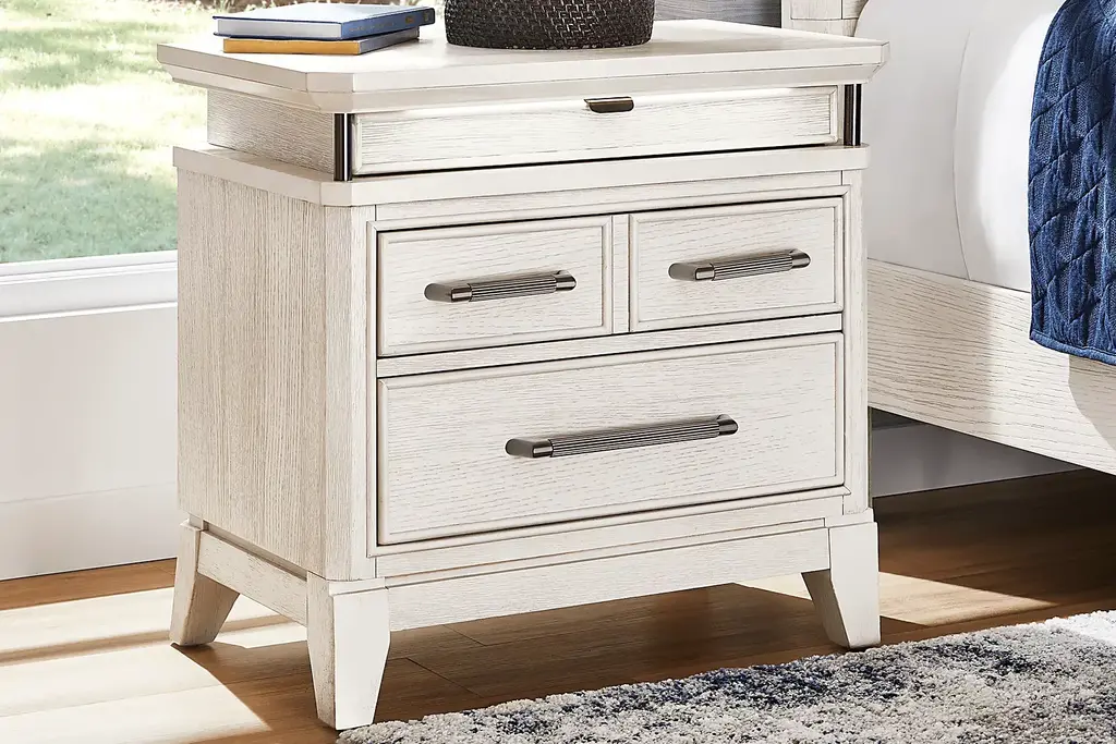 Quietly radiant with the soft serenity of promise for each new day, the Heiress collection's understated confidence invites you into a world alive with possibilities. The dramatically recessed top drawer of this nightstand is outlined by brilliant touch-activated LED lights. The white finish contrasts with the unique textured metal hardware and metal corner details. Adding a welcome touch of convenience, USB-A and USB-C chargers are built in. Chamfered edges and tapered feet create a distinguished look.