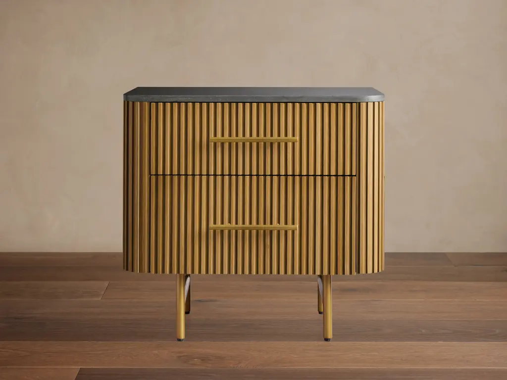 Keep your sleep essentials within reach with the Hendrick Tambour Nightstand. The mid-century profile features two tambour doors made of narrow slats which slide open to reveal the spacious cabinet within. The waxed track ensures easy access, while adjustable shelving allows for you to customize your storage space to meet your needs. This durable design is crafted from American poplar wood with solid brass door pulls and leg caps.