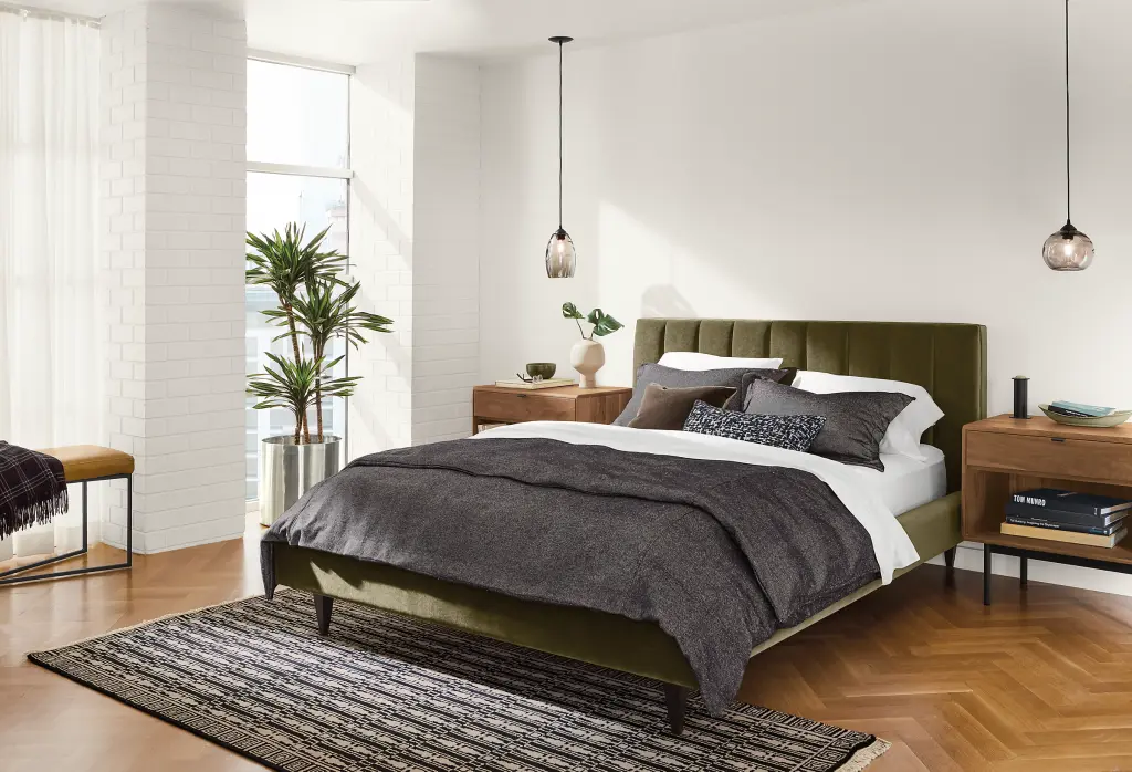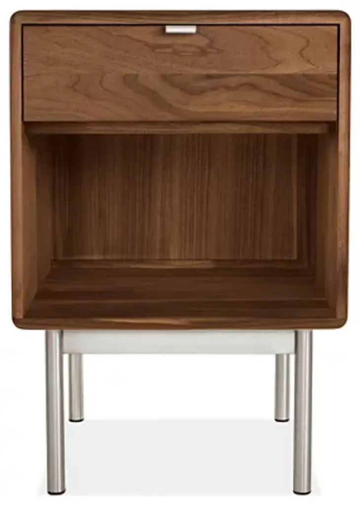 Our Hensley nightstand brings a soft and modern silhouette to your bedroom. Inspired by the timeless appeal of mid-century design and infused with modern details, Hensley features a stunning mix of materials that give it an updated look for today. You'll love the smooth feel of the domestically sourced solid wood, and appreciate the durability and beauty of the brushed stainless steel or powder-coated graphite base. Softly curved door pulls mimic the rounded edges of the nightstand to round out this sophisticated storage option.
