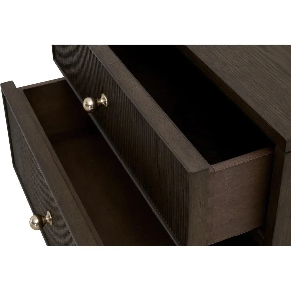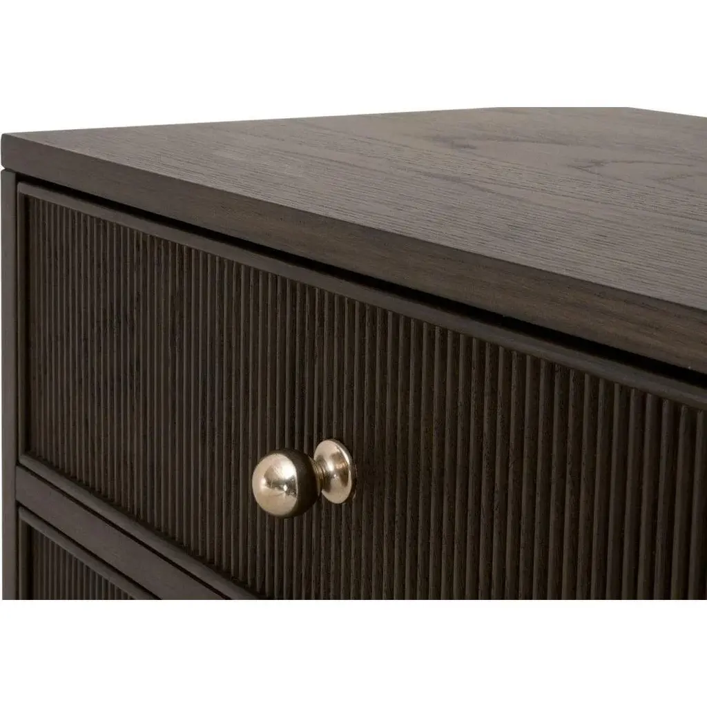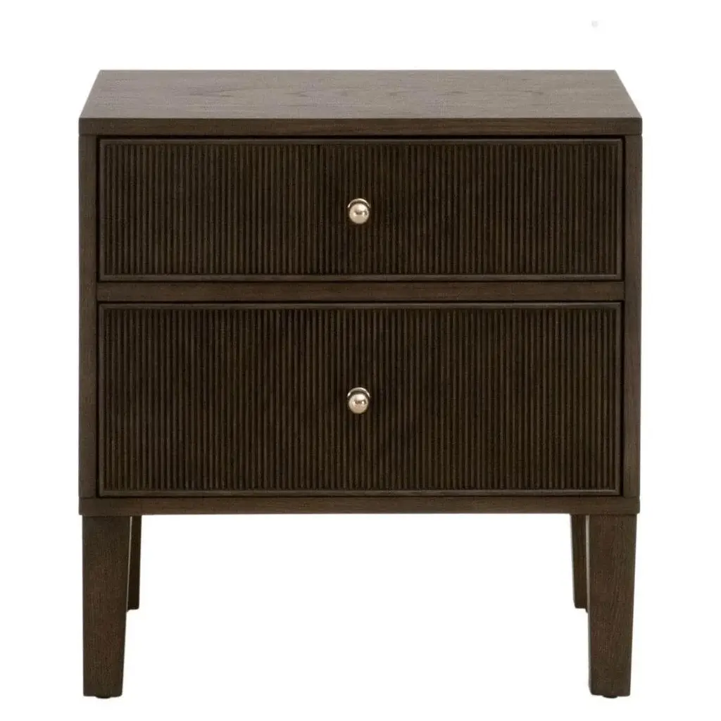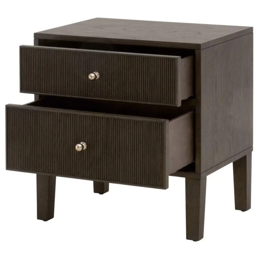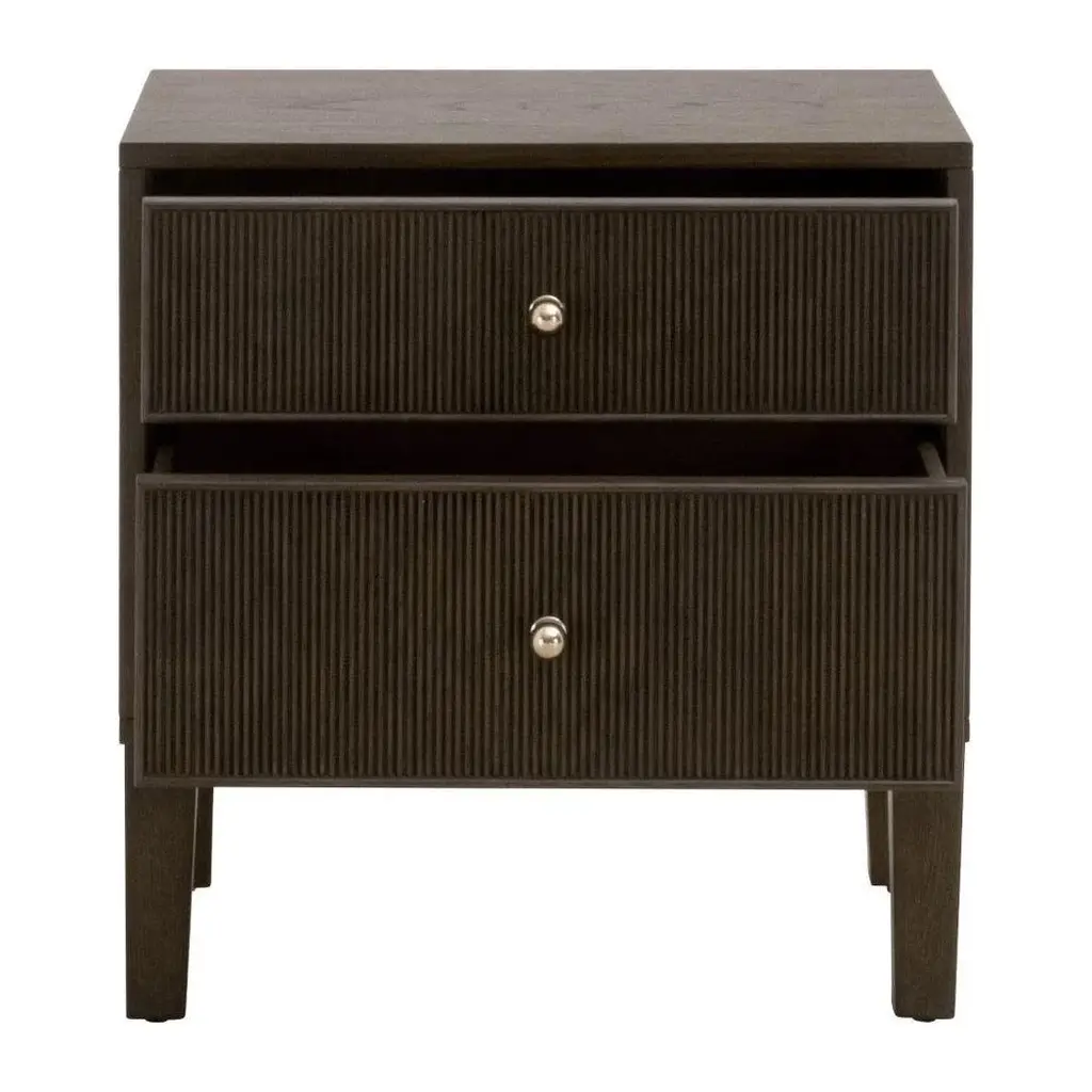 The Highland 2-Drawer Nightstand by Essentials For Living brings a fine mix of traditional and modern styles to your bedroom. This piece is made from solid oak wood and oak veneer, finished in a Dutch brown oak that fits well with many interior designs. Its rectangular shape and dark brown color add a touch of elegance, while the ribbed texture on the drawers introduces an interesting visual element. The nightstand's compact size makes it a perfect fit for any bedroom space, offering both functionality and style. This nightstand is designed with practicality in mind. It features two spacious drawers, each adorned with polished brass iron knobs for a classic look. The top drawer is lined with felt, providing a safe spot for delicate items. Dual metal drawer glides ensure smooth and easy access to your belongings. The KD leg construction adds stability, making this nightstand not just beautiful but sturdy as well. With its combination of solid materials and thoughtful design, the Highland 2-Drawer Nightstand is a timeless piece. It embodies the essence of transitional design, blending seamlessly with various decor styles. Whether you're looking to complement your existing furniture or create a contrasting focal point, this nightstand is sure to meet your needs. Its refined details and quality craftsmanship make it a worthwhile addition to any home. Highland 2-Drawer Nightstand With Fluted Details Features: Overall Dimensions (WxDxH): 23" x 17" x 24" Materials: Solid Oak Wood, MDF, Oak Veneer, Iron Color: Chocolate Brown Fluted Wood Drawer Front Detail Dual Metal Drawer Glides Felt-Lined Top Drawer Top Drawer Dimensions: 19.5" x 10.75" x 5.25" Lower Drawer Dimensions: 19.5" x 10.75" x 4" KD Leg Construction Country of Manufacture: Vietnam Due to various screen settings the color of the item may look slightly different in person from what you see on your screen. We try to make sure that the image you see is as accurate as possible.