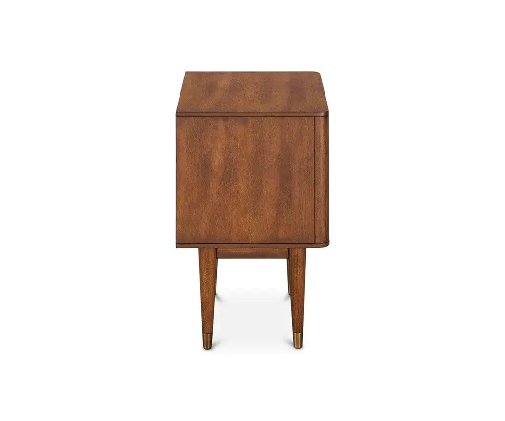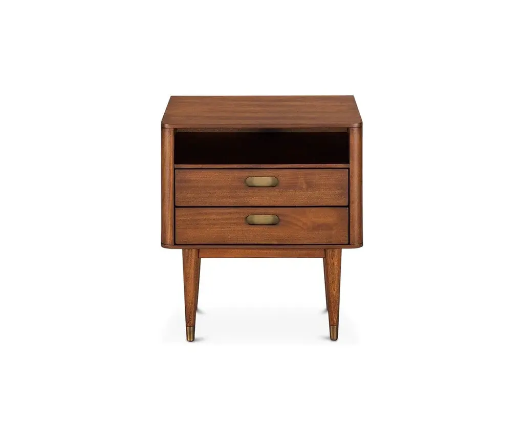 The Holfred Nightstand boasts a combination of storage for your bedside with two drawers and a display shelf. Simple lines in the design are accented by the fine attention to detail from the exquisite cutouts of the drawer pulls to the brass capped feet.