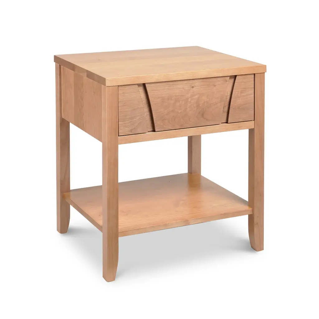 Tired of conventional style nightstands? Mix it up with our Holland 1-Drawer Open Shelf Nightstand. Two unusual inset finger pulls run in opposing arcs on both sides of the drawer front creating an instant visual interest point. A lower open shelf adds extra storage for all of your bedside storage needs. This piece is sure to intrigue and mesmerize anyone who lays eyes on it.Artfully crafted in Lyndon, Vermont using sustainably harvested solid hardwood and built to last a lifetime. Customize in your choice of natural cherry, maple, oak and walnut.Base price represents nightstand in natural cherryShown in natural cherryMatching furniture available in our Holland Furniture Collection