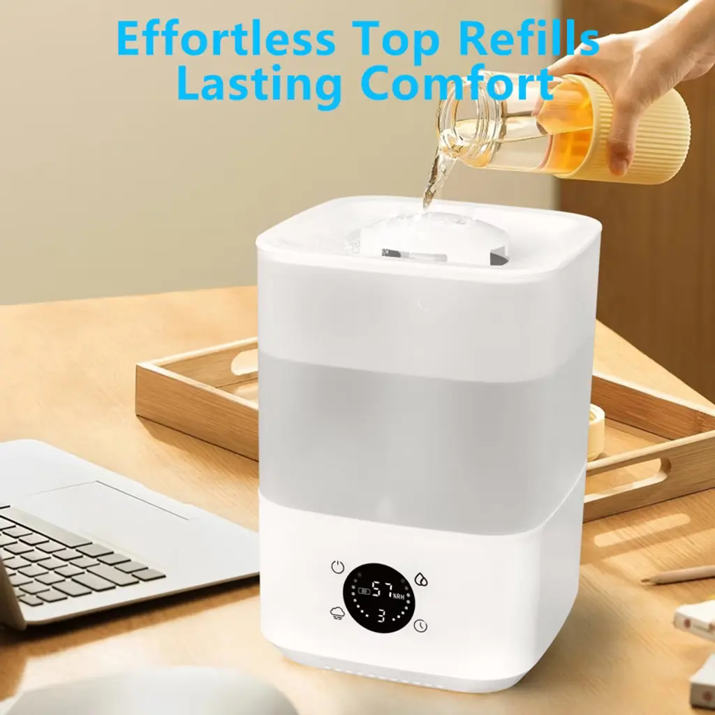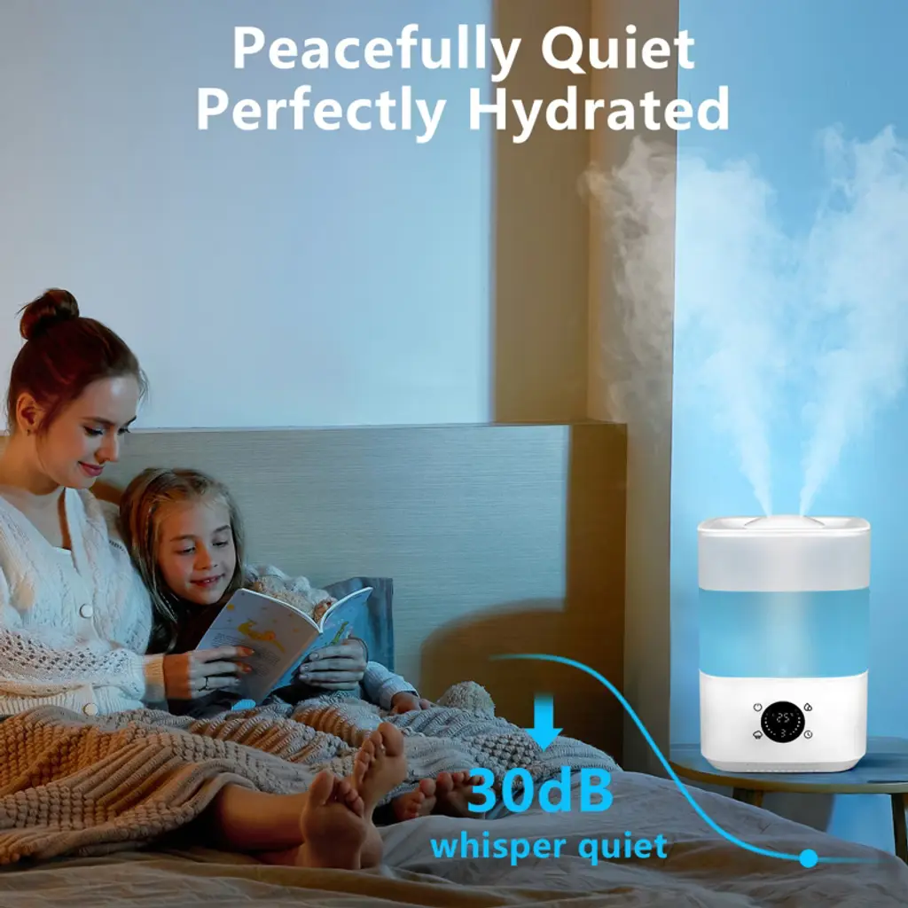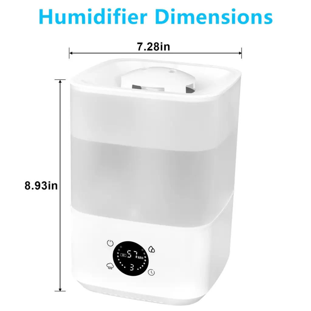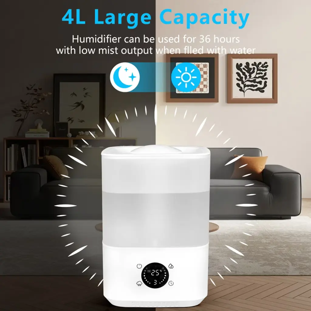 Breathe easier and sleep better with this 4L cool mist humidifier, delivering up to 36 hours of ultra-quiet hydration for rooms up to 300 sq. ft. Control mist, timers, and LED mood lights via app or touch panel. The easy top-fill design makes refilling and cleaning simple, while its sleek, compact build fits perfectly on nightstands, desks, or countertops. Ideal for year-round comfort and healthier air. Specifications Color: White Materials: ABS, PP, Electronic Components Water Tank Capacity: 4 Liters Noise Level: 30 dB (Ultra-quiet) Control Methods: Smart app control, touch panel control Mist Coverage: Up to 35" mist height, 300 sq. ft. coverage Run Time: Up to 36 hours (low mist setting)