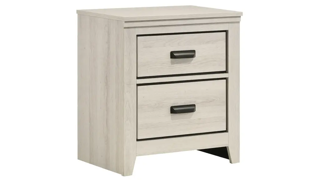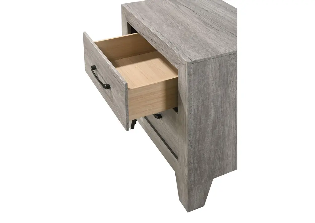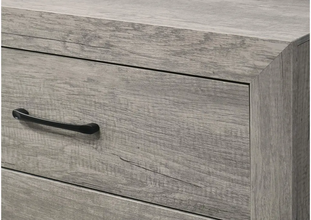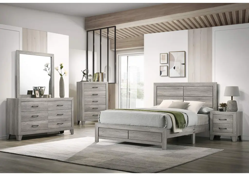 This bedroom set exudes a refreshing, contemporary charm with its light wood grain finish, embodying a serene and airy aesthetic. The bed is a minimalist's dream, with a simple yet stylish headboard that brings a sense of calm to the space. Accompanying the bed is a dresser with a clean, rectangular mirror, a tall chest, and a nightstand, all harmoniously blending functionality with sleek design. Each piece features streamlined handles that enhance the modern look while providing easy access to the ample storage space within. Weight 39.600 lbs. (17.82kgs.)