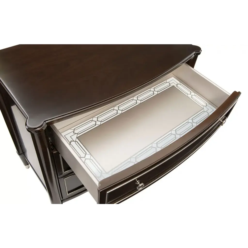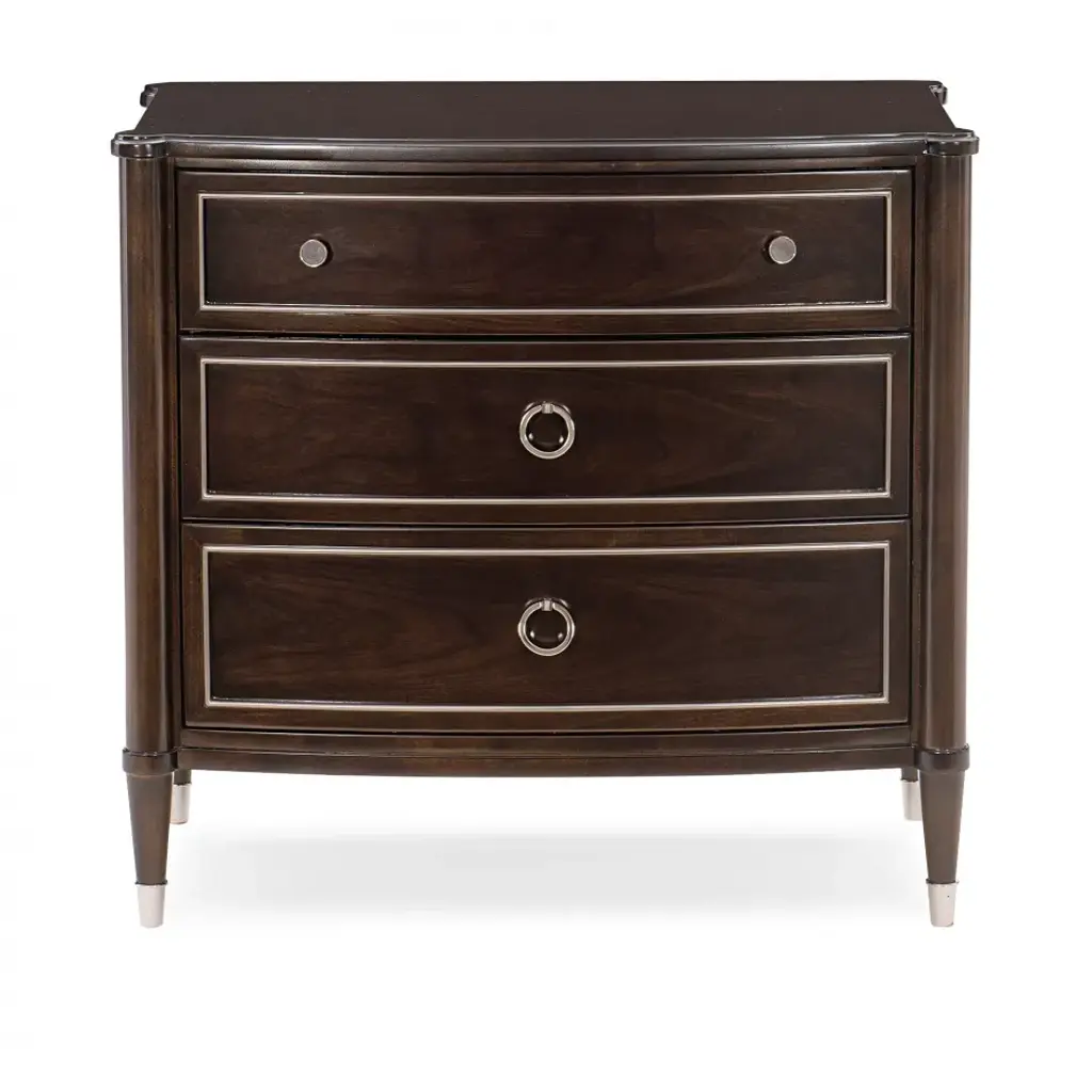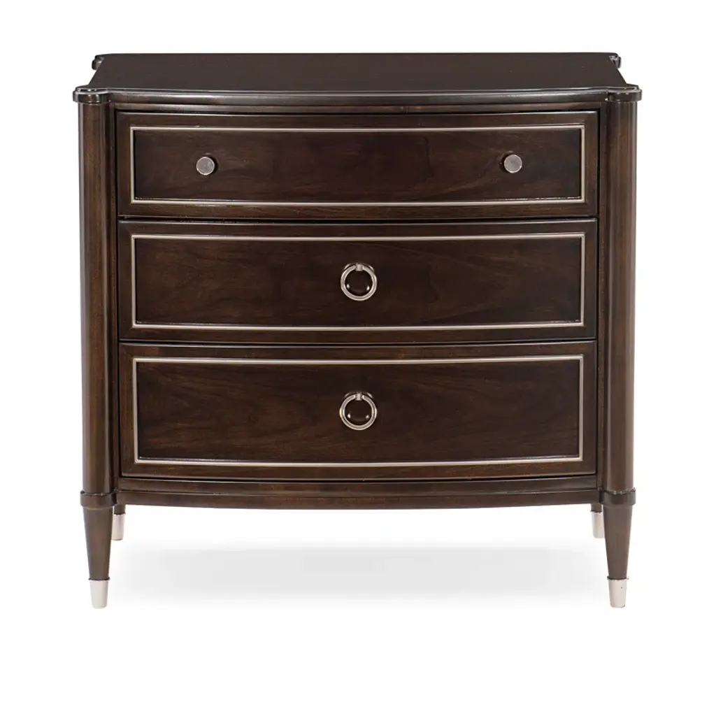A bedside essential, this handsome nightstand offers updated traditional style designed to complement any bed. Wearing a rich Mocha Walnut finish, its three drawers are trimmed in Soft Silver Paint lending instant presence. Each drawer interior sparkles with a Soft Silver Paint finish while the bottom of the top drawer boasts a beautiful silkscreened pattern. Its tapered legs culminate with metal ferrules that provide a finishing touch in a Polished Stainless Steel finish.