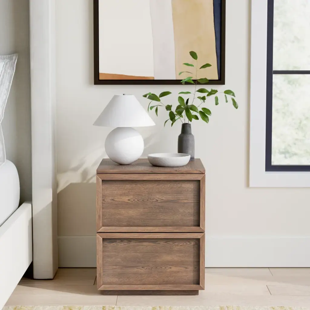 With its compact footprint and clean-lined design, our nightstand fits nicely next to your bed. Kiln-dried wood comes in a distinctive finish of your choice to suit your space's signature style, and the paneled drawers conceal nighttime essentials. Also makes a great end table in your living room.