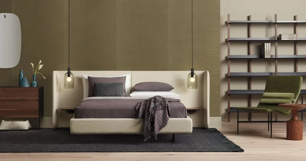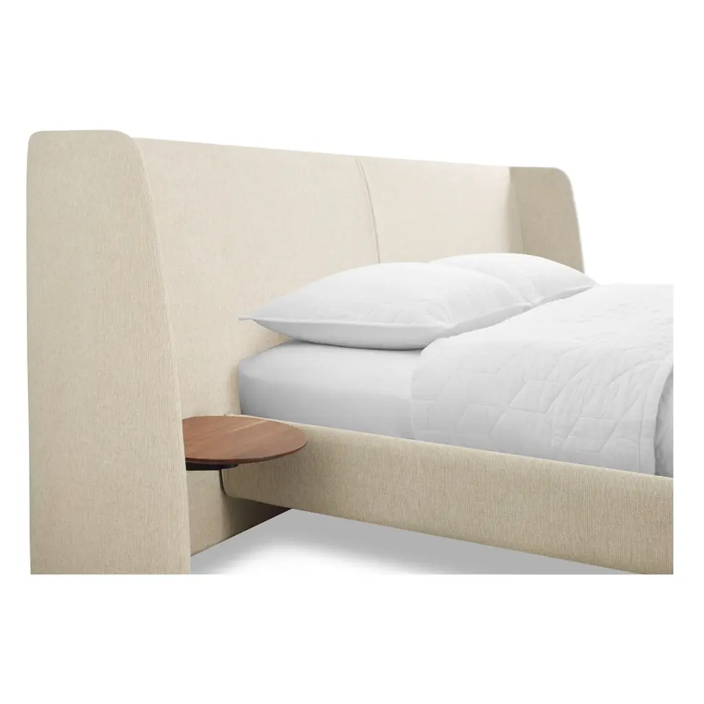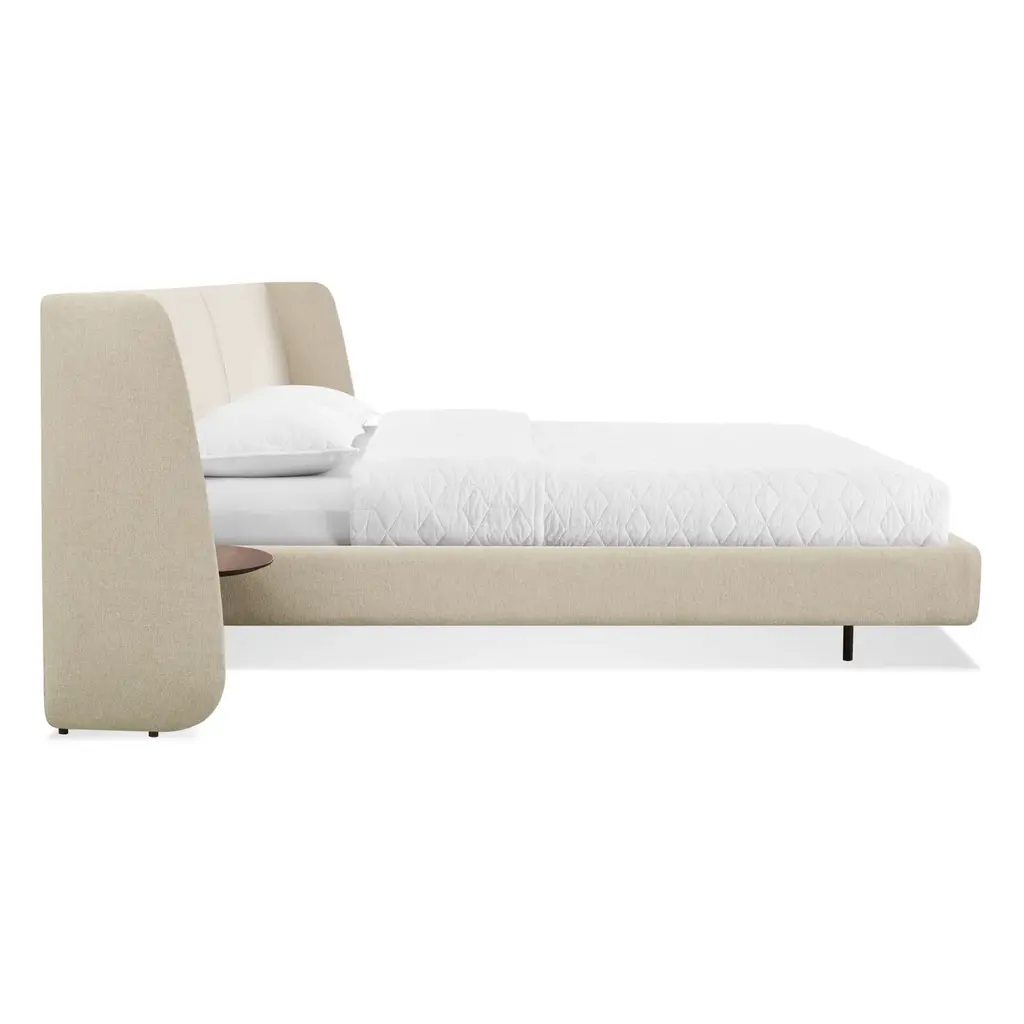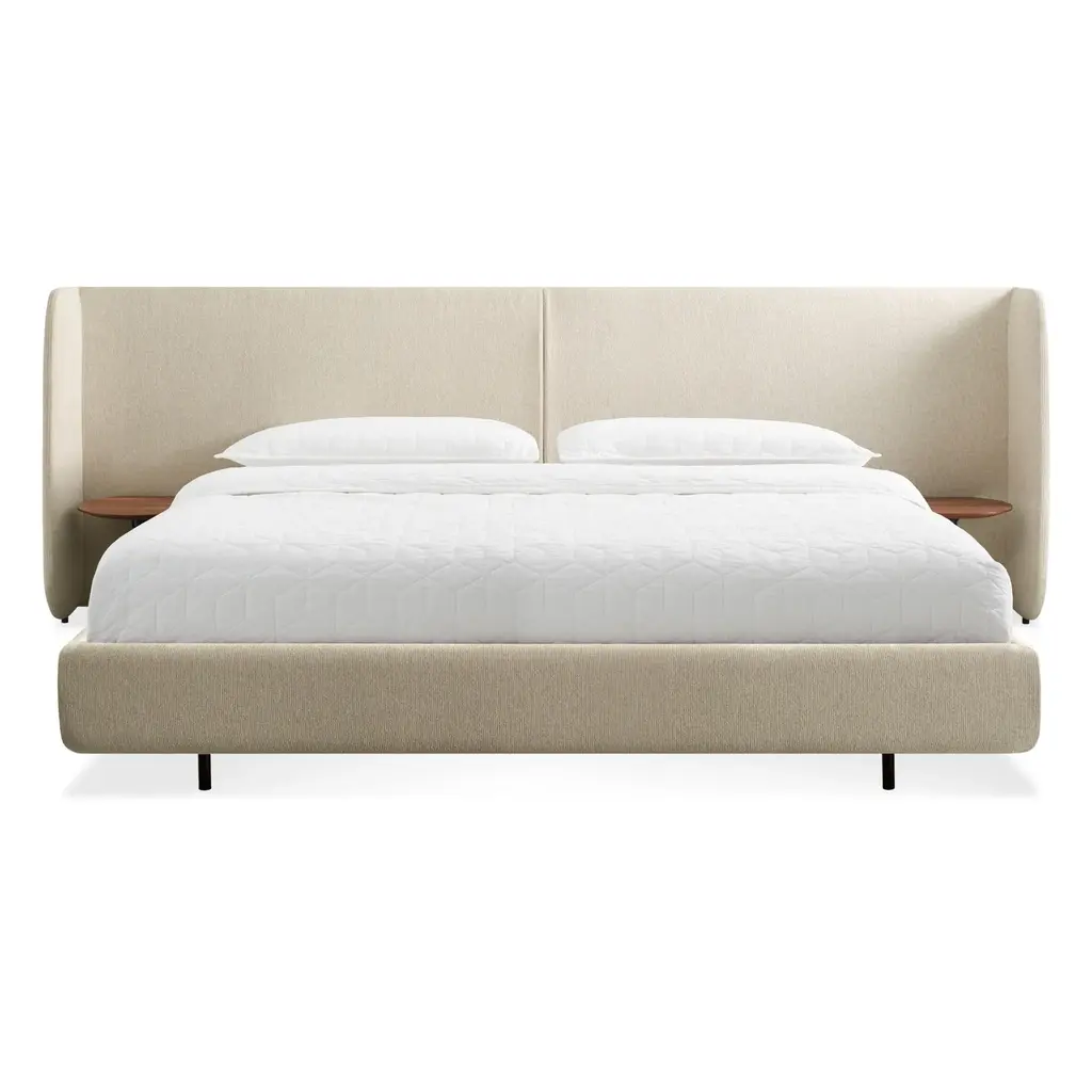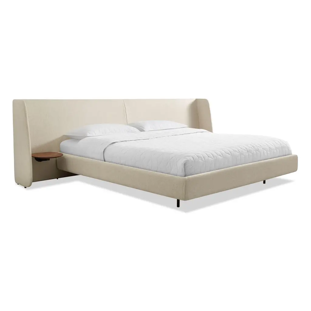 Surround yourself in serenity with Hunker. Built-in nightstands are integrated into an enveloping curved upholstered headboard providing a safe space for all your nocturnal endeavors.