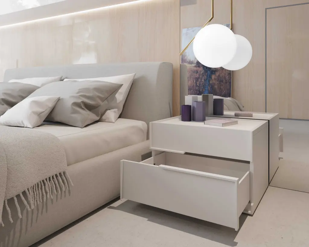 Hunter's handsome silhouette and dreamy walnut or ash veneer are reminiscent of a modern cabin. This five piece bedroom set is designed with a wide and low profile to add casual comfort to a good night. The Hunter Nightstand is a perfect pair with the Hunter Bed, and is available in American walnut, ash veneer, or high gloss white lacquer for an unexpectedly cool contrast. The top is finished with a reflective mirror surface for a flash of modernism.