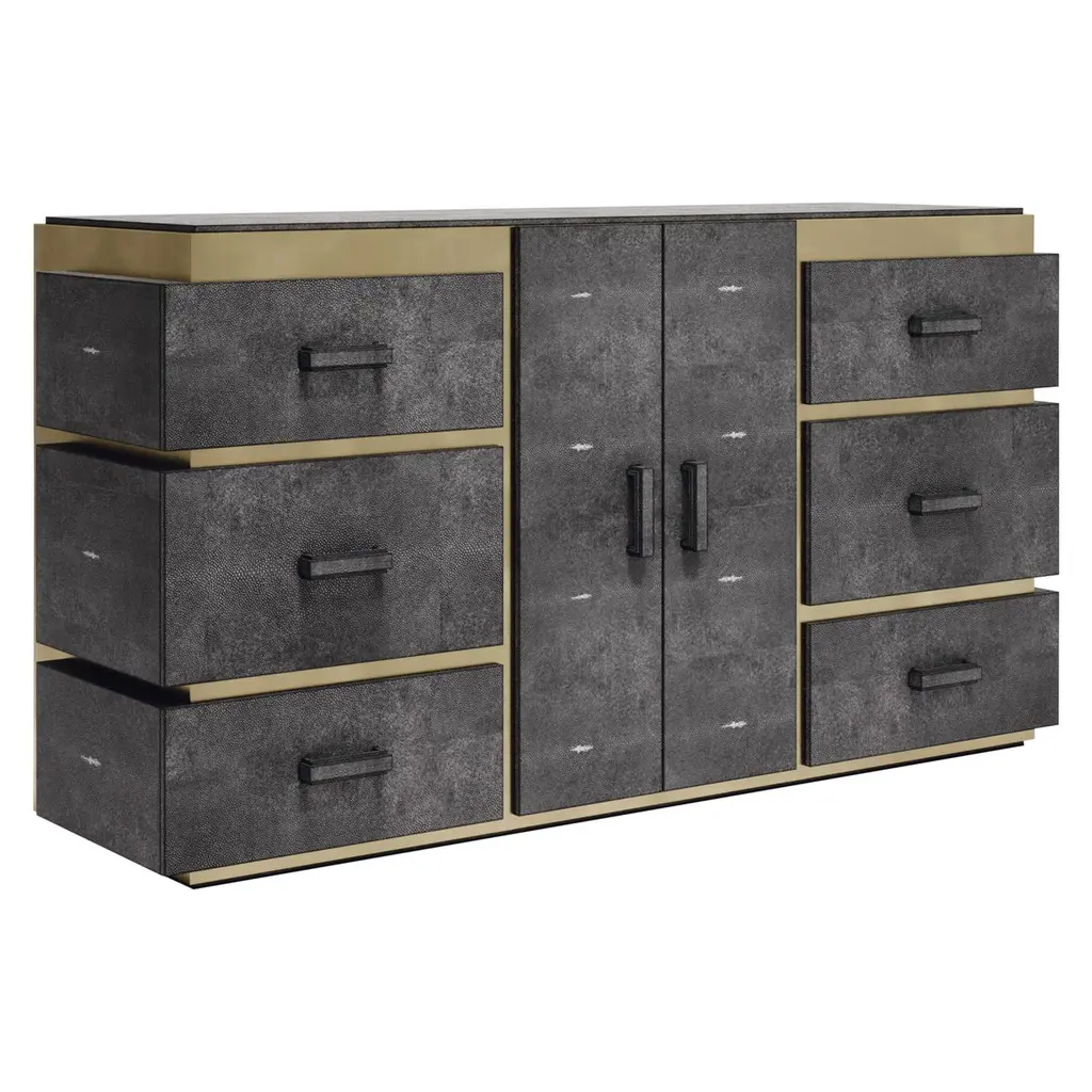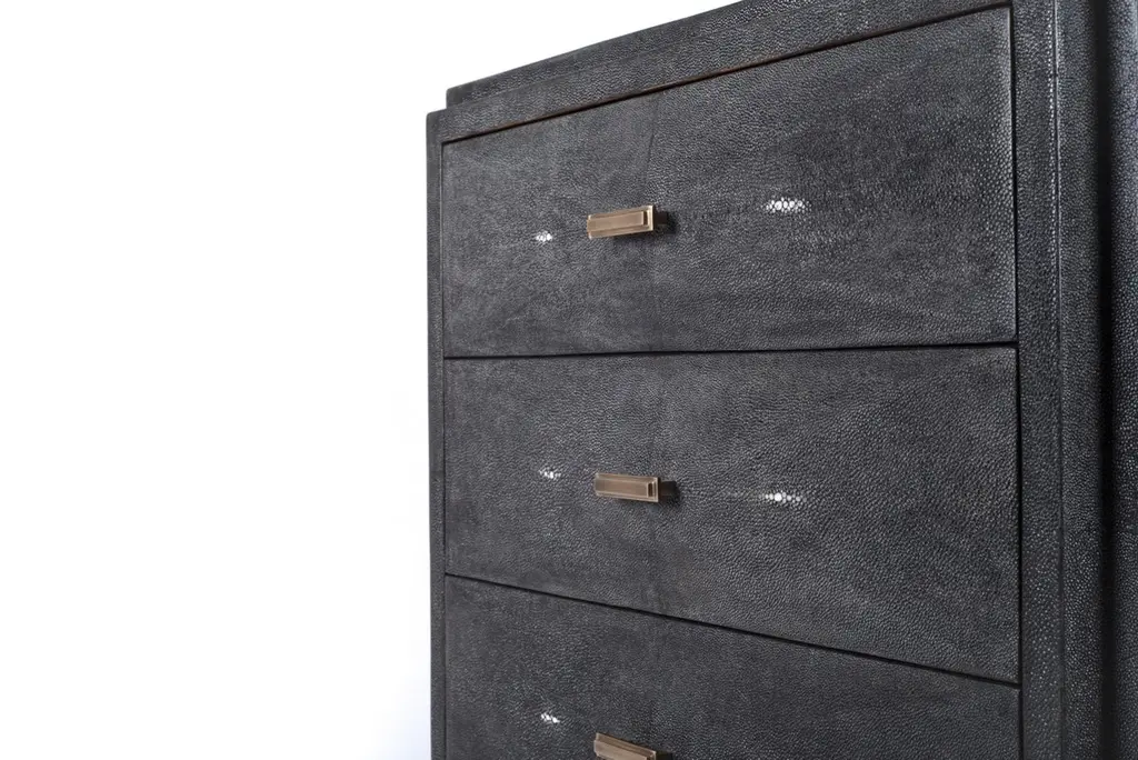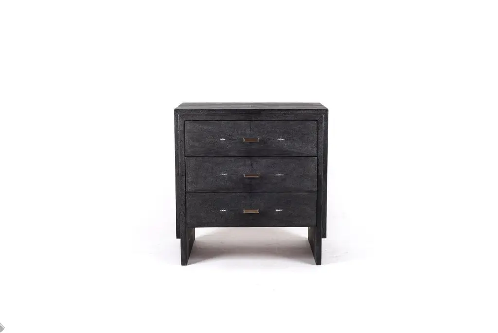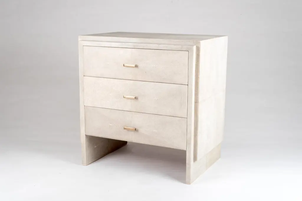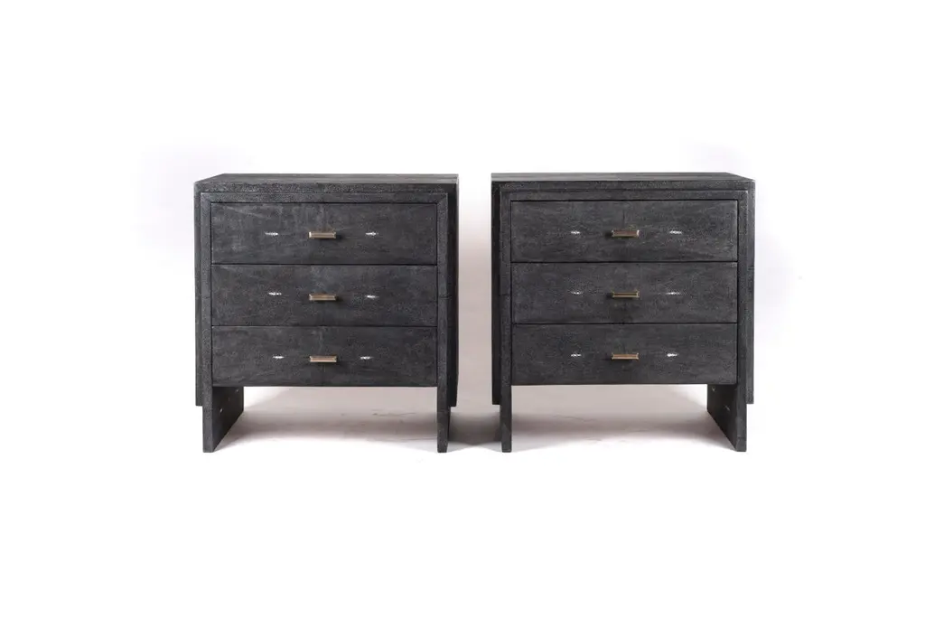 The Paris based label has distinguished themselves since their launch, with their iconic use of shagreen mixed with brass and other exotic materials. All furniture is handcrafted by skilled artisans, ultimately making each piece unique, designed in Paris and produced in the Philippines.The iconic bedside by R&Y Augousti is one of their first designs. A classic and functional bedside table, with subtle geometry on the beveled drawers. This bedside table is completely inlaid in coal black shagreen with discreet bronze-patina brass handles for the drawers. The drawers are inlaid in gemelina wood. This bedside table includes three drawers. This piece is also available in cream shagreen, image at end of slide. Custom color/sizing available on request. The finish of the shagreen is authentic as it is hand-dyed by our artisans and the designer calls this finish 'coal black' shagreen.The dimensions of this piece are 60 x 40 x 60 cm / 23.5" x 15.75" 23.5"All R&Y Augousti pieces are handmade by artisans, ultimately making each piece unique. Wipe clean with soft dry cloth.Acclaimed design duo Ria & Yiouri Augousti have established themselves since the 1990’s as pioneers of modern-vintage style through their luxurious Art Deco inspired collections.The Paris based label has distinguished themselves since their launch, with their iconic use of shagreen mixed with brass and other exotic materials. All furniture is handcrafted by skilled artisans, ultimately making each piece unique. All shagreen-covered items should be kept out of direct sunlight, color variants may occur on the stingray and other exotic finishes, but this showcases the Parisian label's commitment to creating authentic luxurious products using natural components.