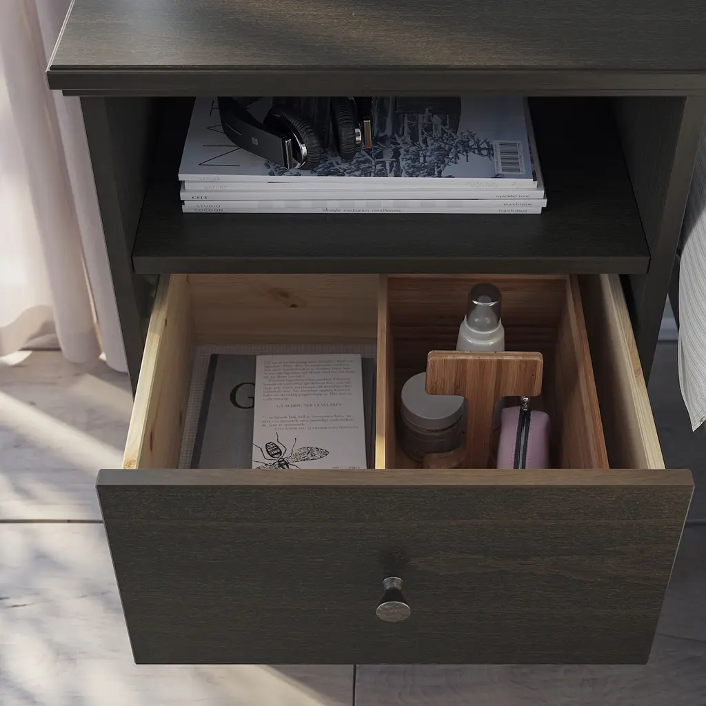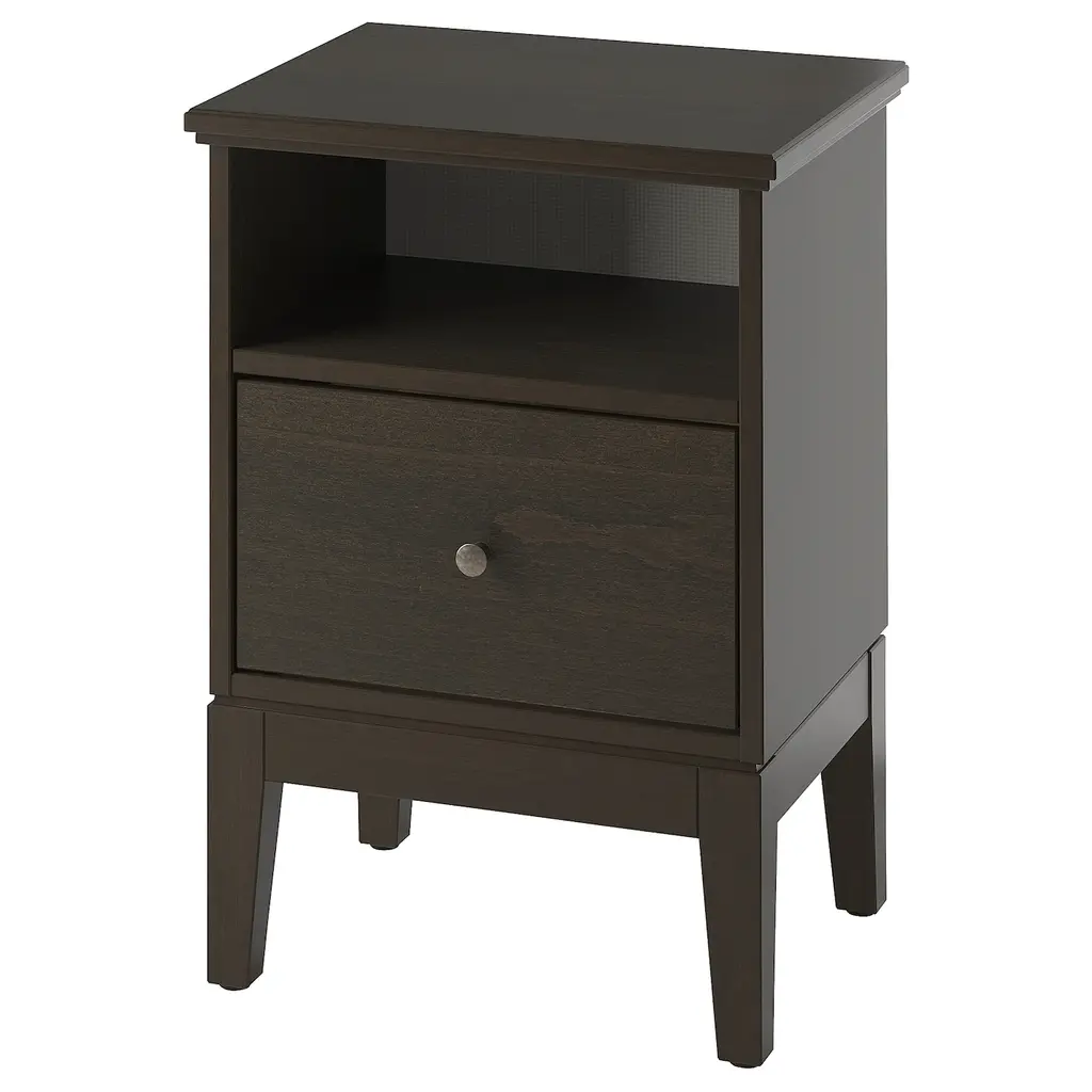 IDANÄS Nightstand - dark brown stained 18 1/2x15 3/4 ". You can run the plug to the outlet through the back. The open shelf makes it easy for you to see and reach your things. The drawers close silently and softly, thanks to the integrated soft-closing function.