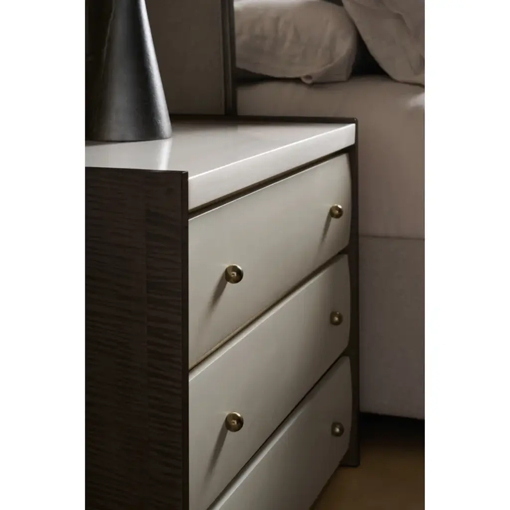 Named for Homer's timeless epic poem, this small-scale nightstand celebrates materiality and simplicity in form. Features an Ivory Craze crackle finish and smoked bronze glass top with three soft-close drawers balanced on a metallic plinth base. Brushed gold pulls with a ripple detail add tactile appeal and a luxe finishing touch.