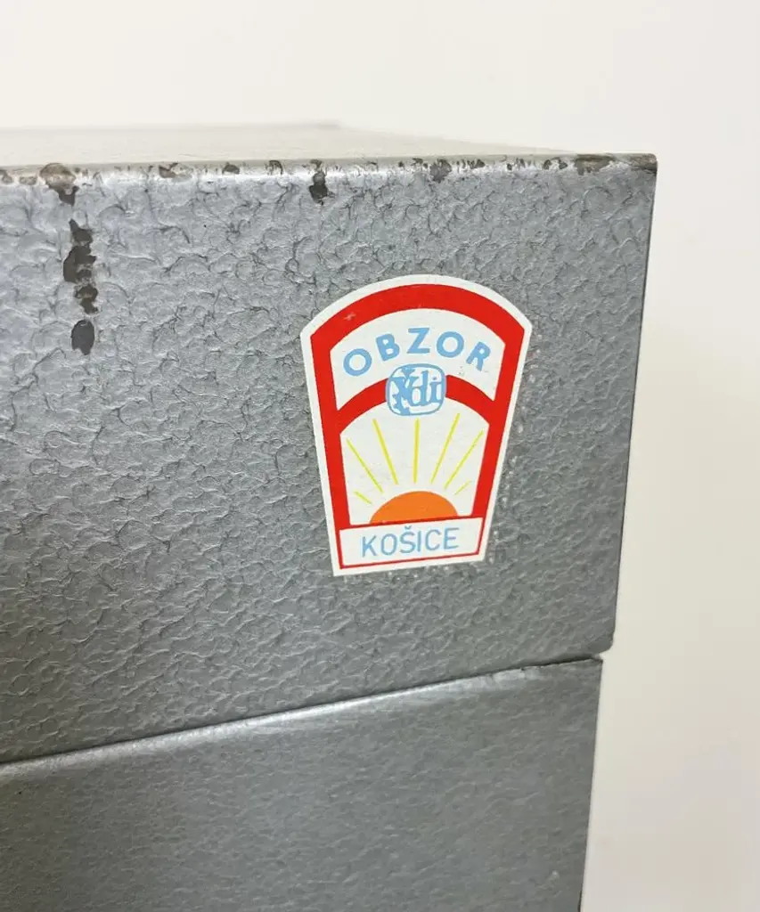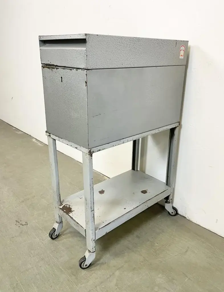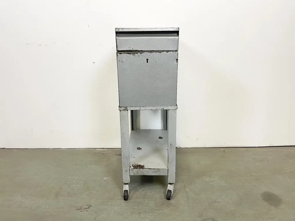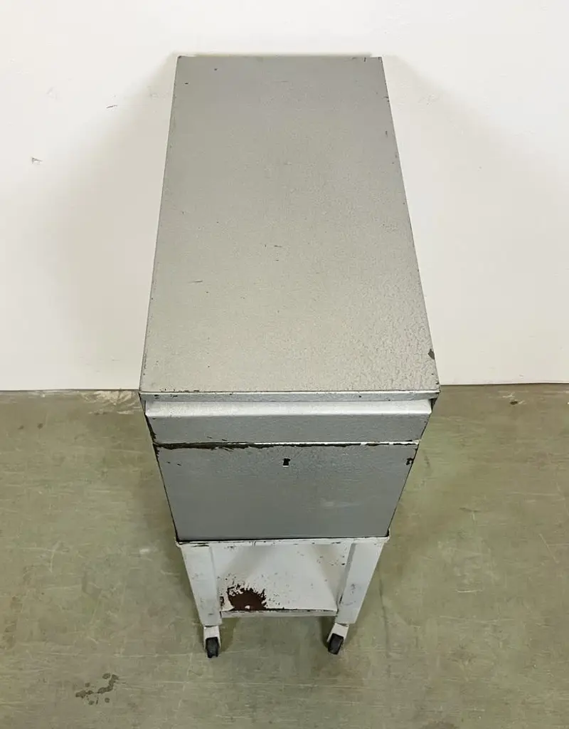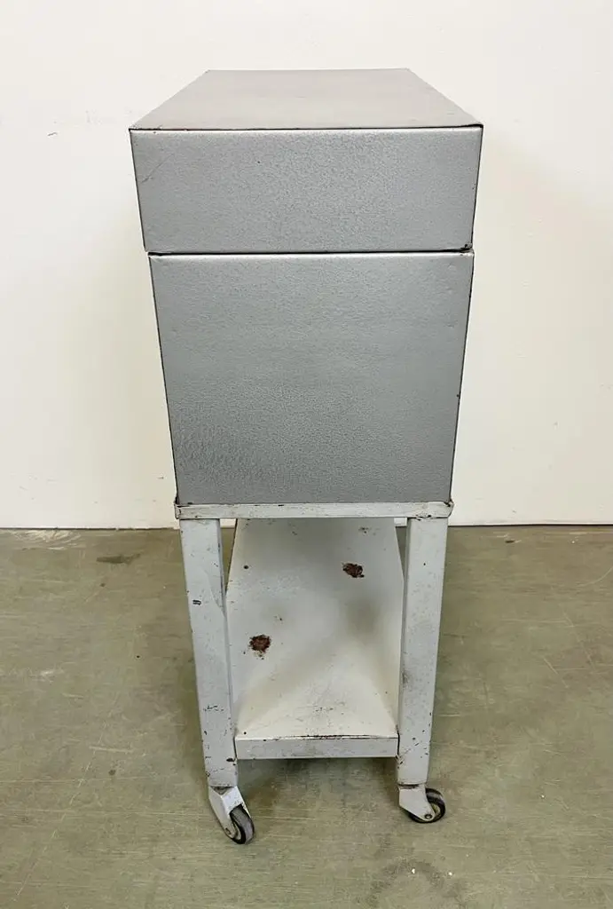Vintage industrial box on wheels, ( former filling cabinet ) ,was made by Obzor Košice in Slovakian part of former Czechoslovakia during the 1960s Now can be serves as a cart bar or nightstand. It features a grey hammerpaint metal box and grey iron construction with four original wheels.