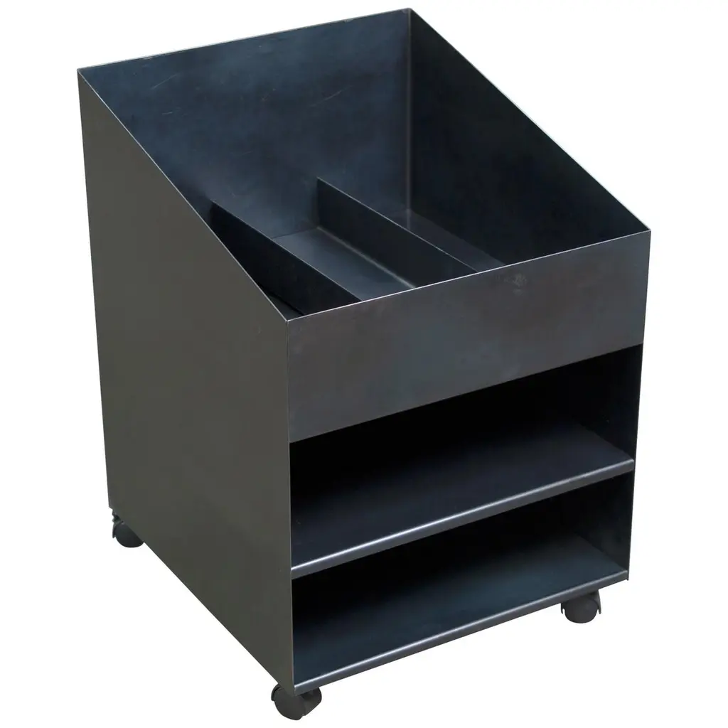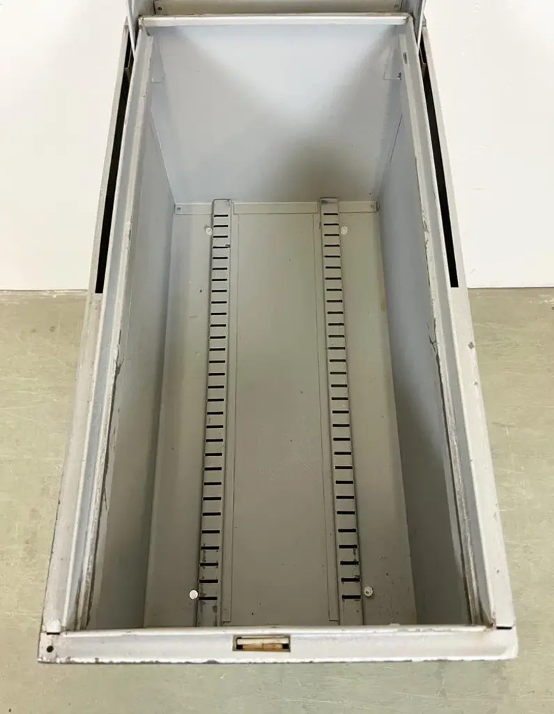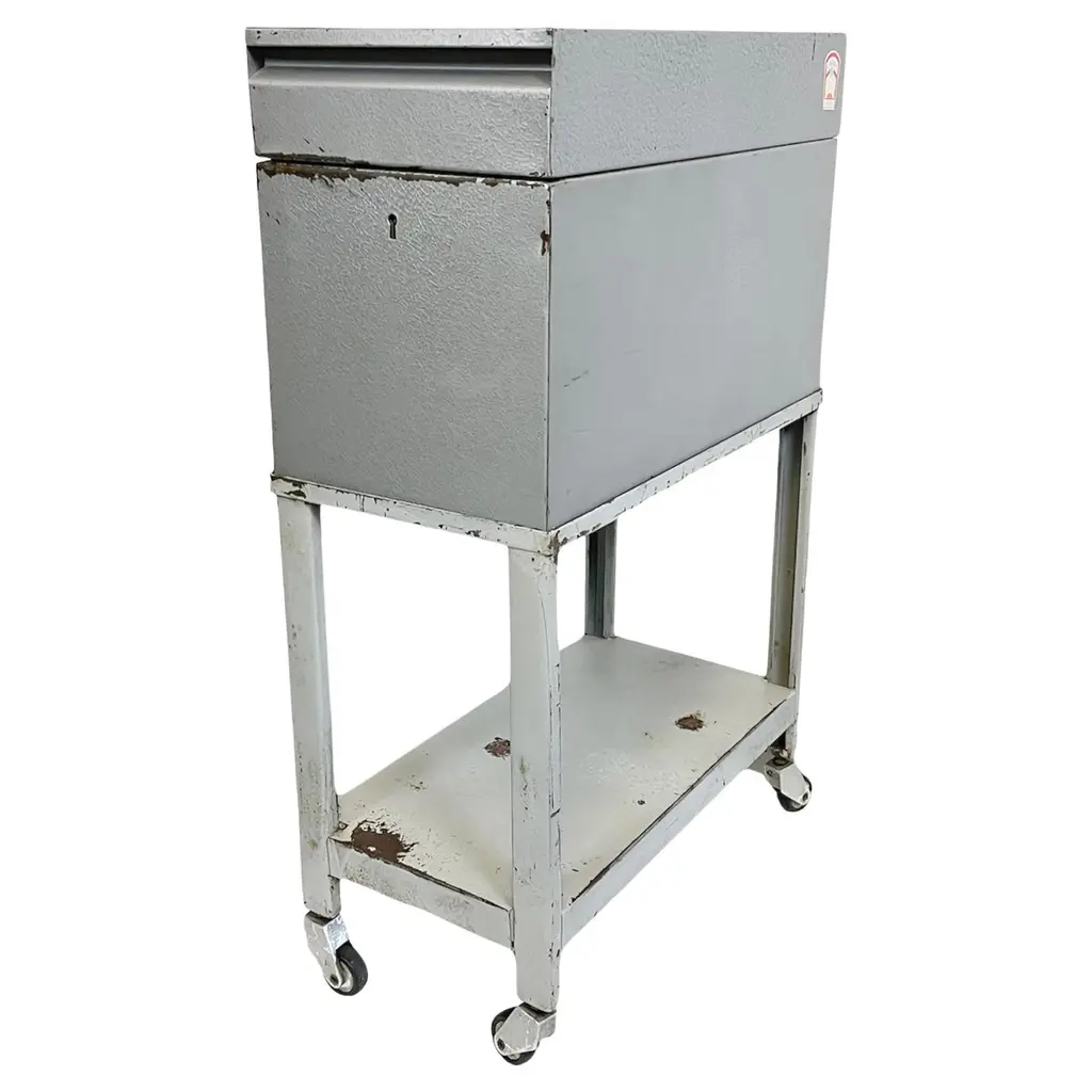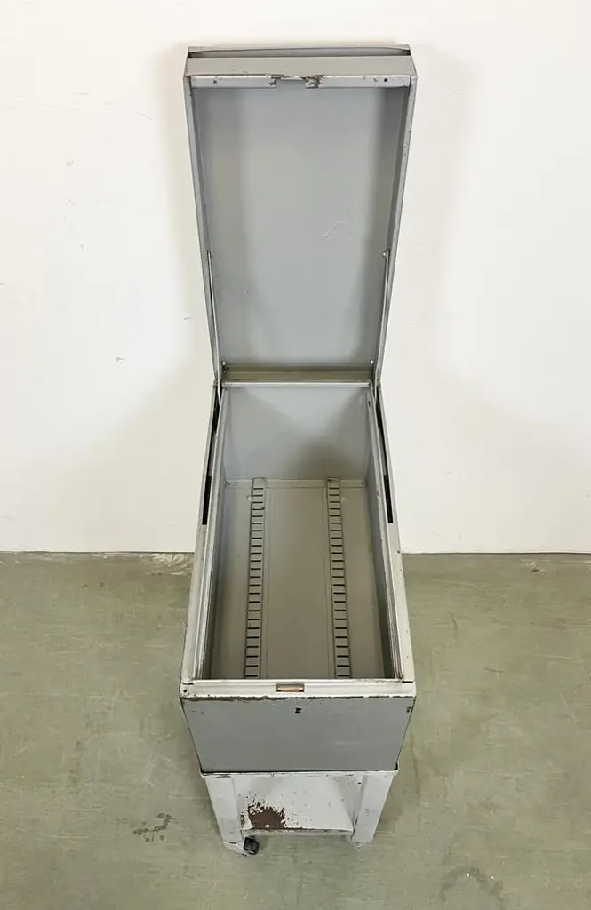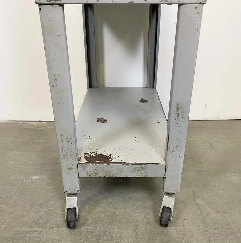 Vintage industrial box on wheels, ( former filling cabinet ) ,was made by Obzor Košice in Slovakian part of former Czechoslovakia during the 1960s Now can be serves as a cart bar or nightstand. It features a grey hammerpaint metal box and grey iron construction with four original wheels.