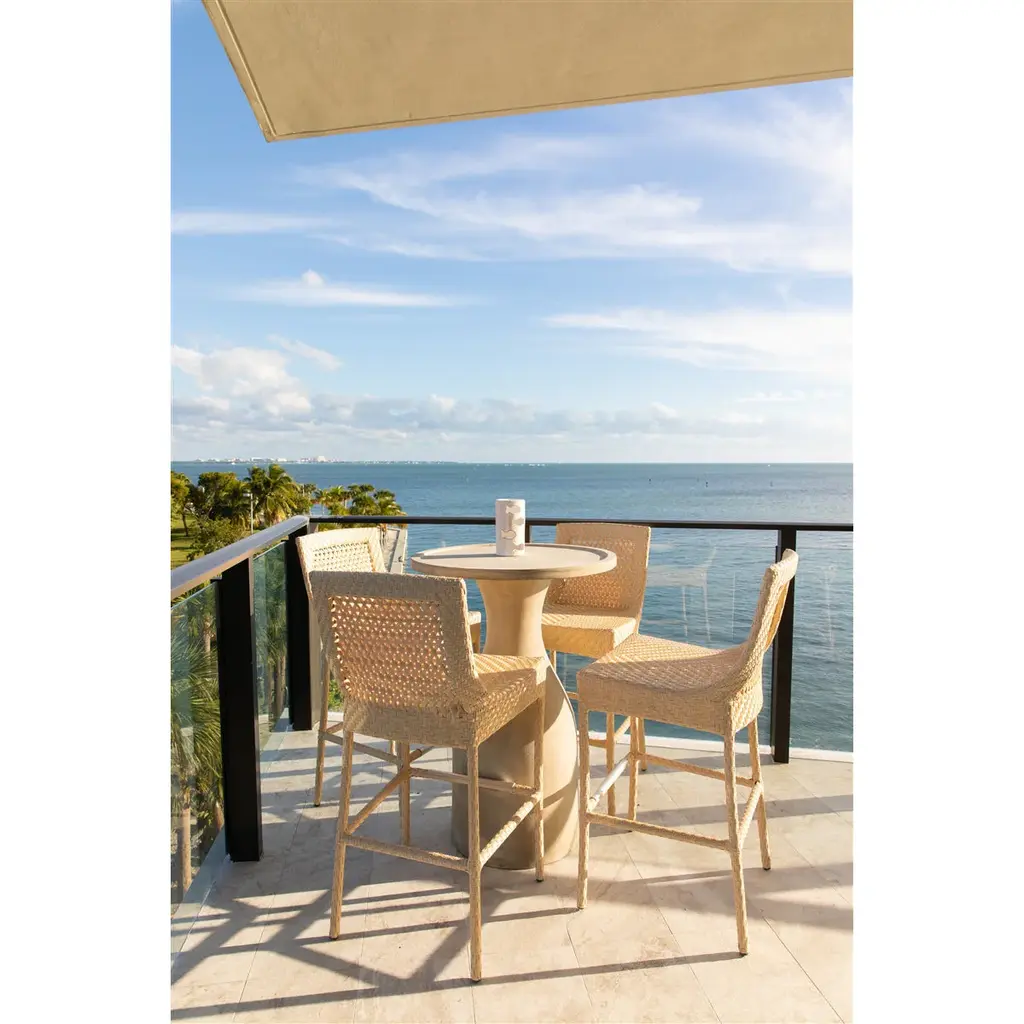 This beautifully sculpted bar table lends a contemporary flair with its' light gray stone finish + overall shape. Adorn with a serving tray or table decor and be ready to entertain in a snap! Feature on a covered patio or deck. Materials like concrete, stone, aluminum, all-weather wicker and resin are durable and able to withstand many outside elements. However, in order to promote longevity consider placing in an outdoor covered area. While not in use, or to shield them from harsh weather, use patio furniture covers. When off season, it's best to store in a sheltered area to help keep your outdoor furniture vibrant + long-lasting.