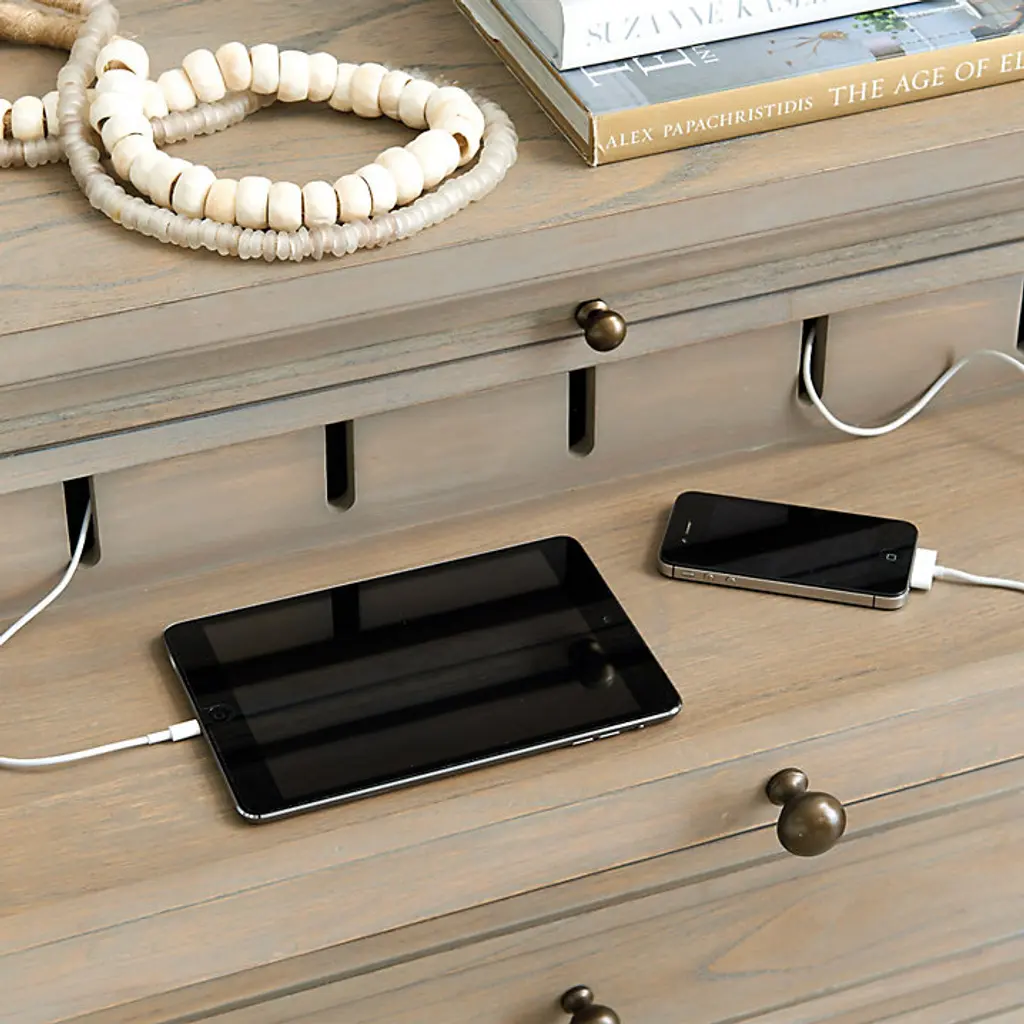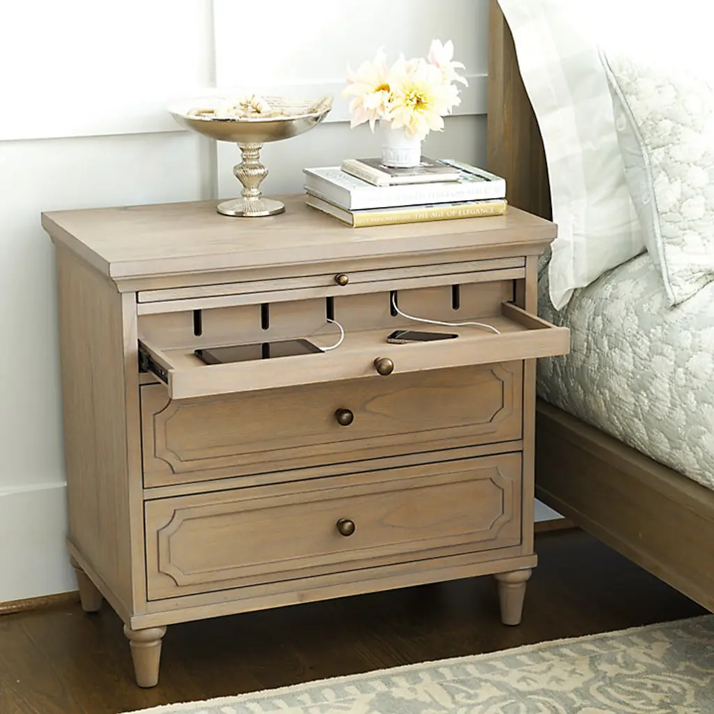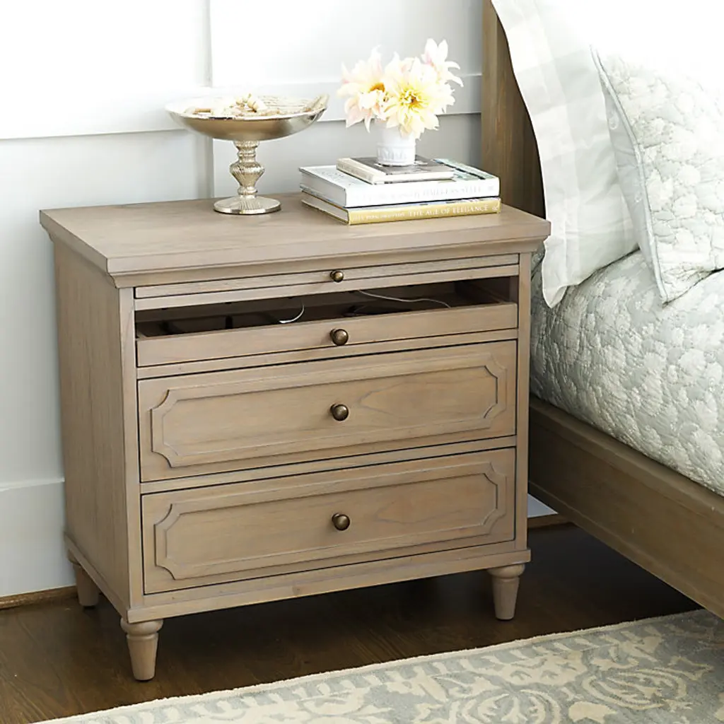 With its European allure, our Isabella collection transforms the bedroom into a romantic retreat. The Nightstand with Charging Station has a pullout drawer with 3-plug extension and one USB power strip to keep electronics charged up and out of sight. Pullout shelf above holds nighttime necessities while two drawers beneath offer generous hidden storage. Isabella Nightstand features: Learn How To Level This Item