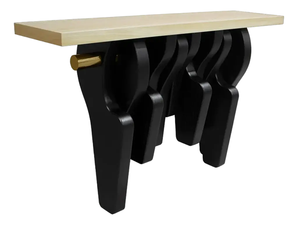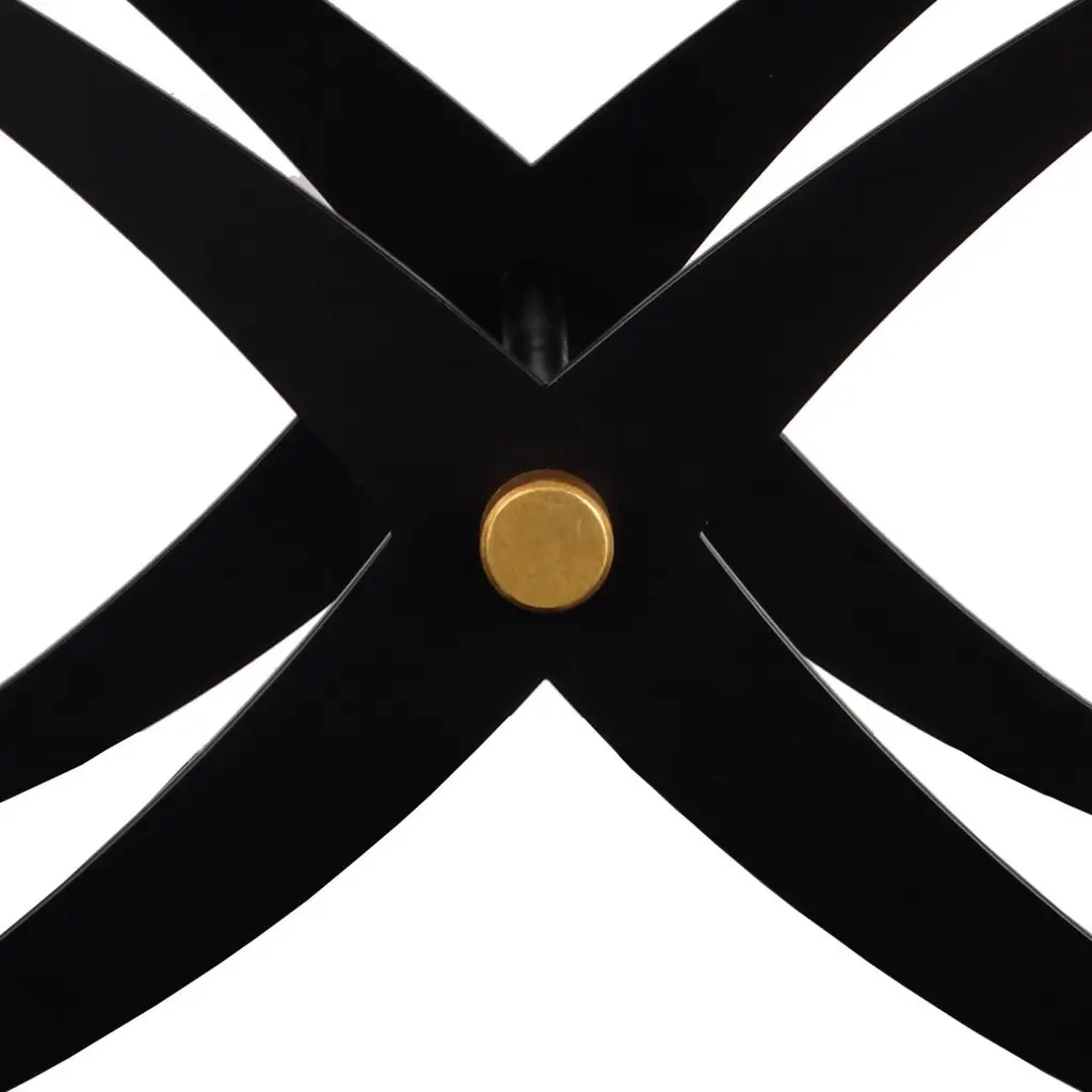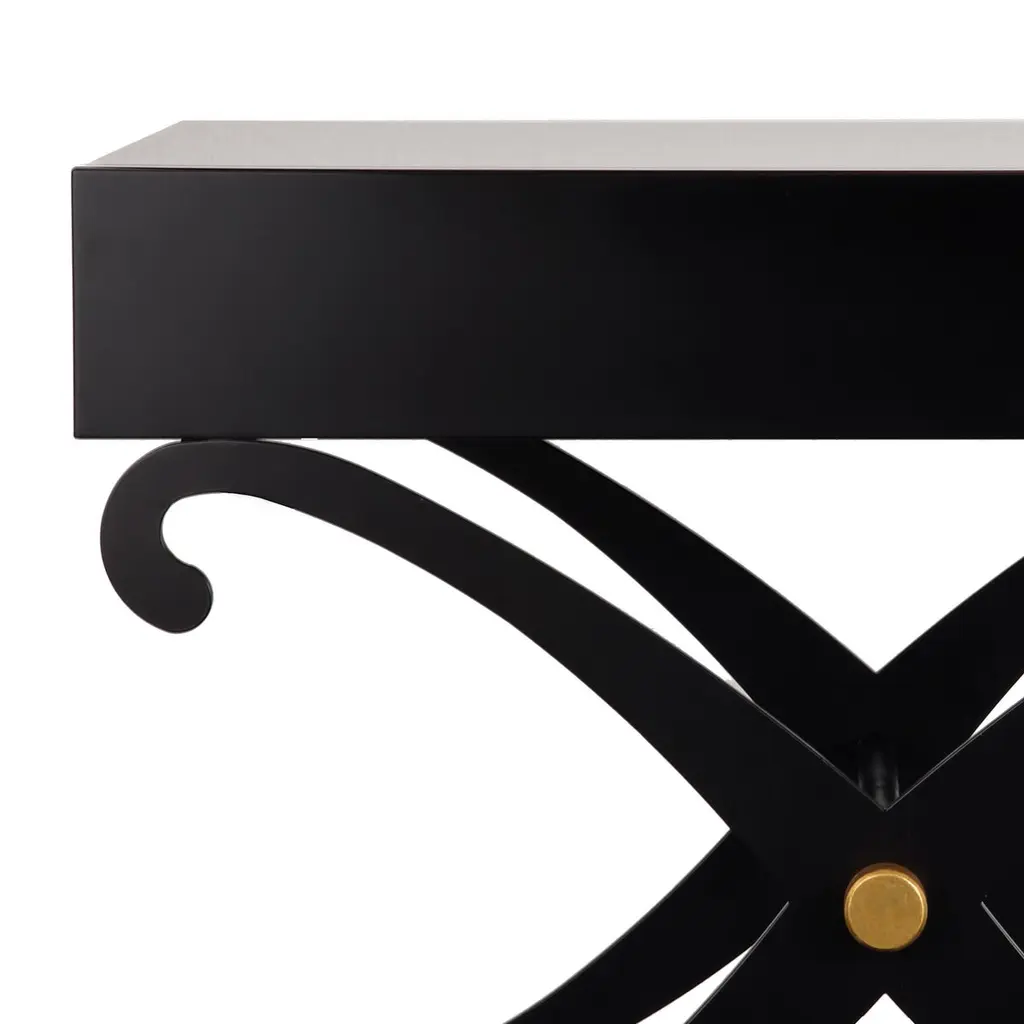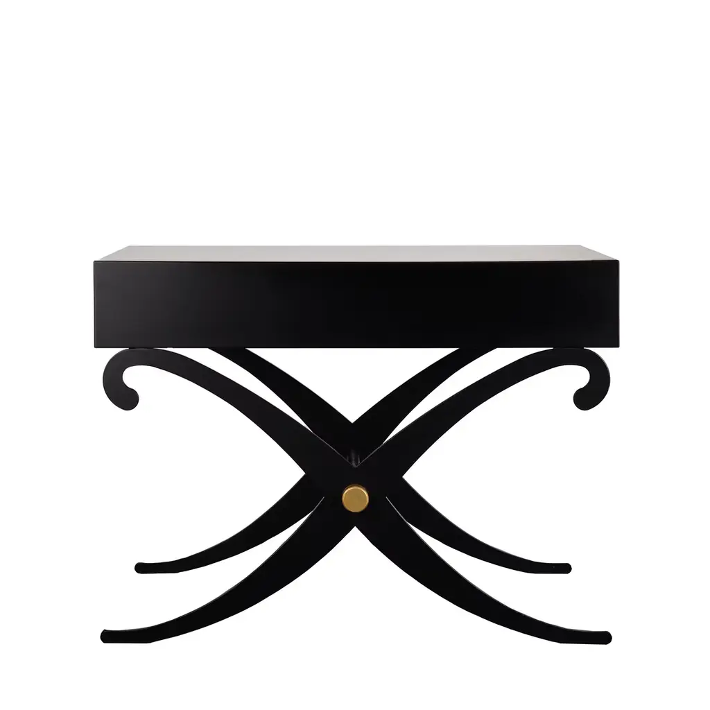 Designed by IC and realized by skilled Italian artisans, the top of the side table is crafted entirely in wood and lays on a curving cross-leg base with gold leaf detail. It is of exemplary quality and can be used either as nightstand or side table.Finish: black lacquered and gold leaf.Dimensions (cm): W 78 x D 52 x H 58.