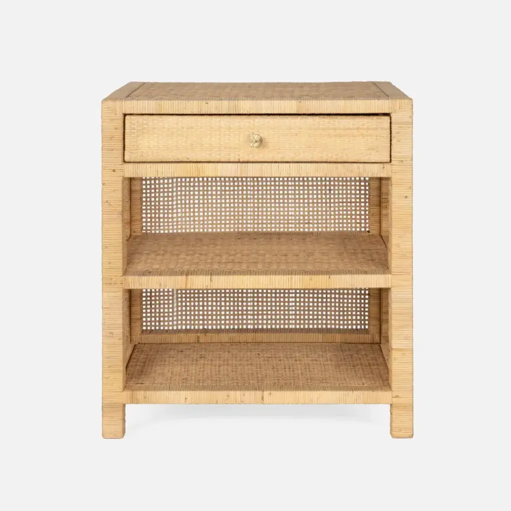 A tightly wrapped, natural peeled rattan frame complements the dense basket weave of the natural peeled rattan top, side, and double shelves. The soft-close drawer is finished with a wood interior and flower-patterned gold knob.