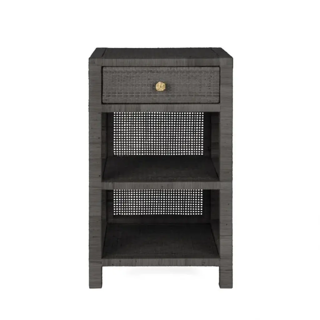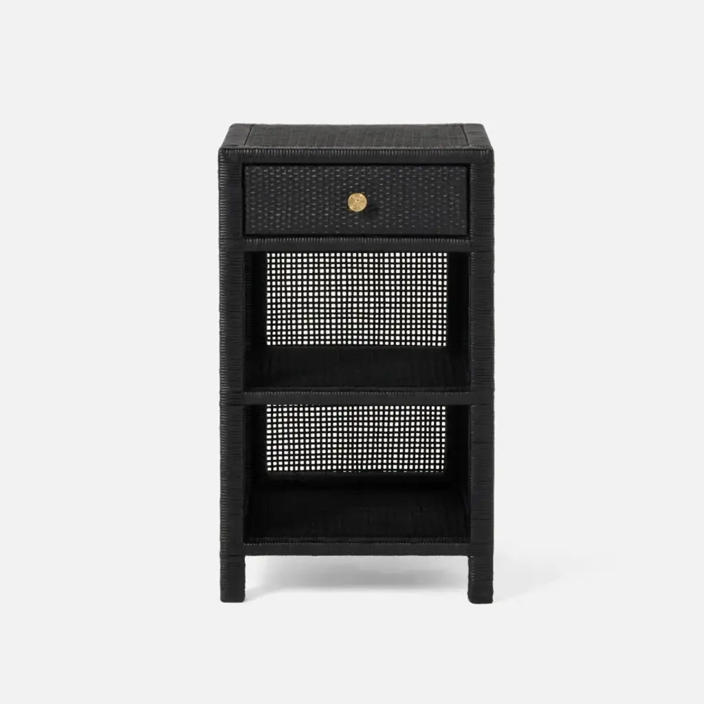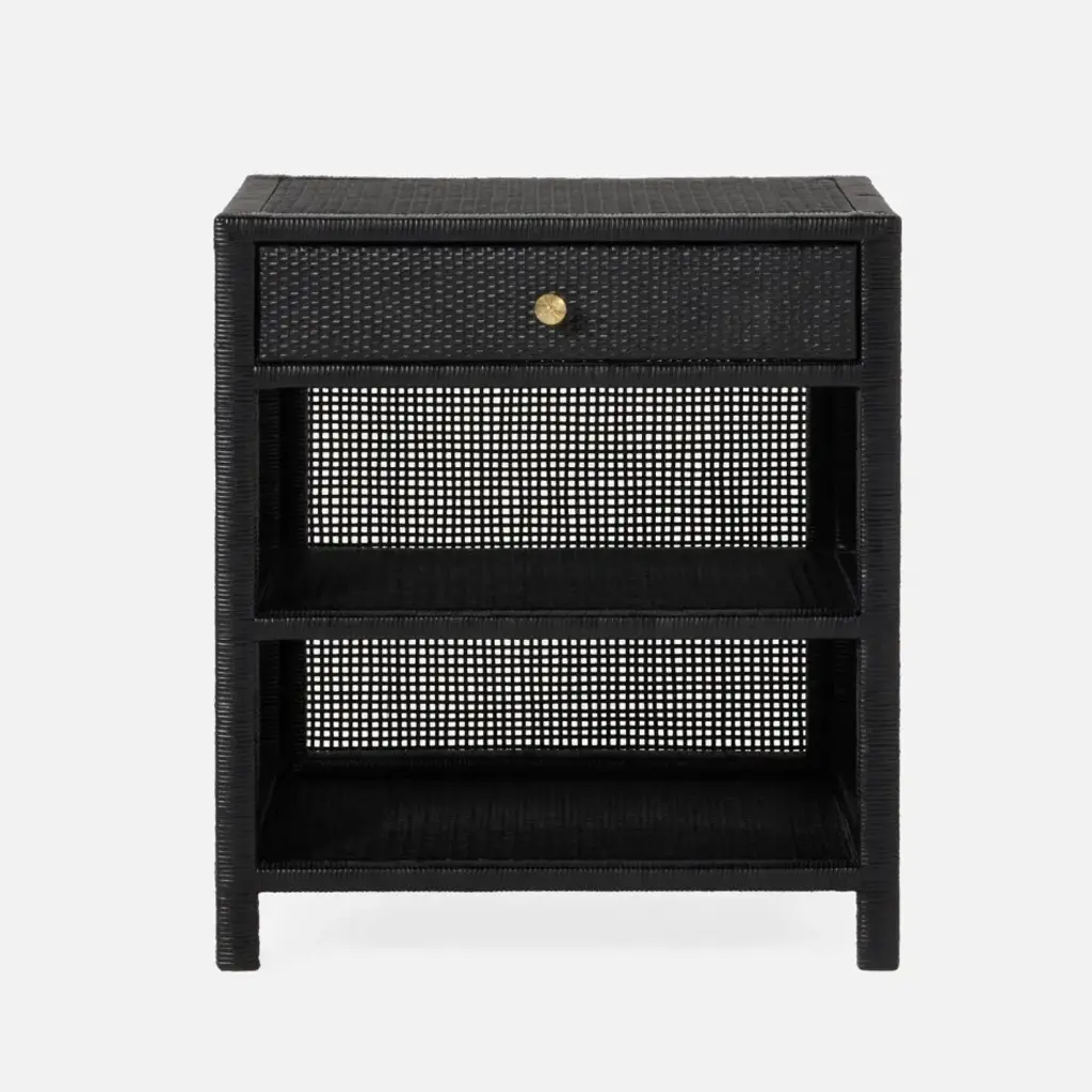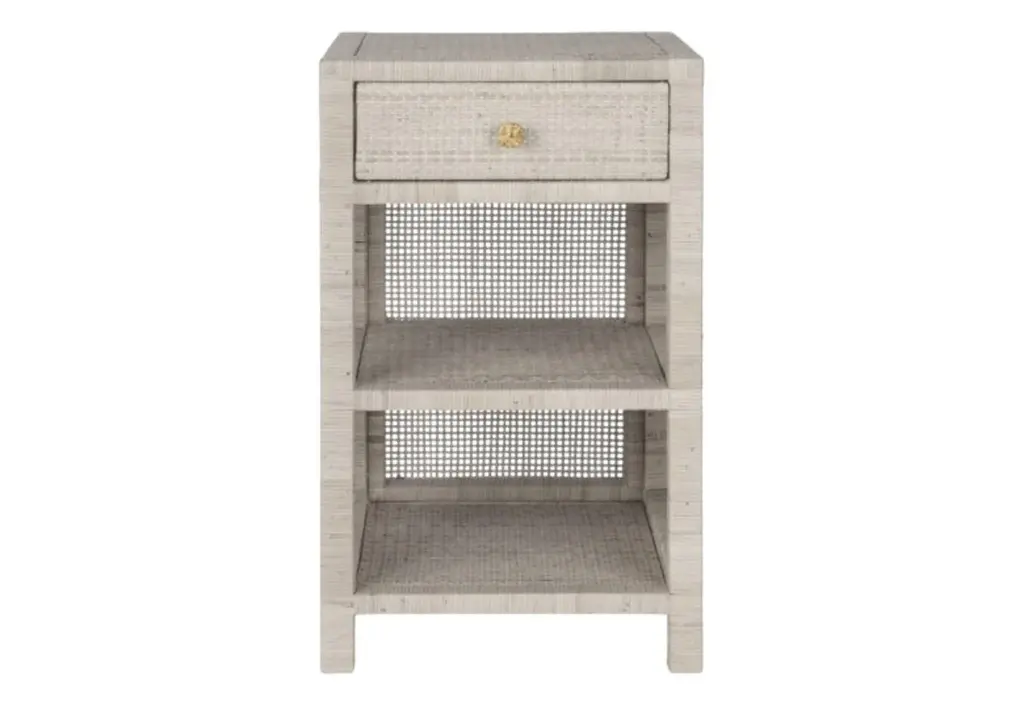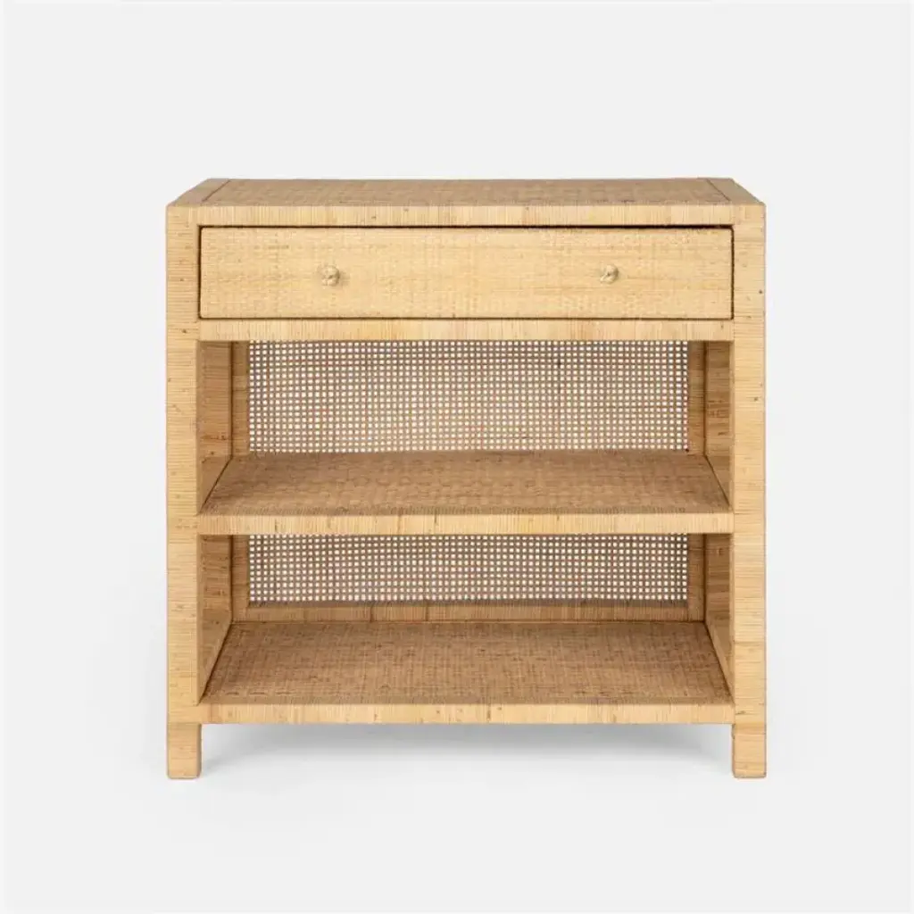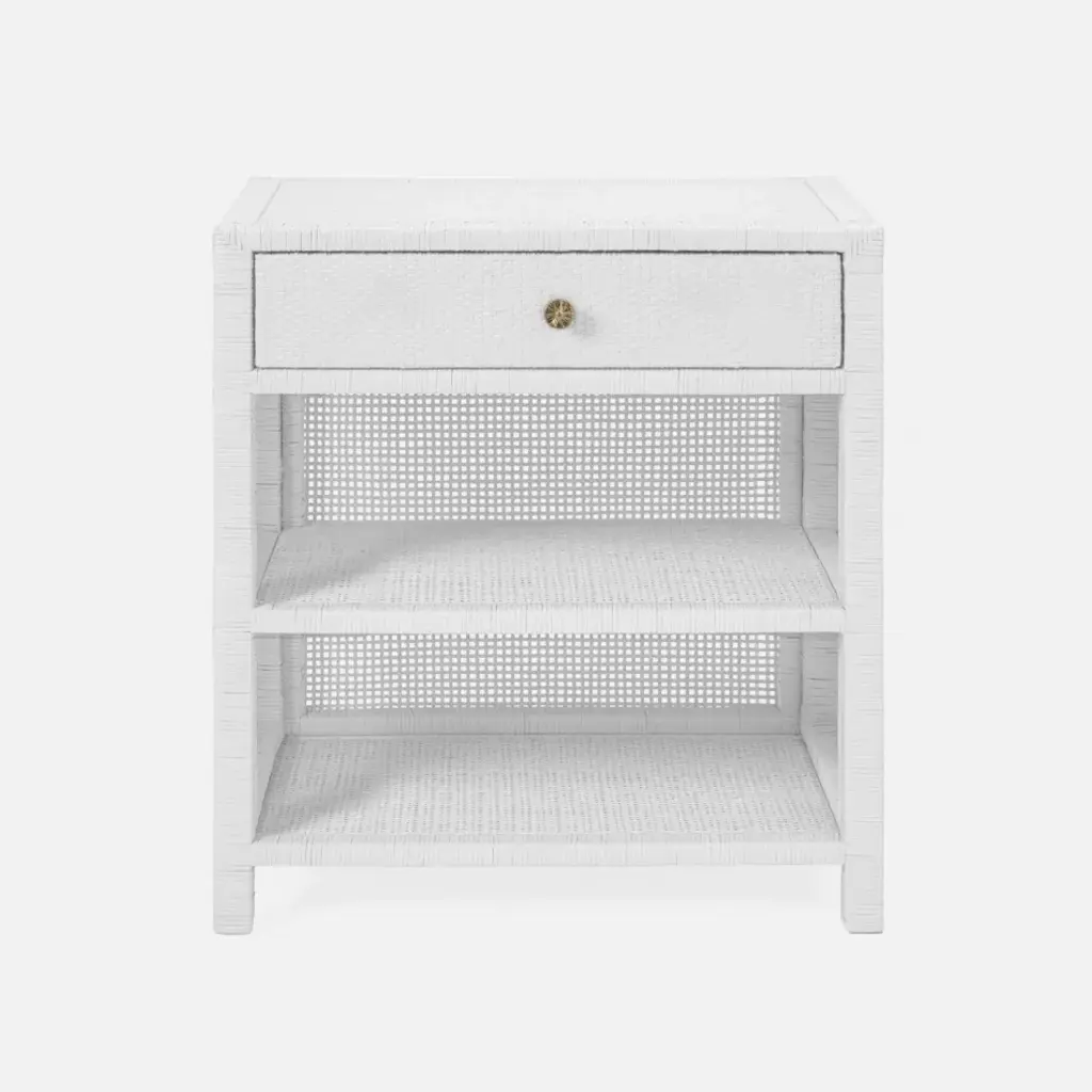 A tightly wrapped, natural peeled rattan frame complements the dense basket weave of the natural, peeled rattan top, side, and double shelves. The soft-close drawer is finished with a wood interior and flower-patterned gold knob. Now available in White!
