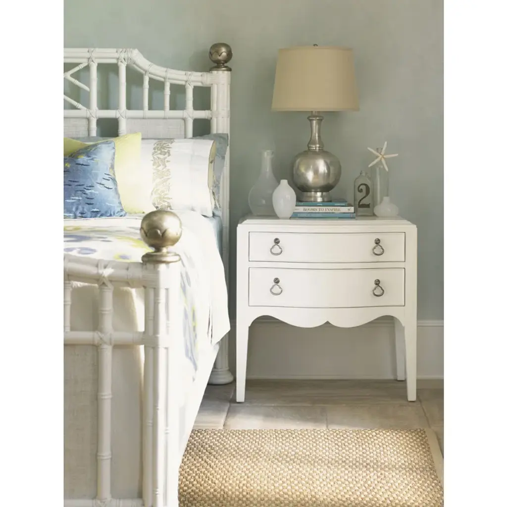 This night table provides bedside storage and ample surface area for lighting and alarm clocks. The crisp white coloration creates the perfect backdrop for the custom hardware that is finished in an aged silver patina.