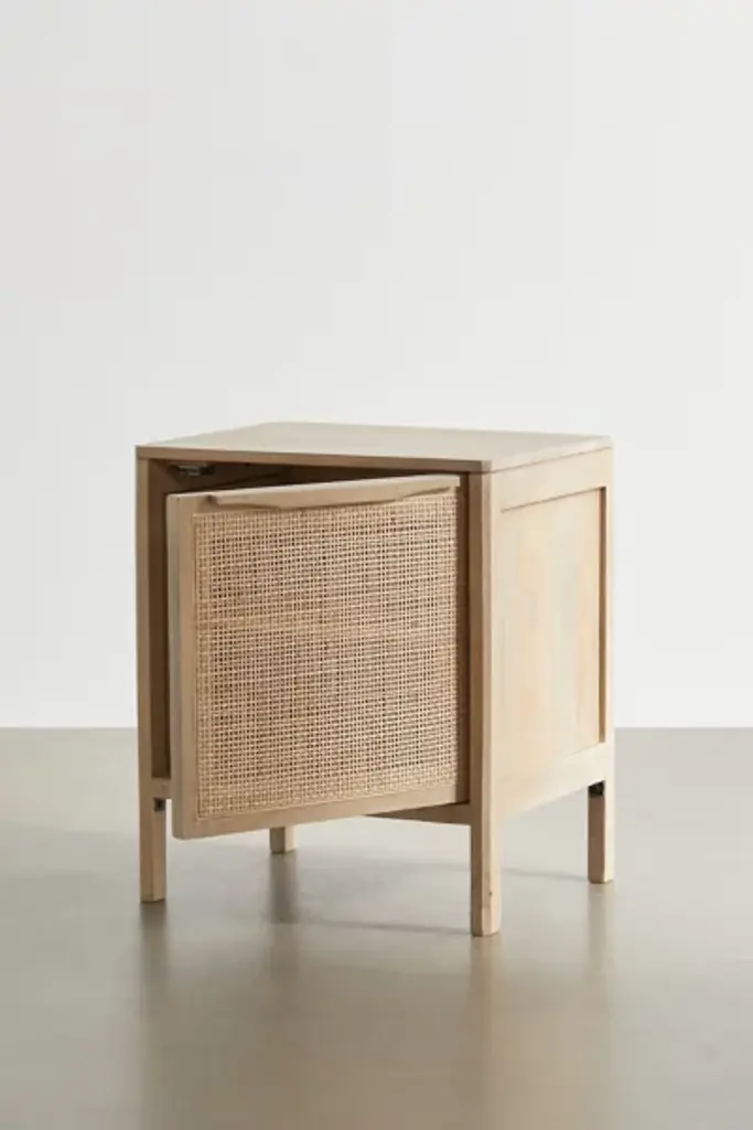 Modern-boho nightstand made from mango wood with a hinged door topped with a woven cane panel that swings open to reveal a bisected, shelved interior. Choose from a Right-Opening nightstand with door hinges placed on the right edge or a Left-Opening nightstand with door hinges placed on the left edge, designed to suit your space perfectly. **Features** \- Statement boho nightstand \- Crafted from mango wood and paned with woven cane \- Customizable to your space with Right or Left-Opening door options **Content + Care** \- Mango wood, cane \- Wipe clean \- Imported **Size** \- Dimensions: 20"l x 16"w x 23.5"h \- Shelf dimensions: 18"l x 13"w \- Leg height/clearance: 5.5" \- Weight limit: 121 lbs \- Weight: 30.86 lbs \- Shipping package dimensions: 23.5"l x 19.5"w x 28"h \- Shipping package weight: 43.43 lbs
