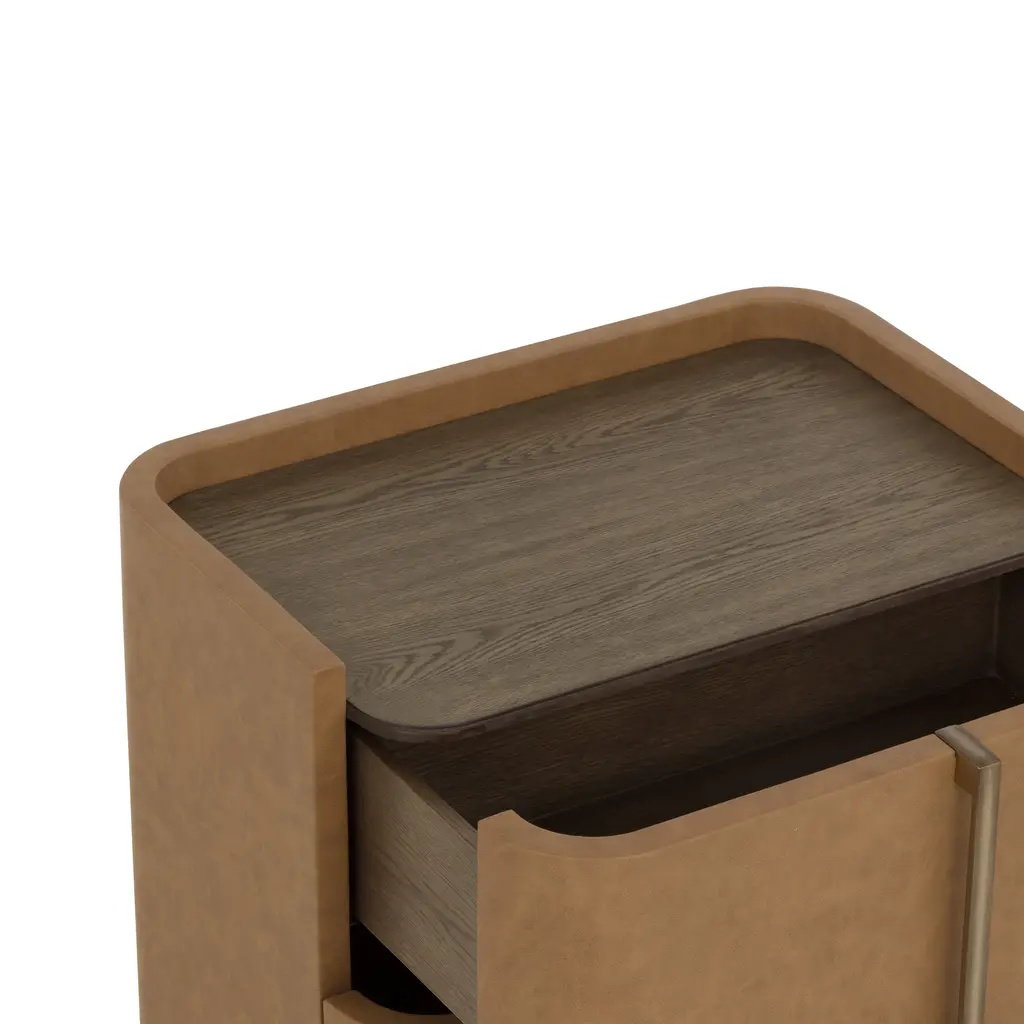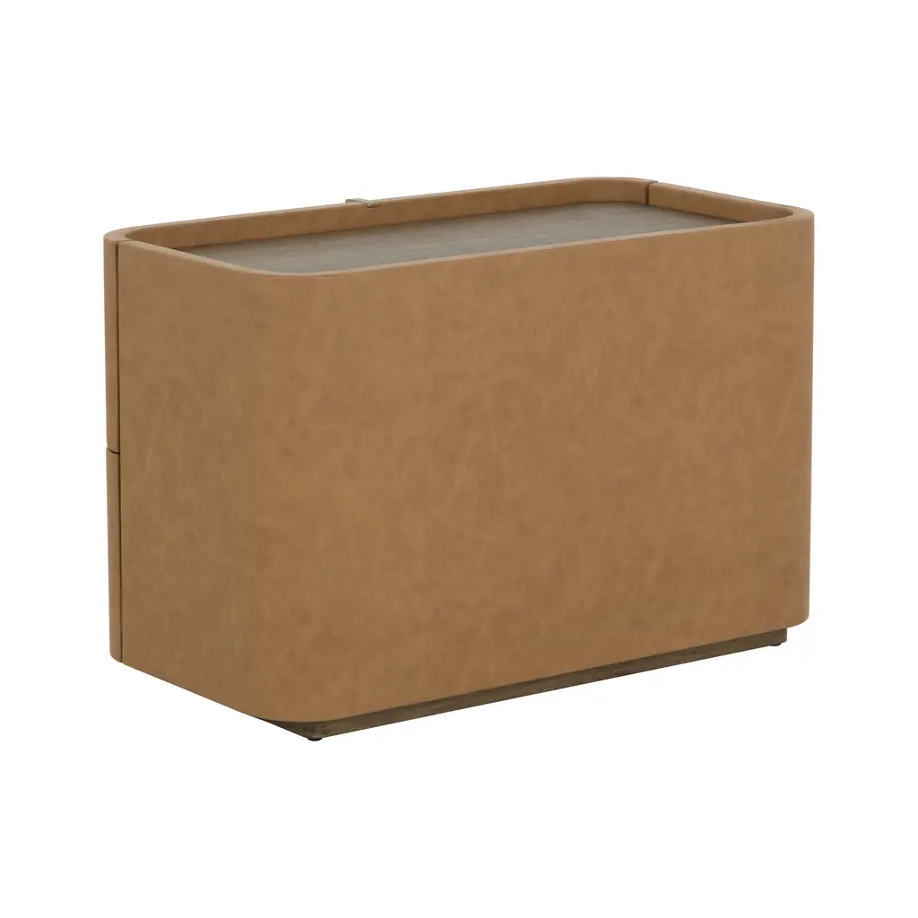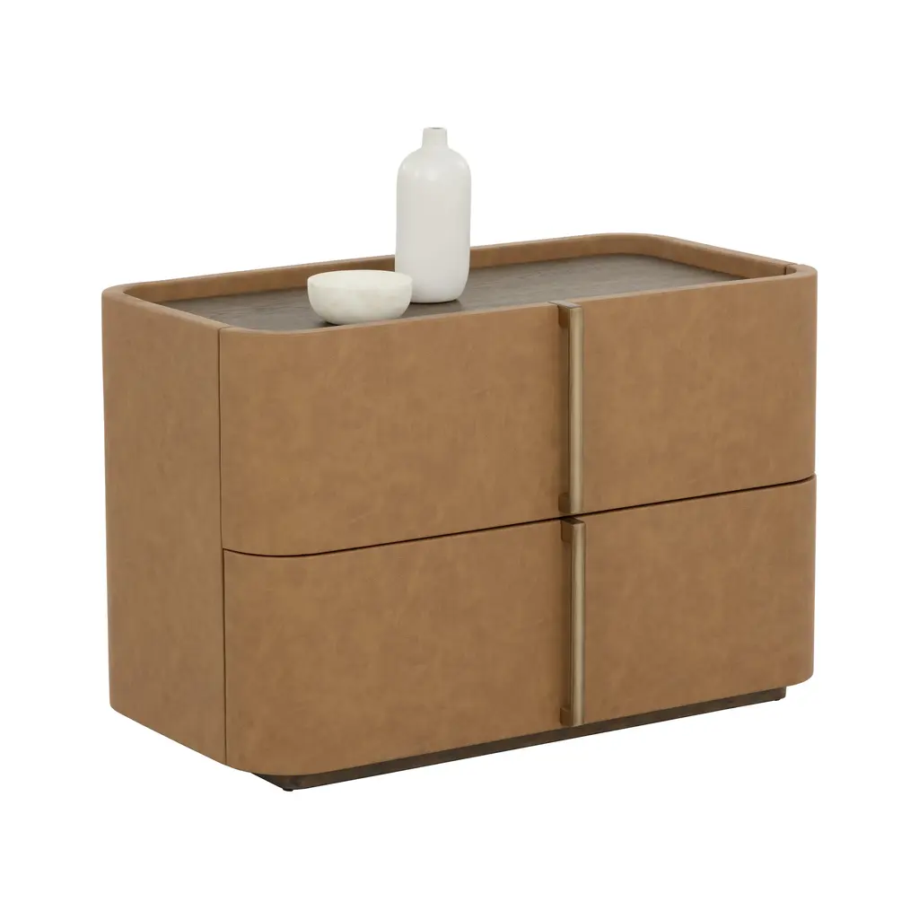 The Jamille Nightstand from Sunpan exudes elegance with its gentle curves and versatile cream faux leather exterior. The brown oak veneer tabletop and warm brass steel base add a touch of sophistication. Featuring two drawers for storage, this nightstand is a stunning addition to any bedroom. Please note that faux leather's unique characteristics, such as color variations, markings, and light scratches, only enhance its natural beauty. Highlights
