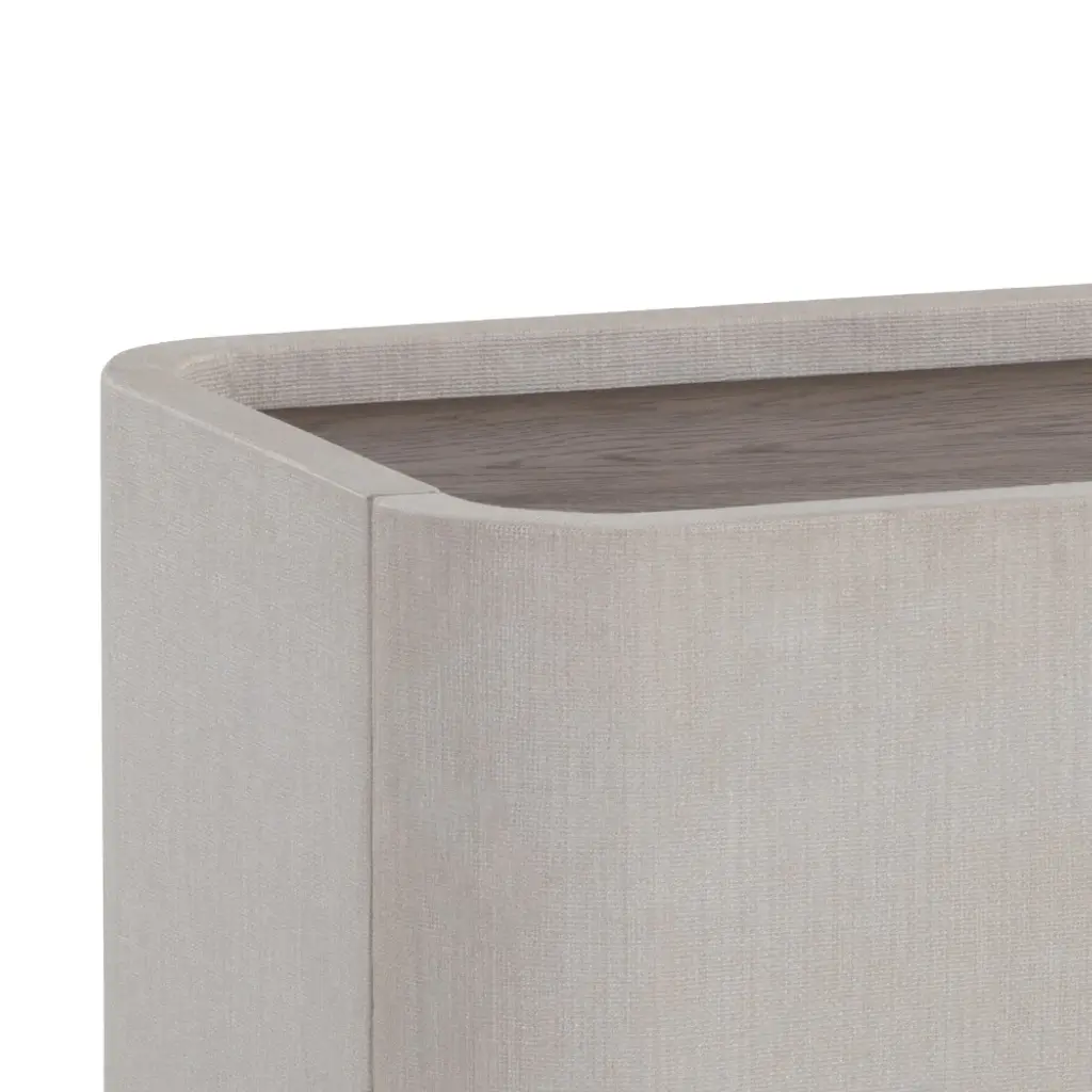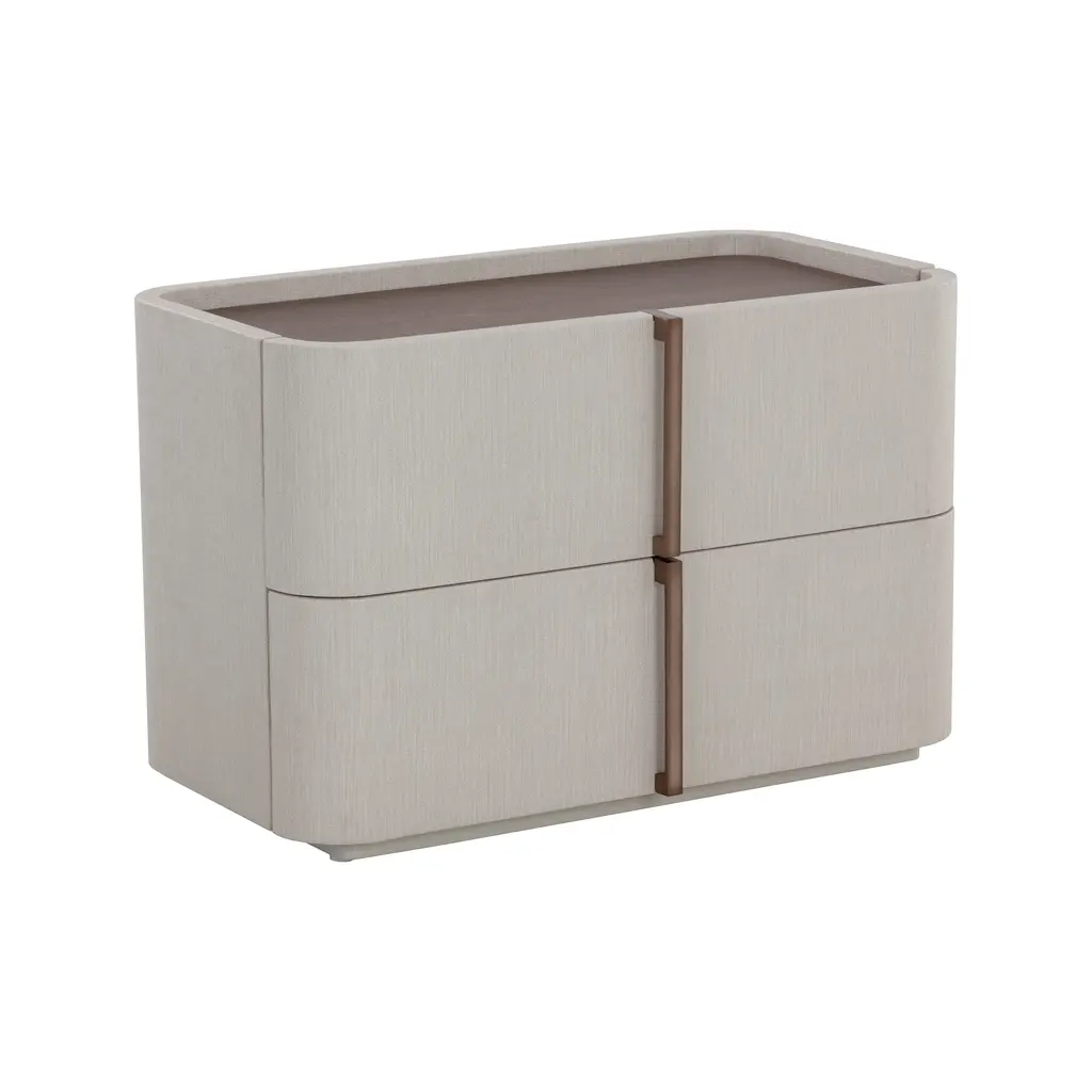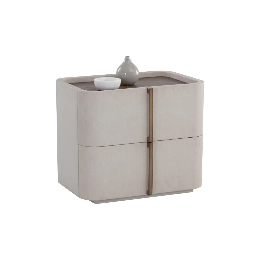 The Jamille Nightstand from Sunpan exudes elegance with its gentle curves and versatile cream faux leather exterior. The brown oak veneer tabletop and warm brass steel base add a touch of sophistication. Featuring two drawers for storage, this nightstand is a stunning addition to any bedroom. Please note that faux leather's unique characteristics, such as color variations, markings, and light scratches, only enhance its natural beauty. Highlights