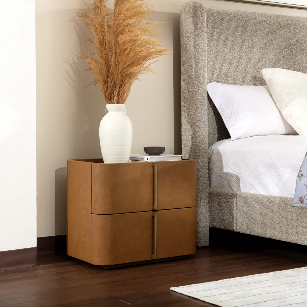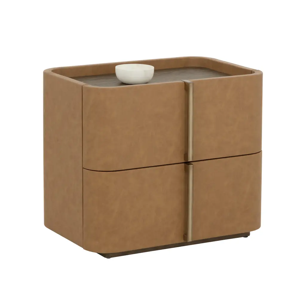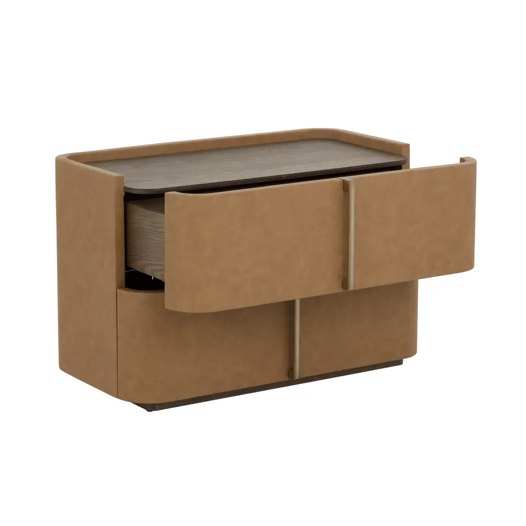The Jamille Nightstand from Sunpan exudes elegance with its gentle curves and versatile cream faux leather exterior. The brown oak veneer tabletop and warm brass steel base add a touch of sophistication. Featuring two drawers for storage, this nightstand is a stunning addition to any bedroom. Please note that faux leather's unique characteristics, such as color variations, markings, and light scratches, only enhance its natural beauty. Highlights