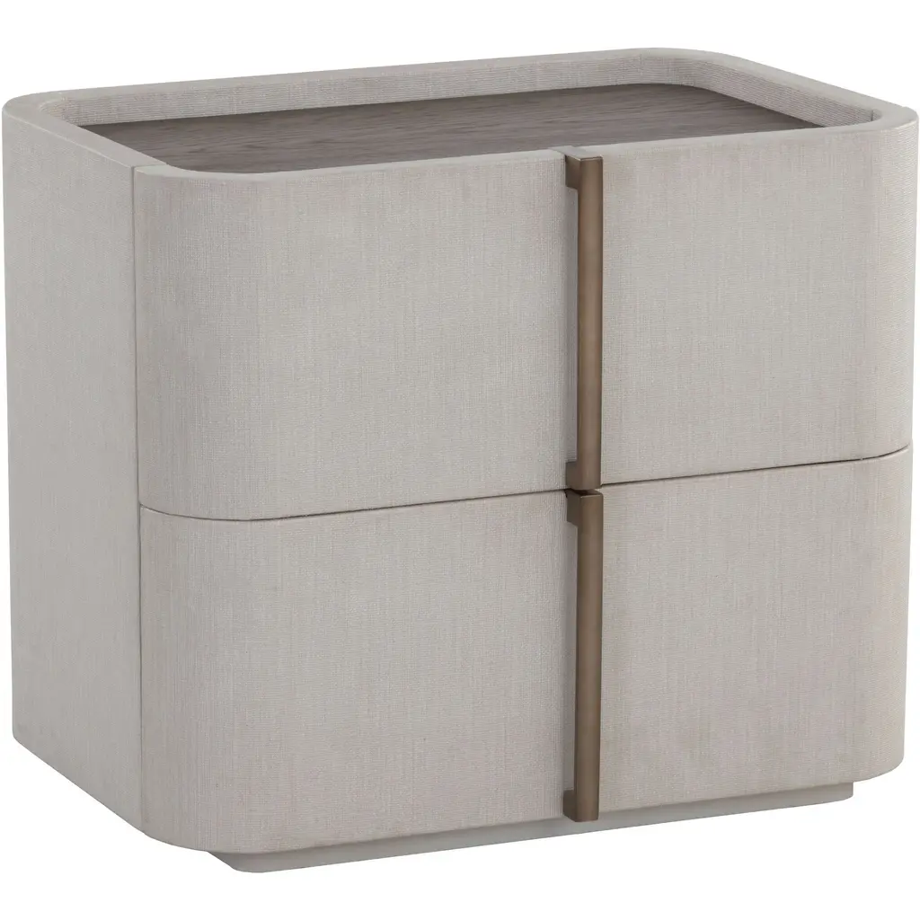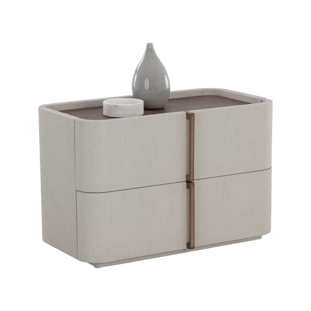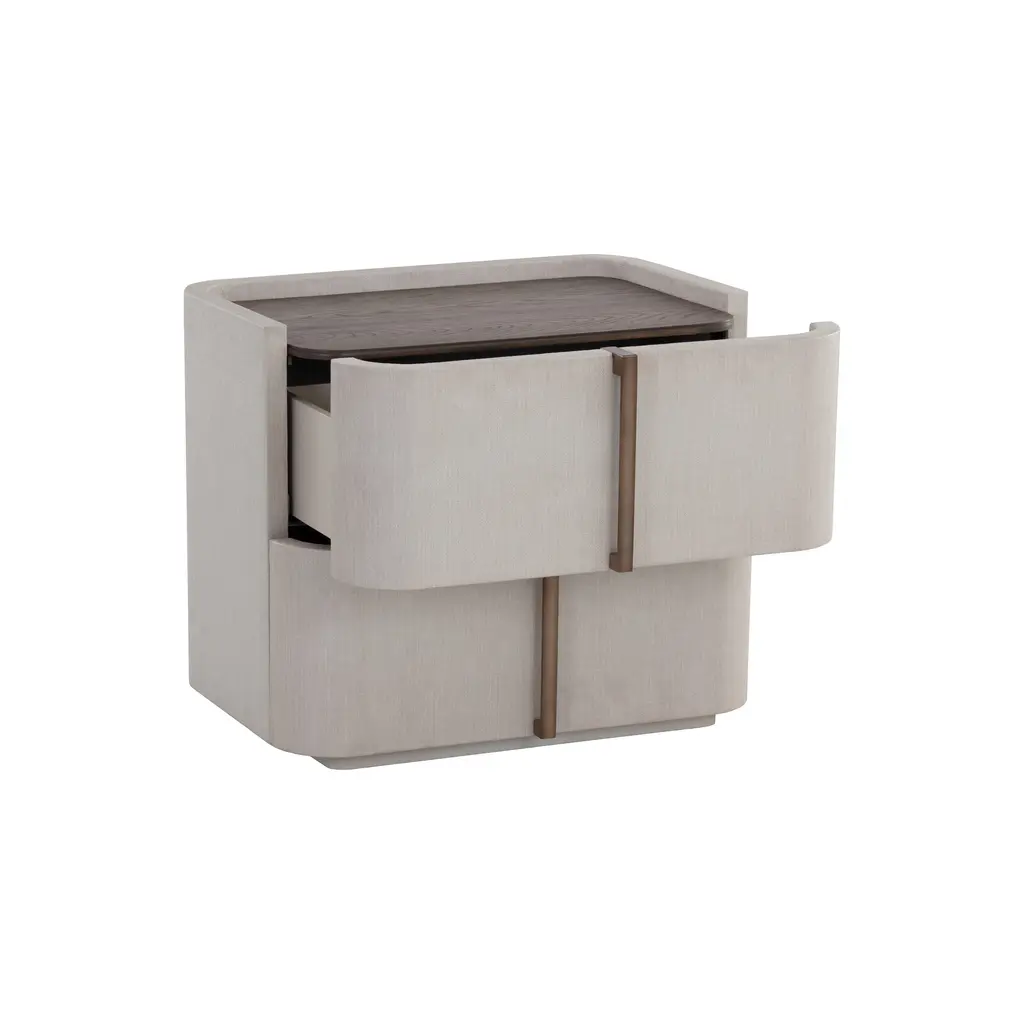 The Jamille Nightstand from Sunpan exudes elegance with its gentle curves and versatile cream faux leather exterior. The brown oak veneer tabletop and warm brass steel base add a touch of sophistication. Featuring two drawers for storage, this nightstand is a stunning addition to any bedroom. Please note that faux leather's unique characteristics, such as color variations, markings, and light scratches, only enhance its natural beauty. Highlights