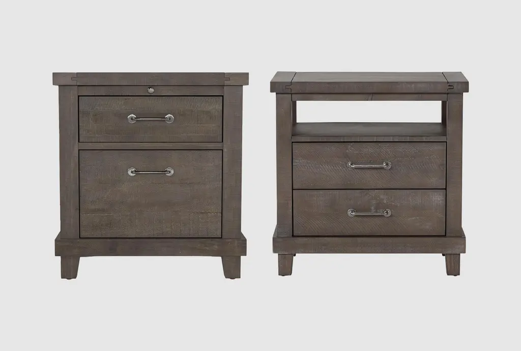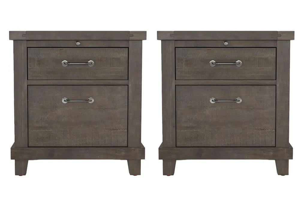The Jaxon Grey Wood 2-Drawer Nightstand Set Of 2 is a perfect addition to your bedroom. Crafted from solid pine, these nightstands offer both durability and style. The natural grey finish complements a variety of bedroom decors.