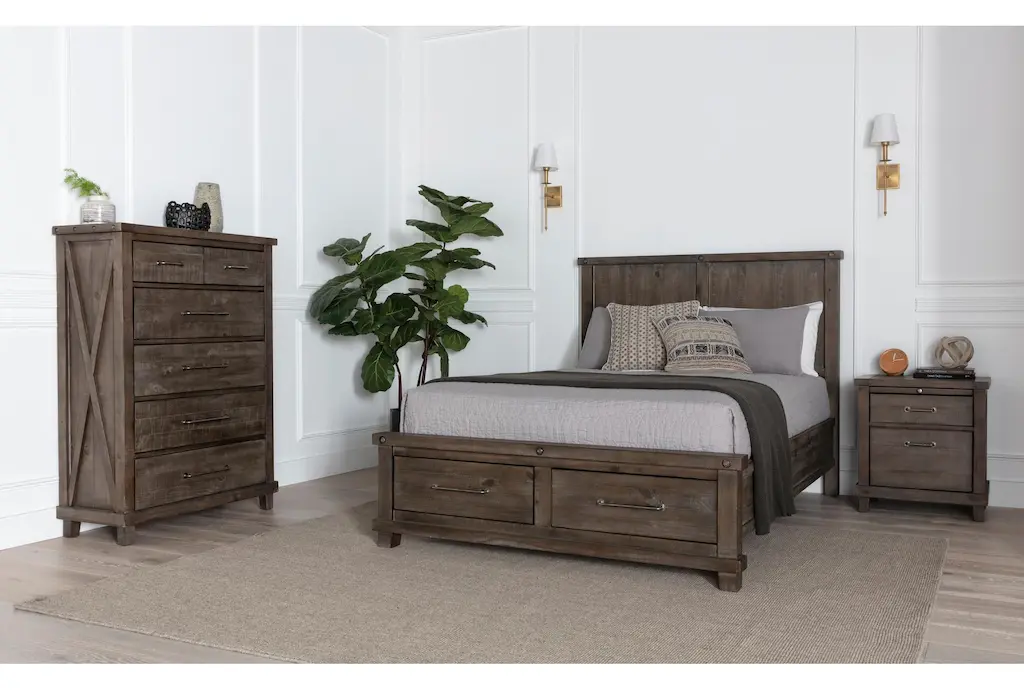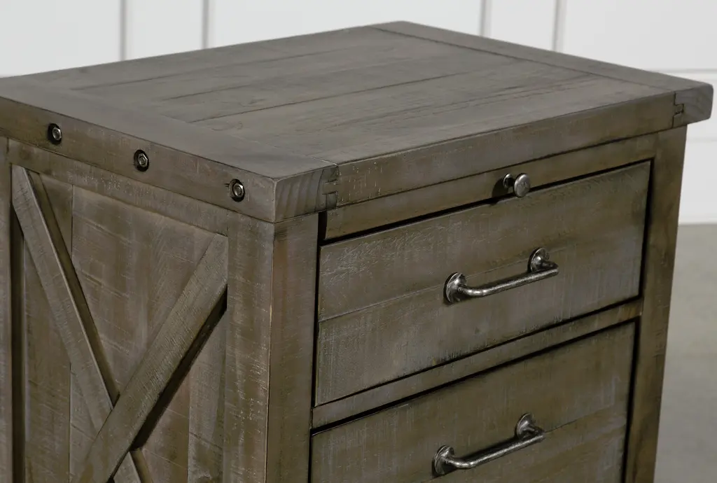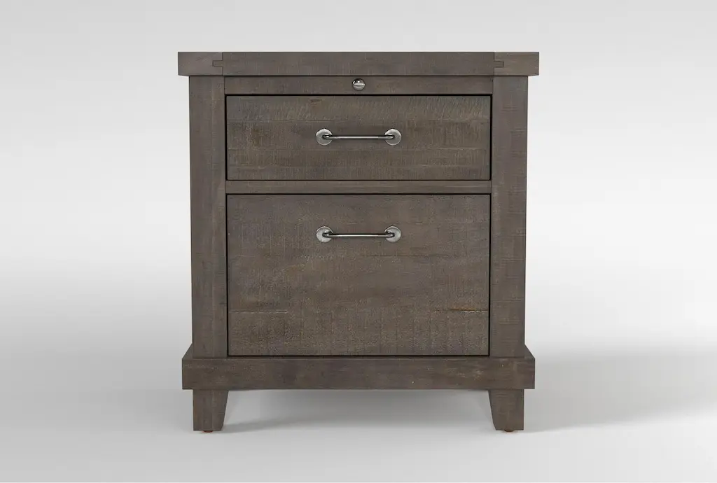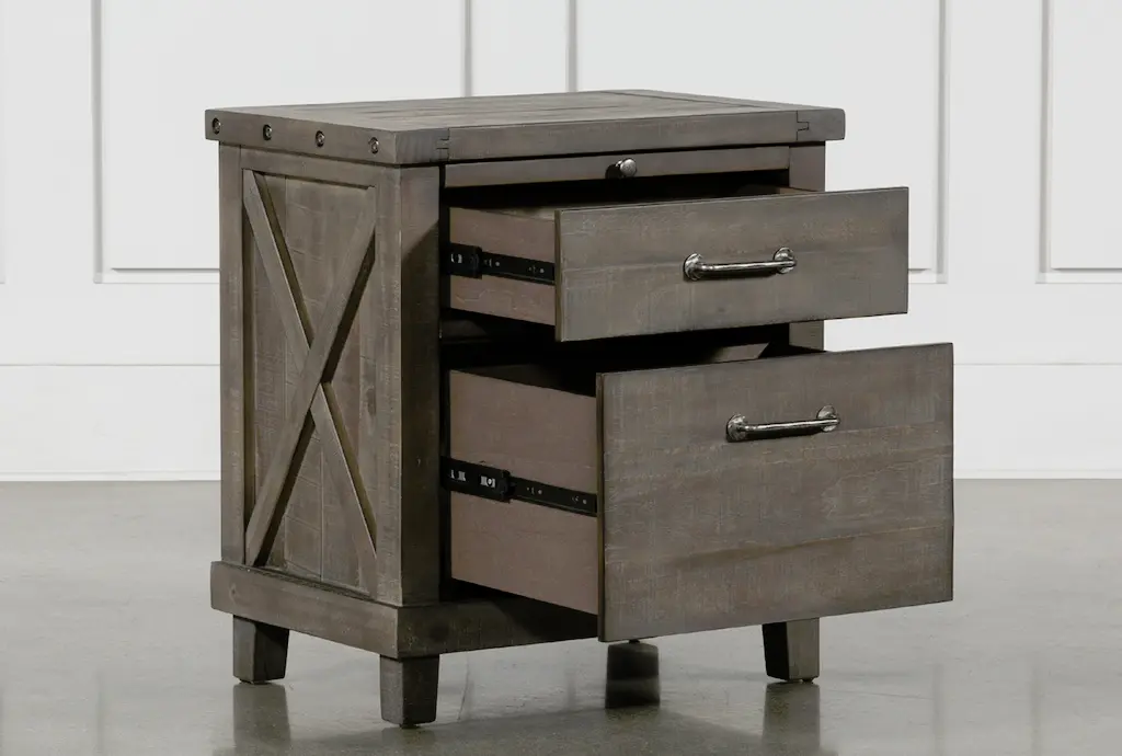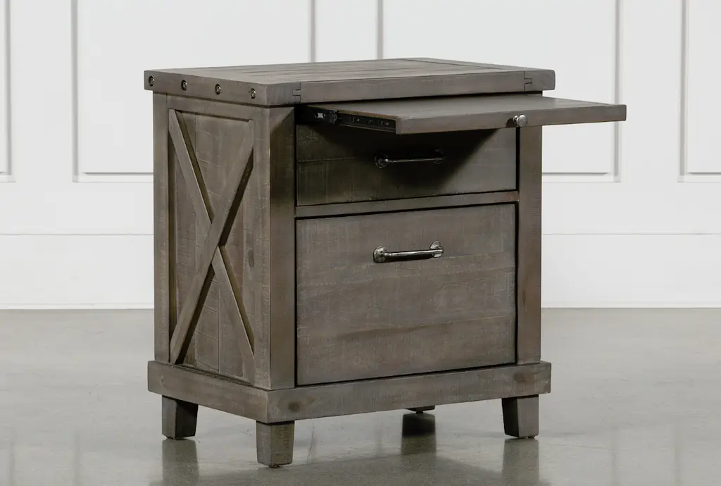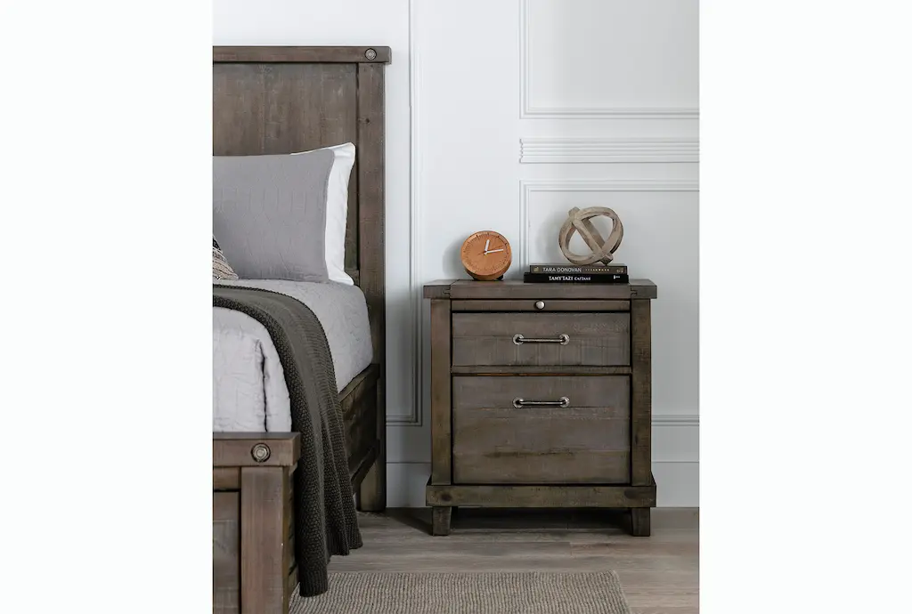 The Jaxon Grey Wood Tall 28" 2 Drawer Nightstand With USB is a stylish and functional addition to any bedroom. Its industrial design, complemented by aged grey solid pine construction, makes it a standout piece. The nightstand features ample storage with its two drawers and comes equipped with a convenient USB port for easy device charging.